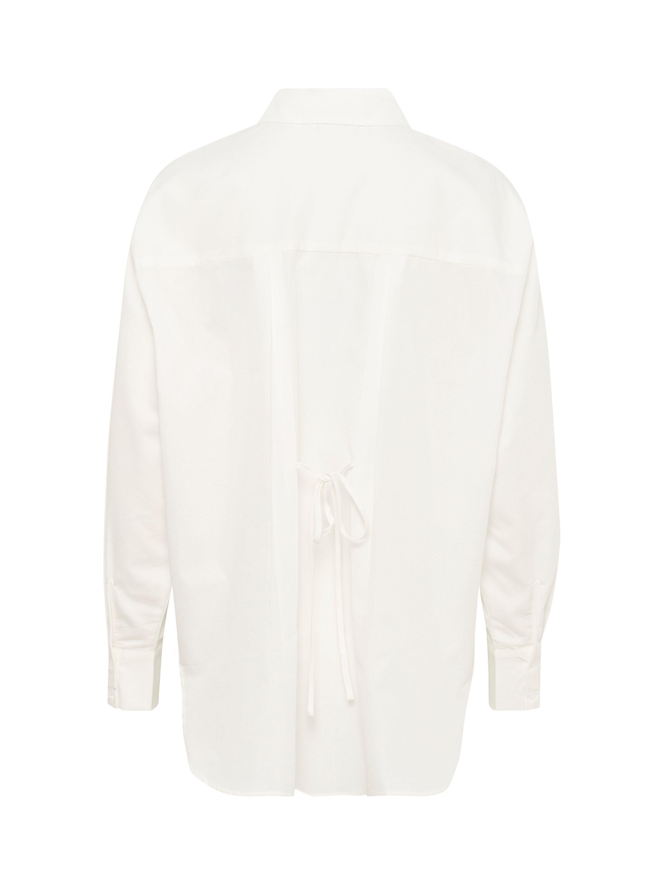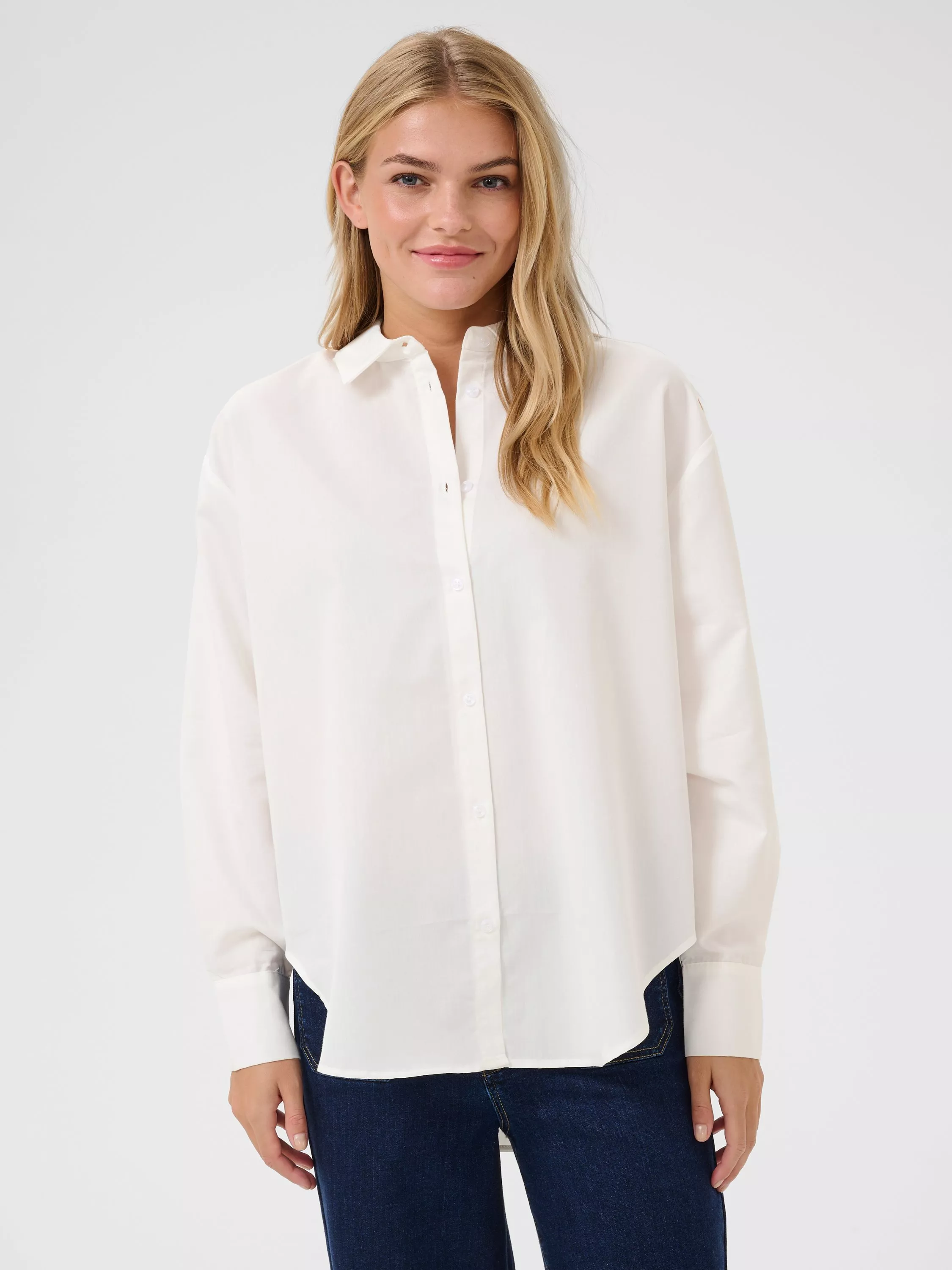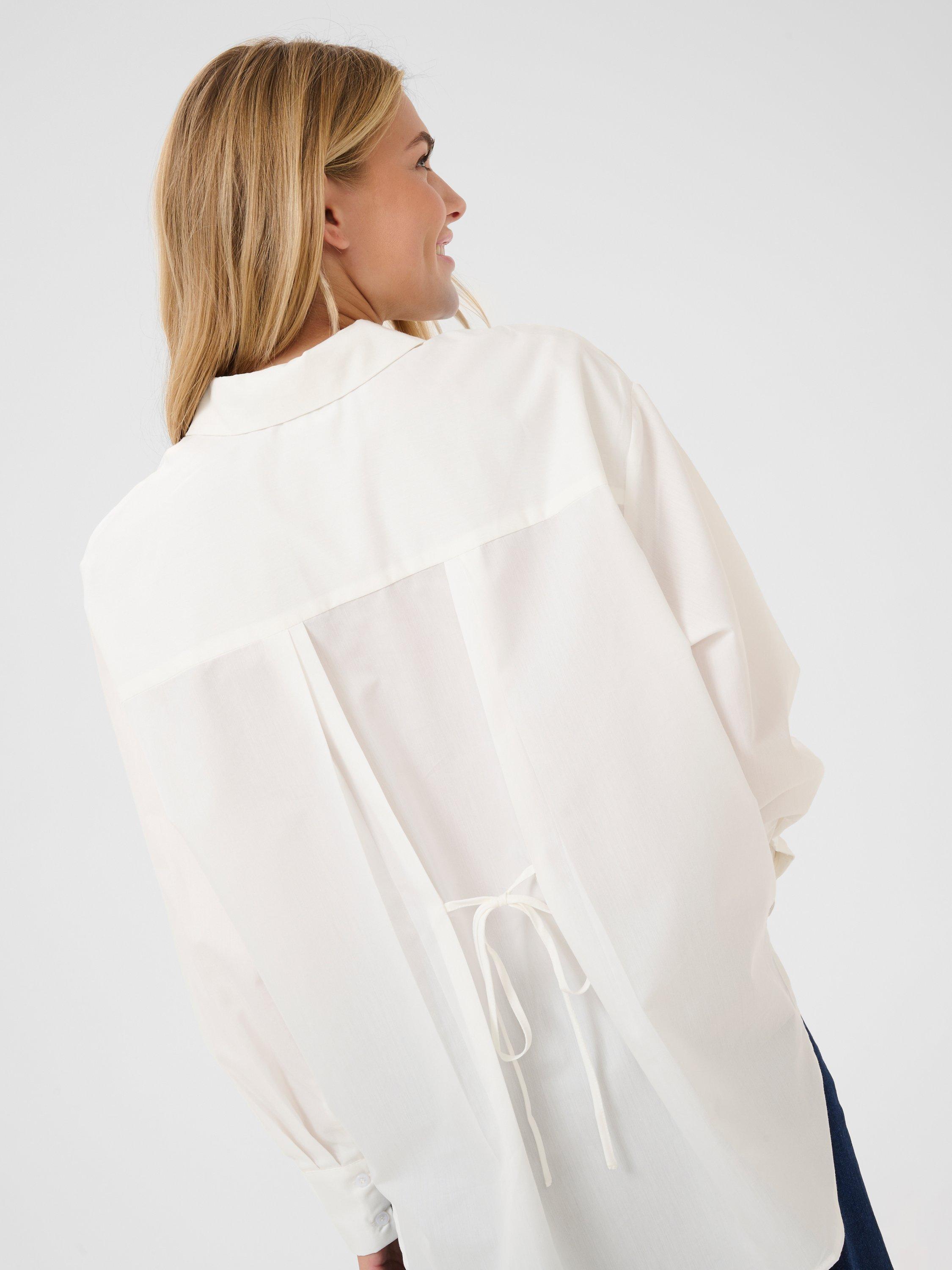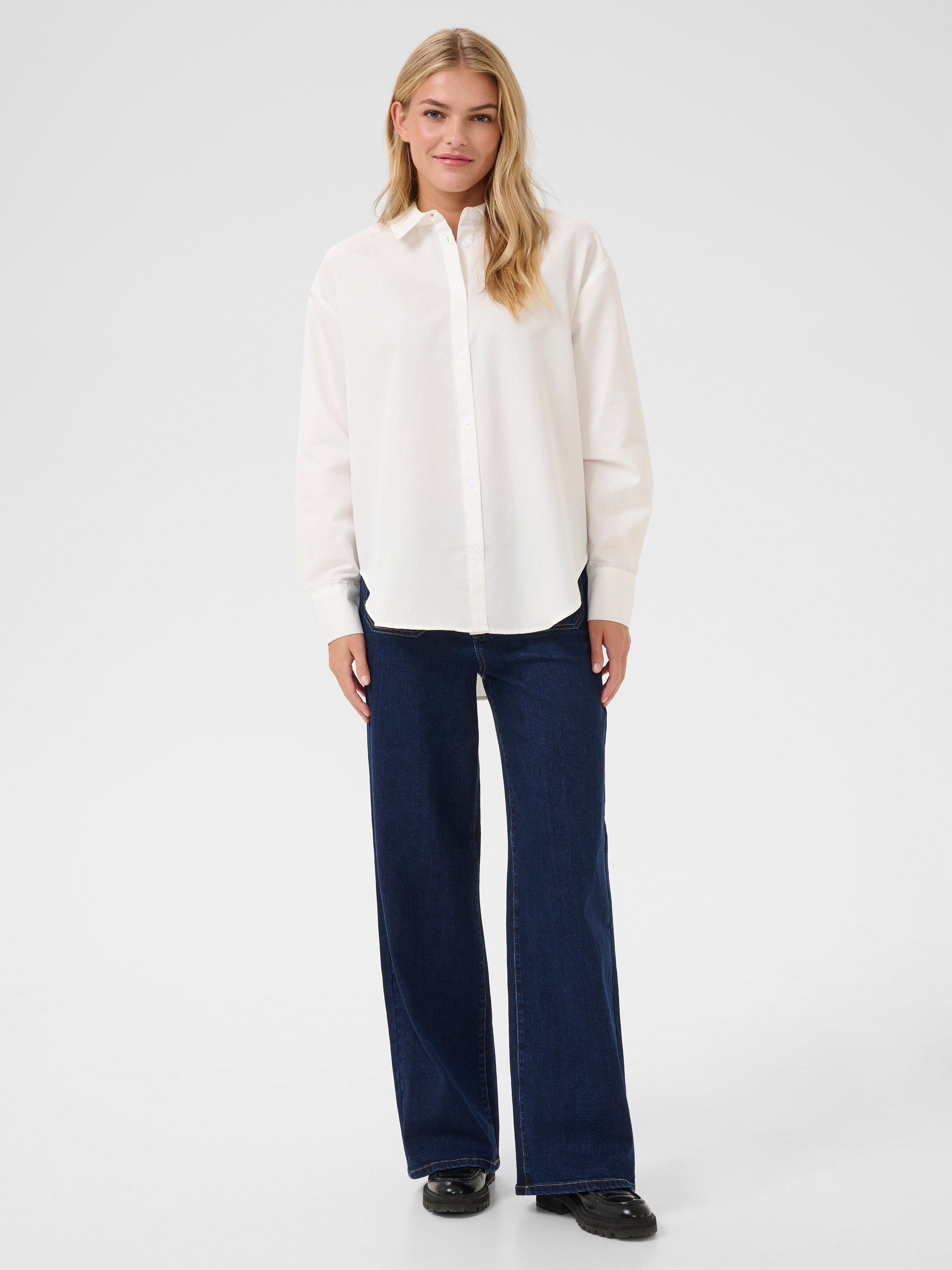 The selma shirt is a feminine version of the classic button up shirt. It has a spread collar and button fastening, and it has a casual fit with drop shoulders and a tying string at the waist. The sleeves are long and loose-fitting with buttoned cuffs, and the shirt has a rounded hem.