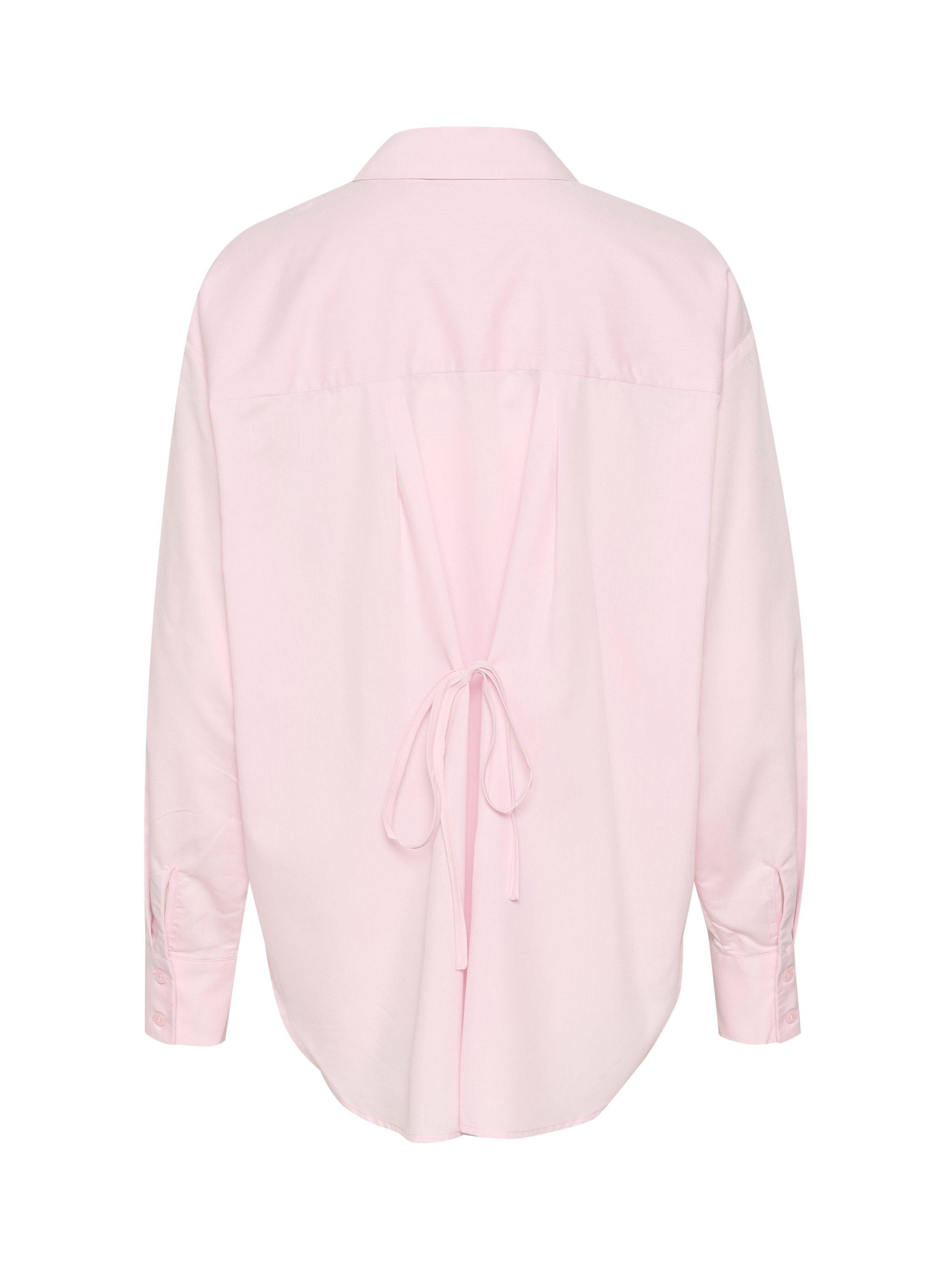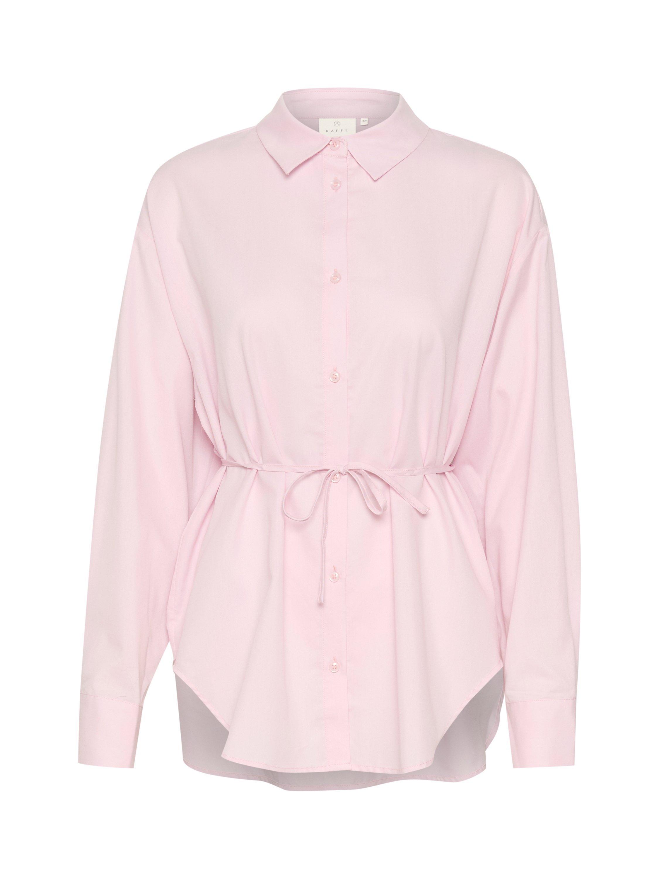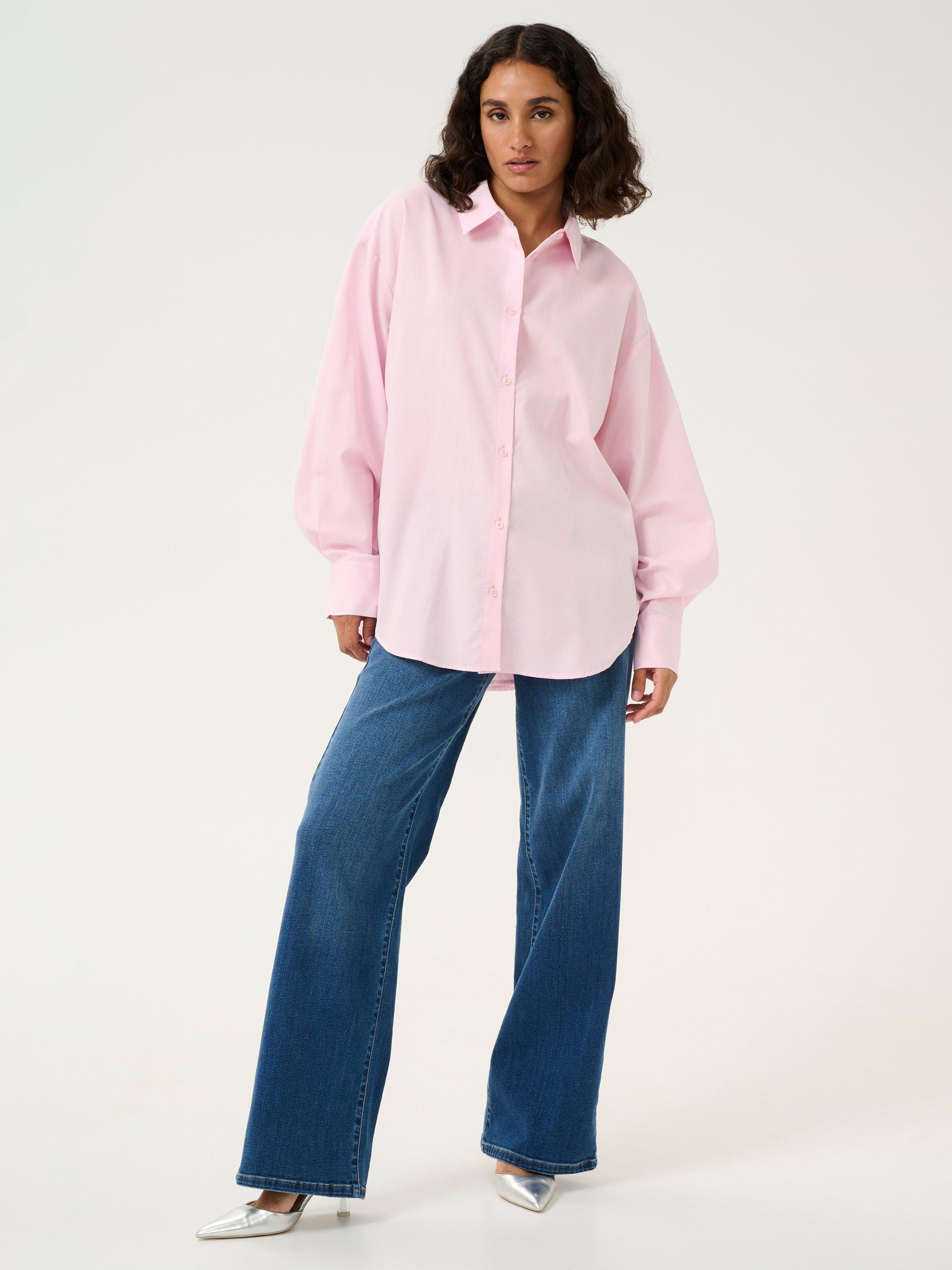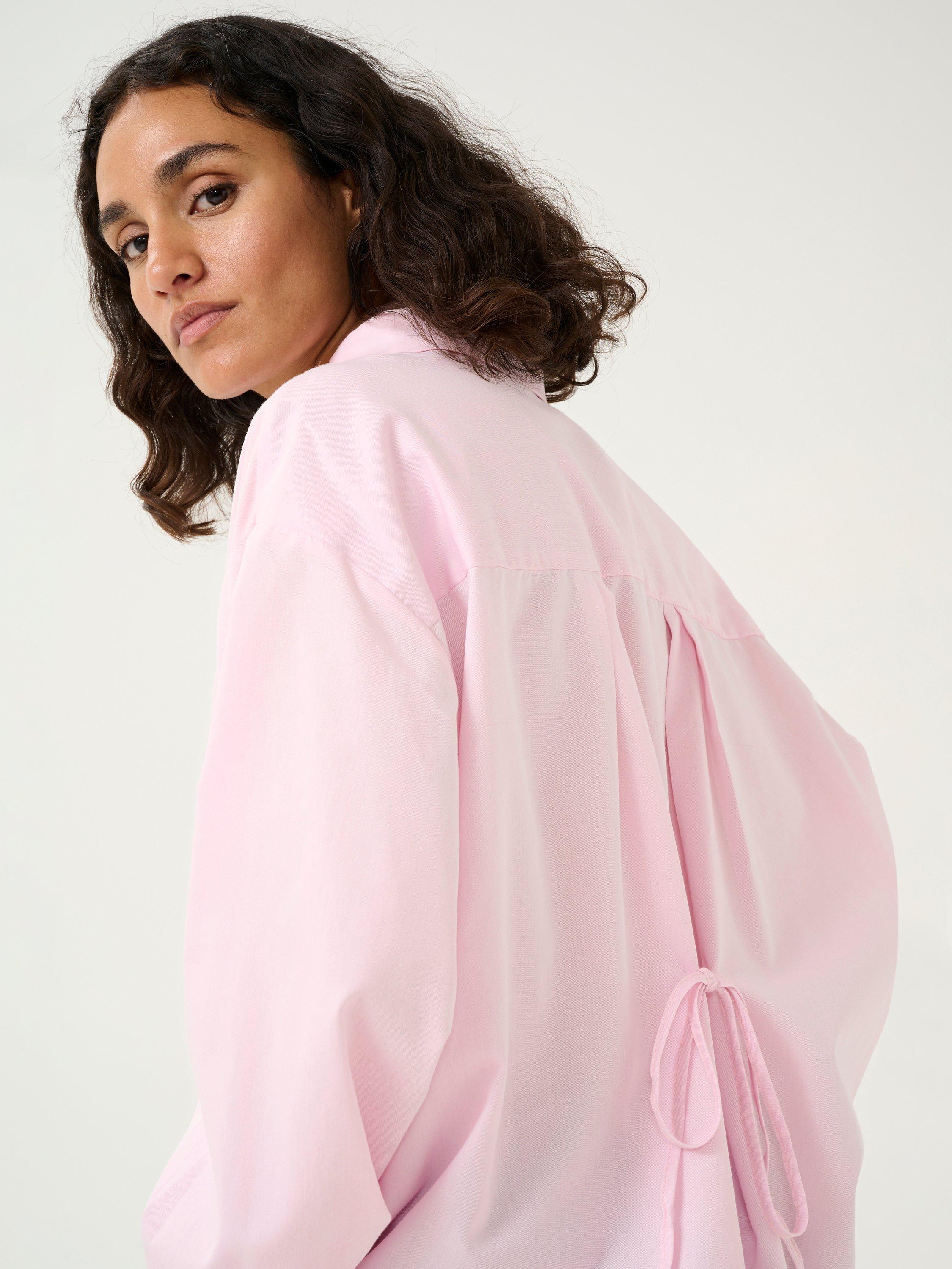 The selma shirt is a feminine version of the classic button up shirt. It has a spread collar and button fastening, and it has a casual fit with drop shoulders and a tying string at the waist. The sleeves are long and loose-fitting with buttoned cuffs, and the shirt has a rounded hem.