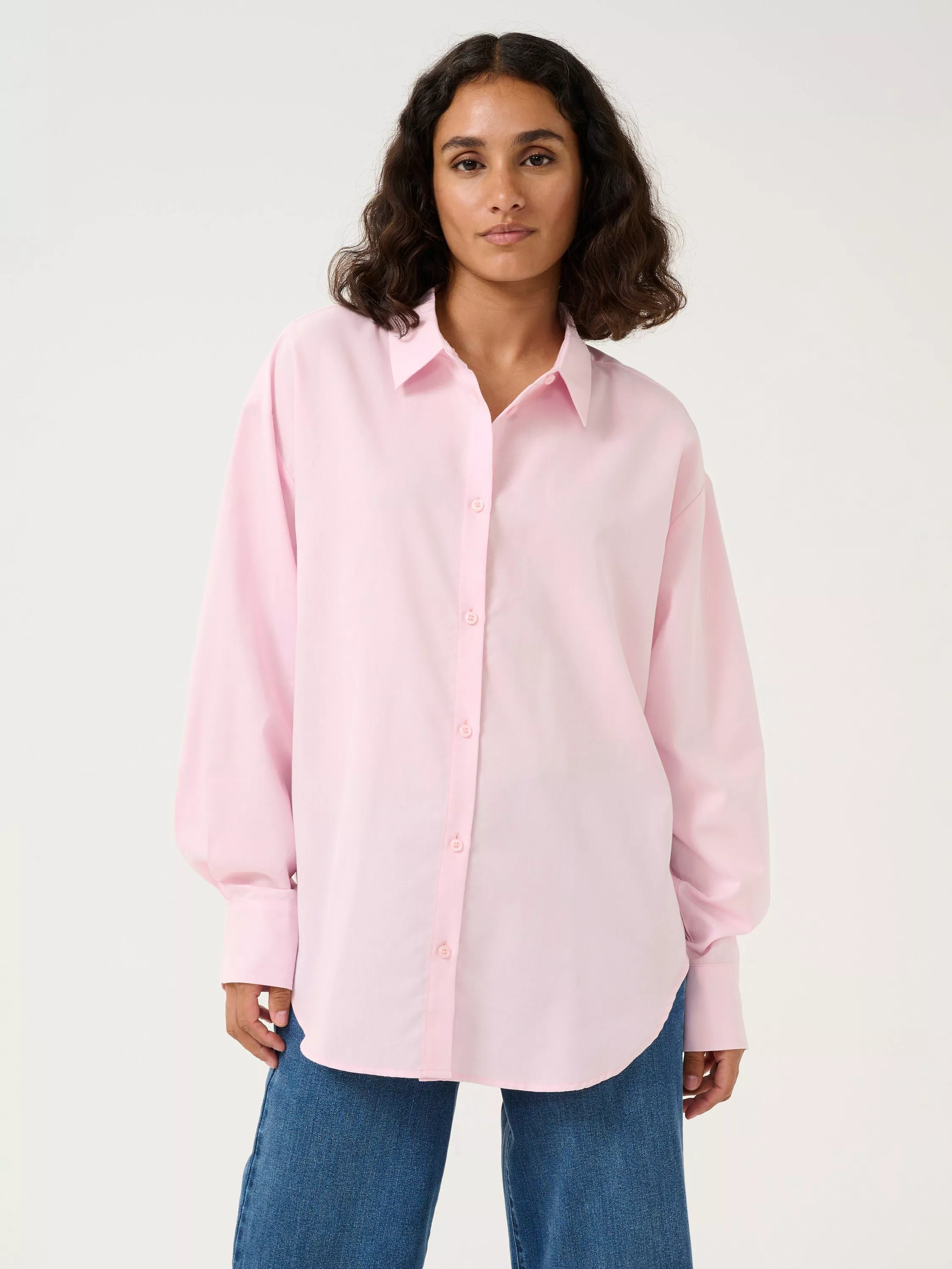 The selma shirt is a feminine version of the classic button up shirt. It has a spread collar and button fastening, and it has a casual fit with drop shoulders and a tying string at the waist. The sleeves are long and loose-fitting with buttoned cuffs, and the shirt has a rounded hem.