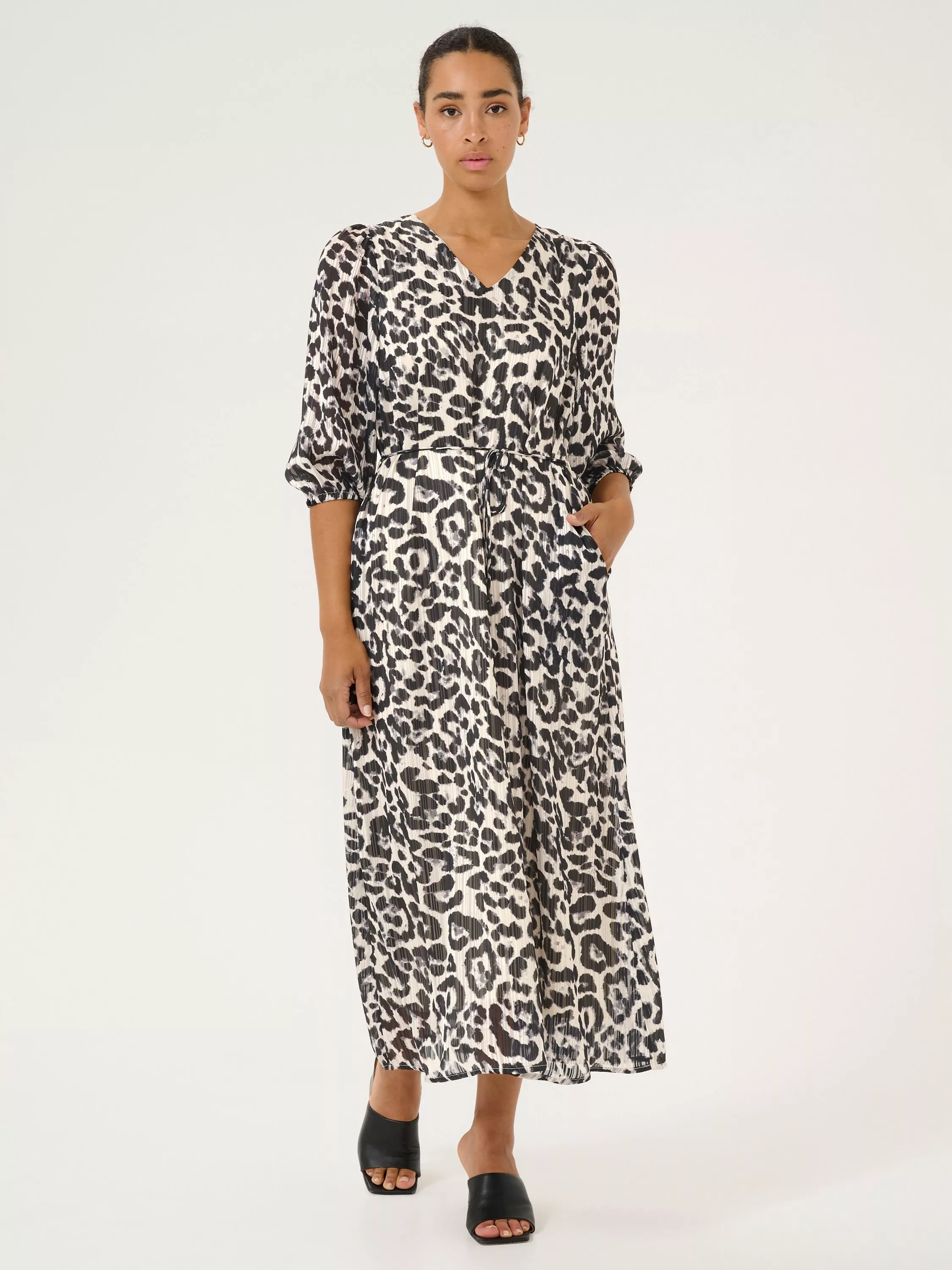 The sepia maxi dress is a casual style in a bold print. It has a V-neck and a relaxed fit, and it has a narrow tying belt and seamed side pockets. The sleeves are 3/4 length raglan sleeves with a loose fit, and the dress is cut below the calves.
