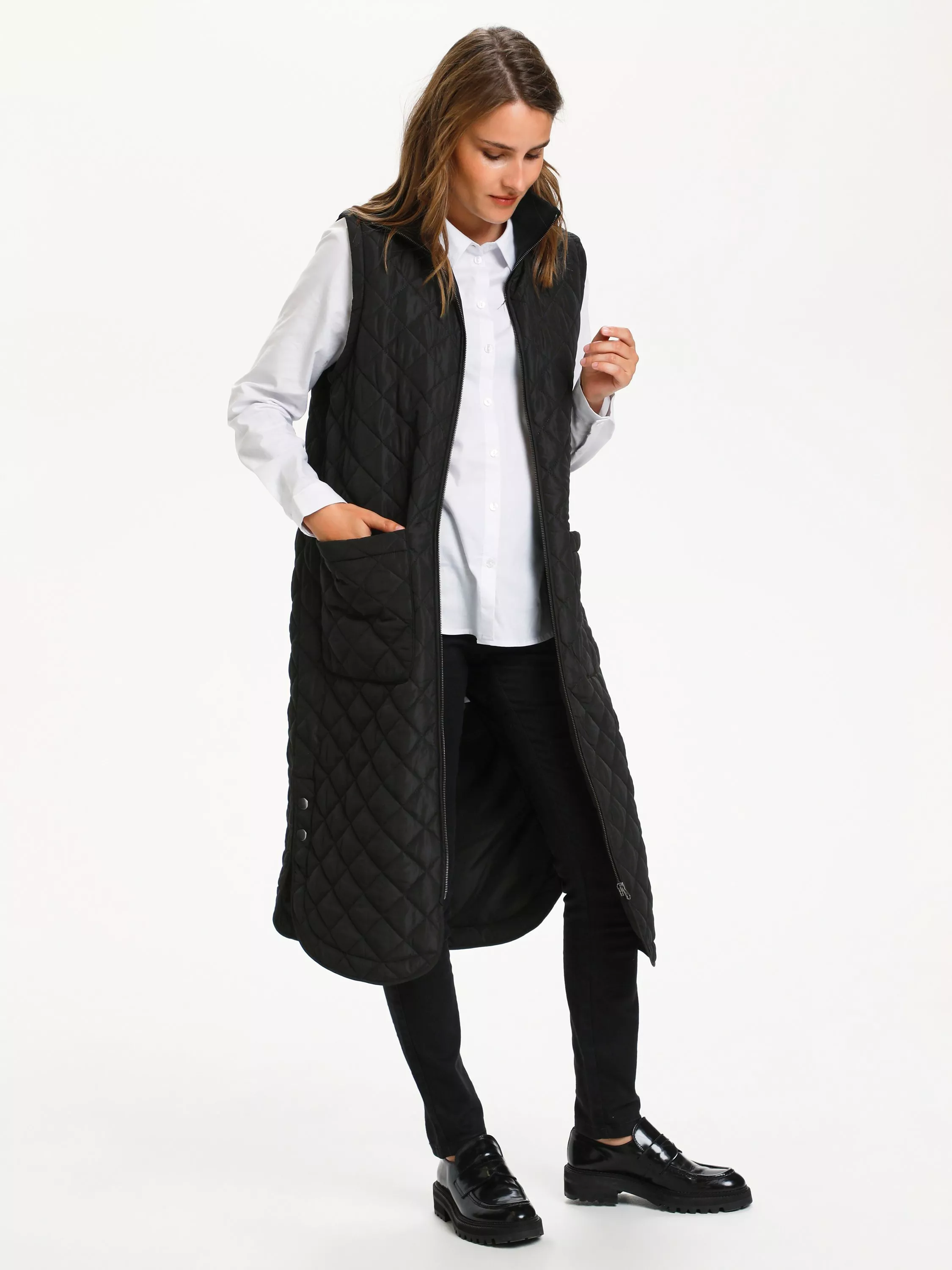 A lighter layer for transseasonal weather, this gilet from KAFFE elongates your profile with its longline cut.