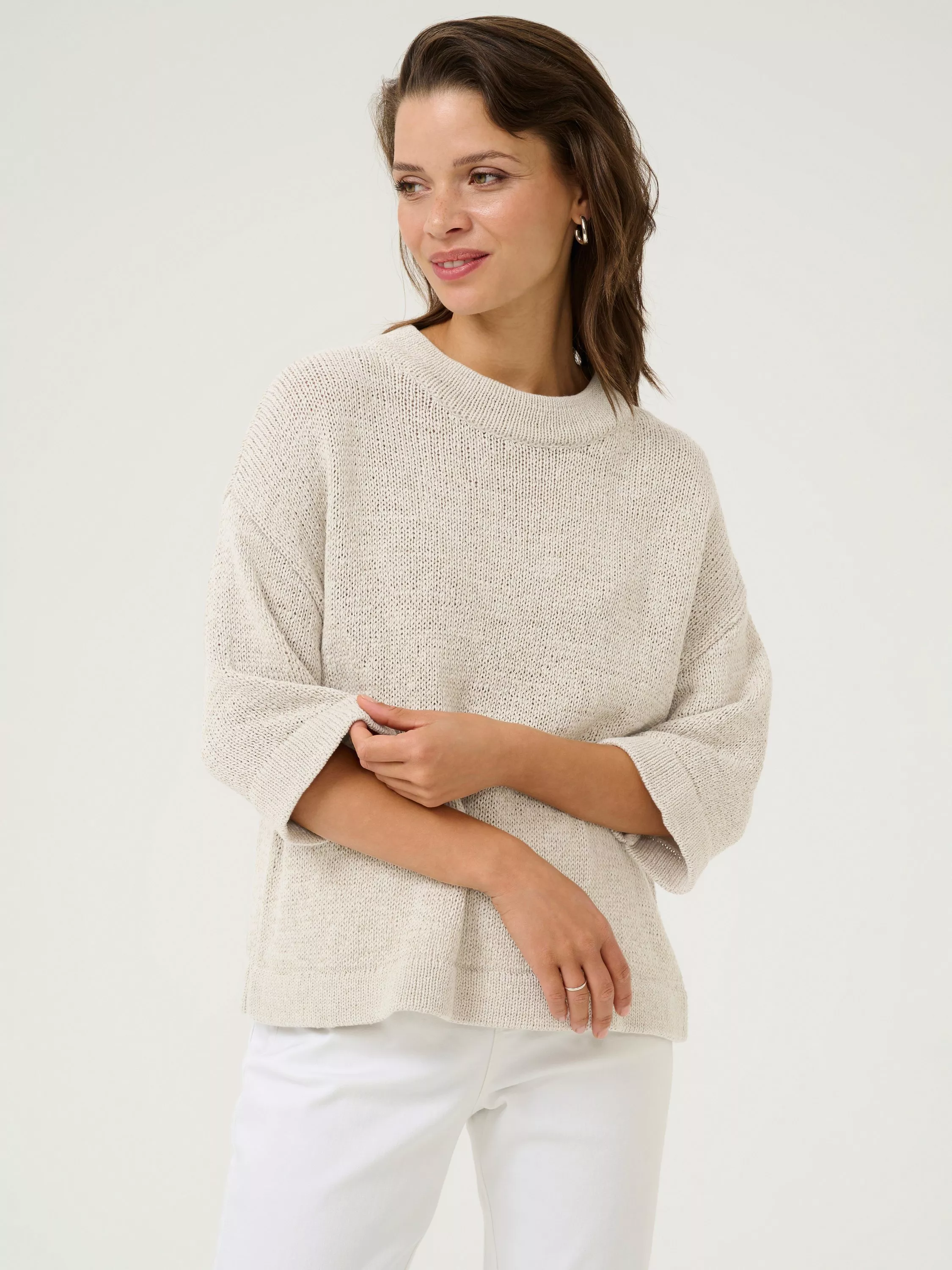 Cut with a round neck and three quarter length sleeves, this mid-weight jumper from KAFFE comes in a super-soft cotton-blend with a moonstruck shade.
