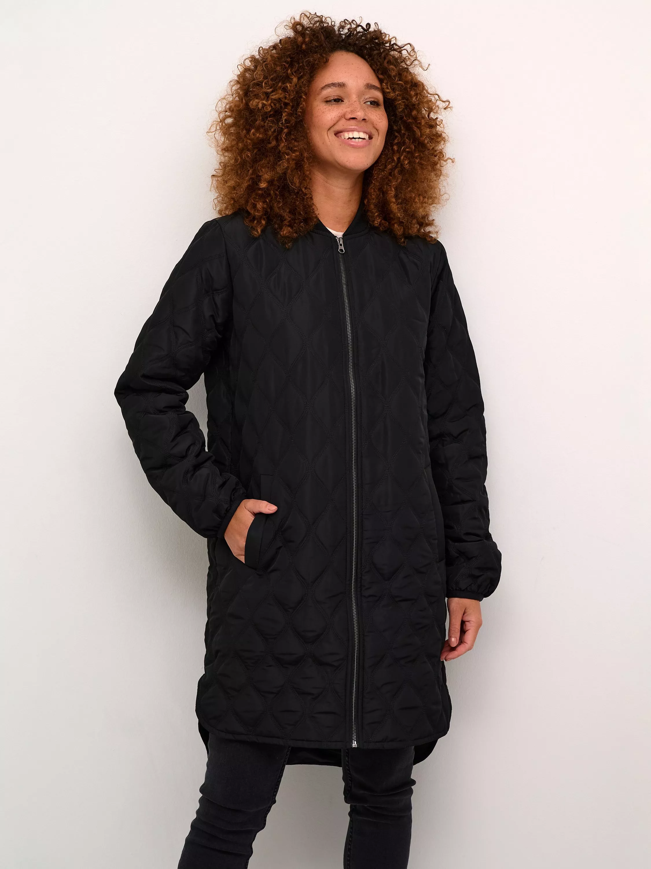 The shalli coat is a casual piece of outerwear, that is quilted in a lovely, lantern-shaped pattern. It has a rib collar and zipper fastening, and it has a casual fit. The sleeves are long with a narrow cuff, and the coat has slanted front pockets, is cut at the mid-thigh and has a rounded split hem.