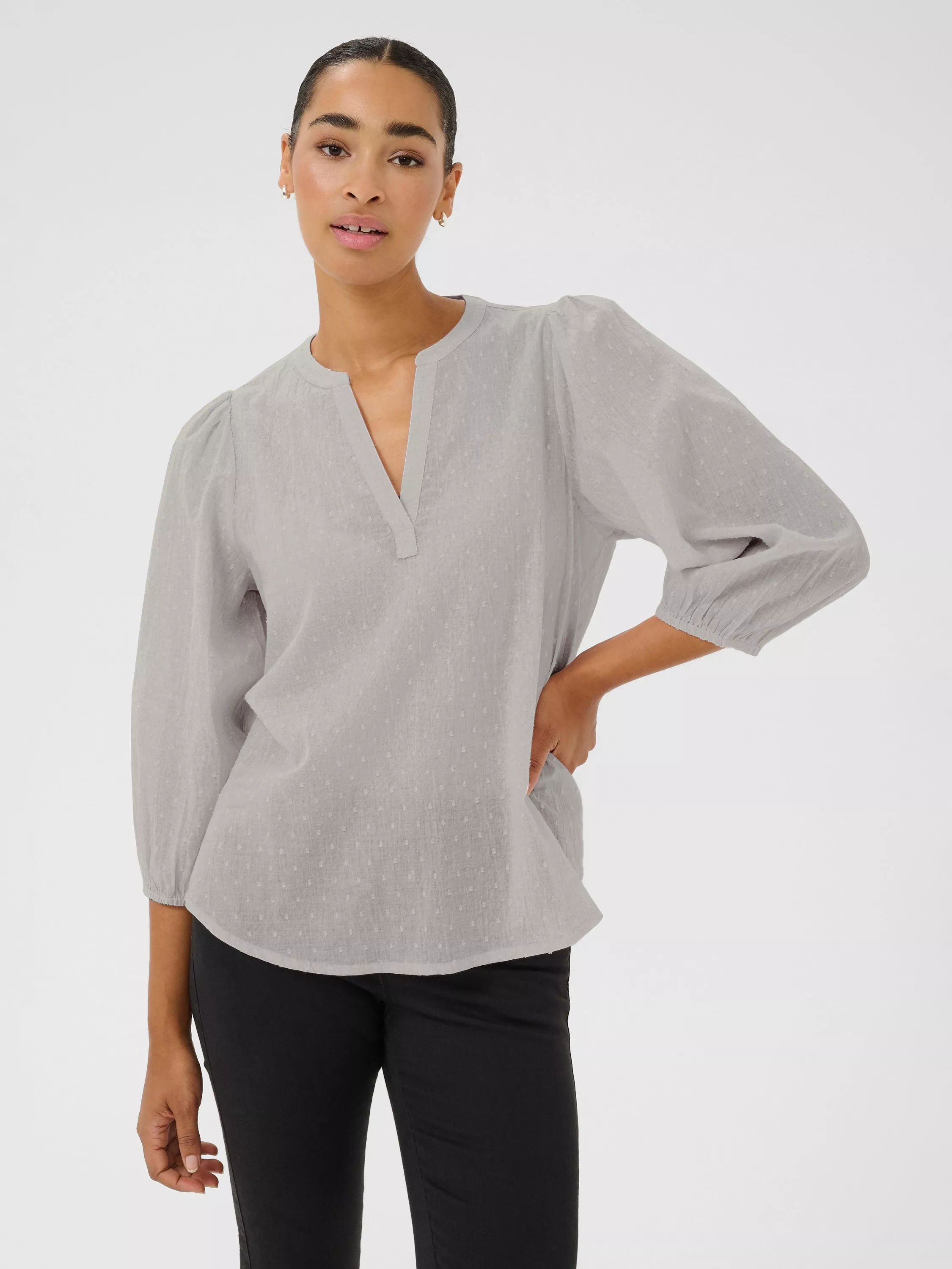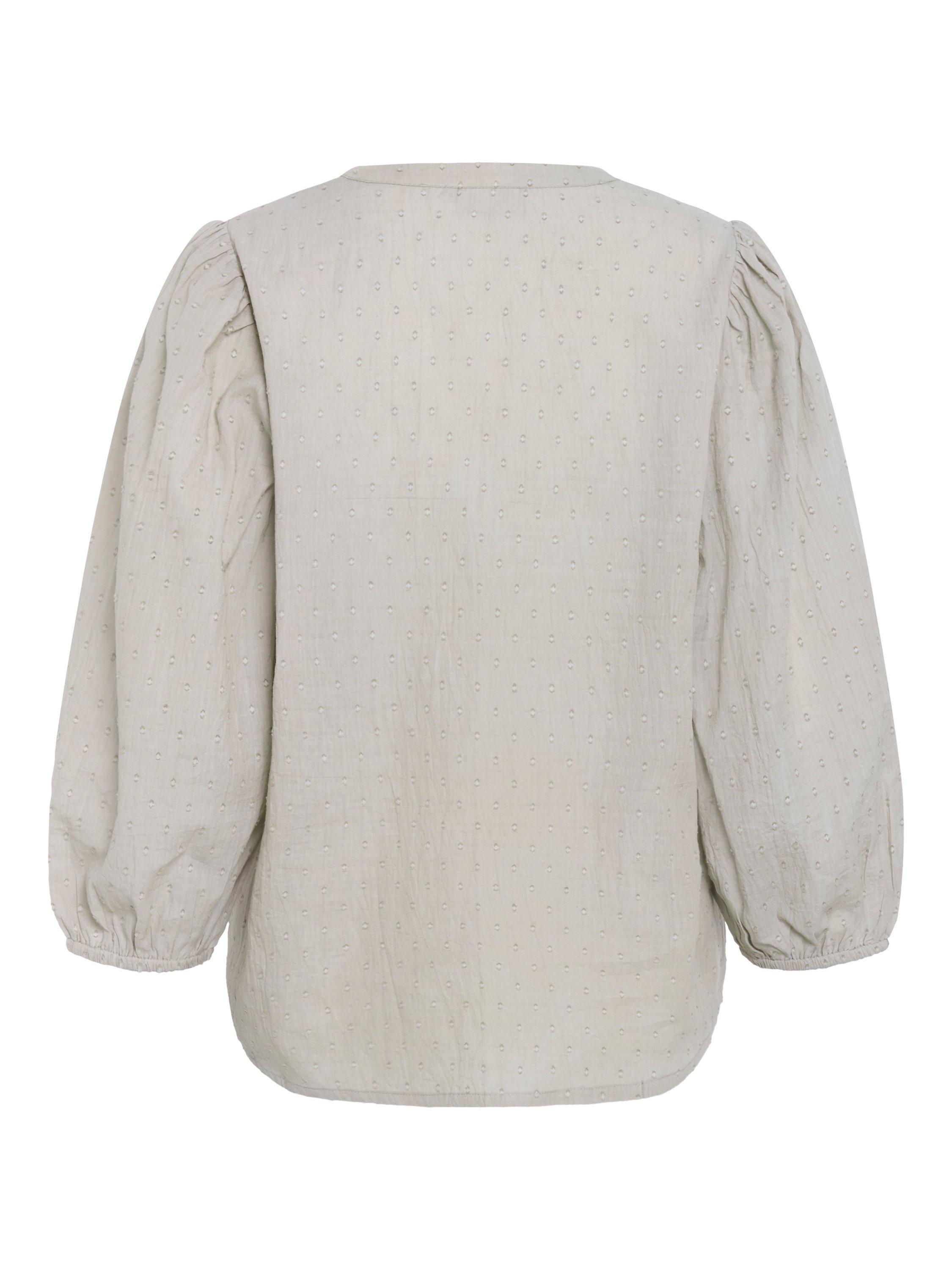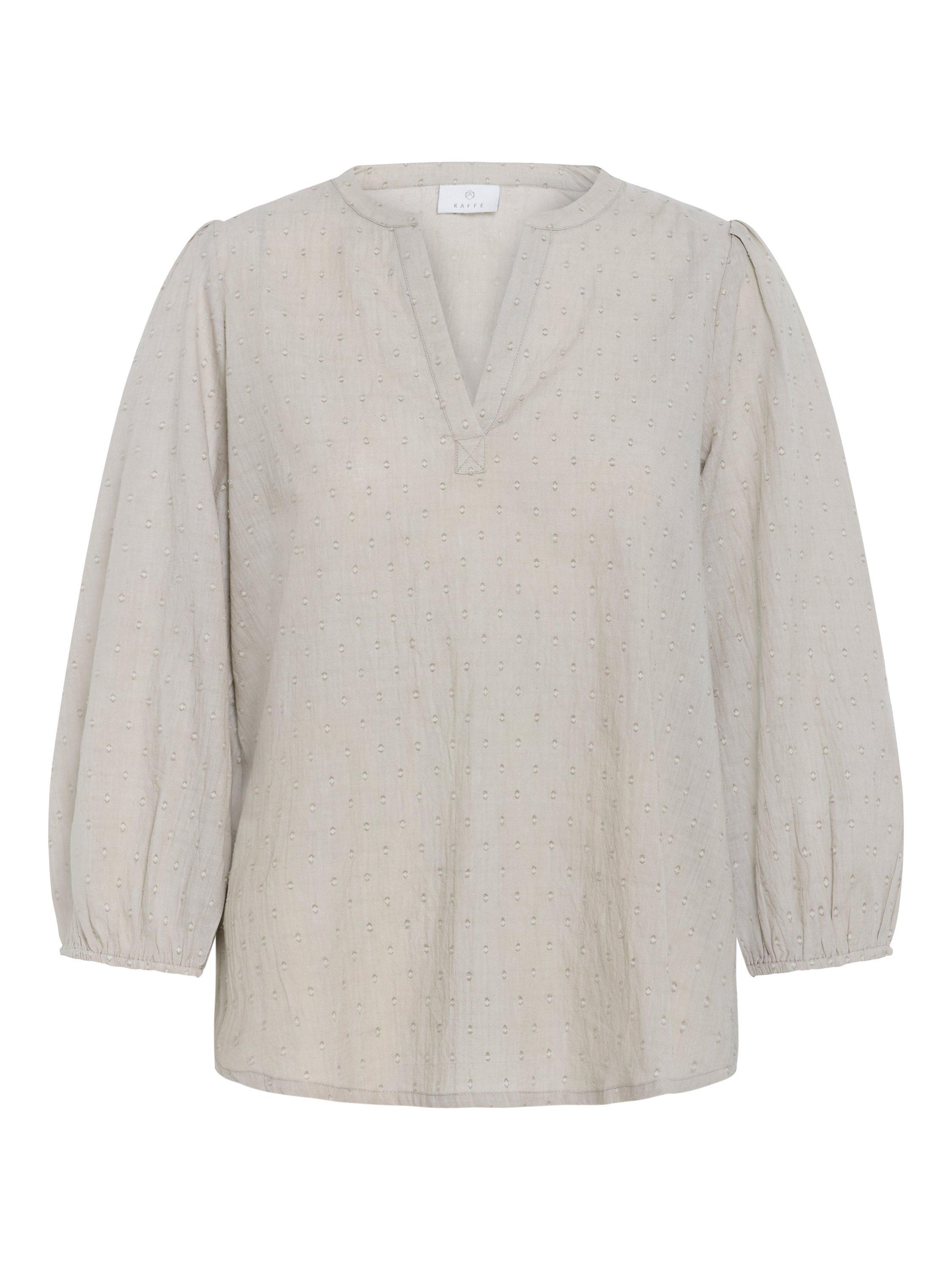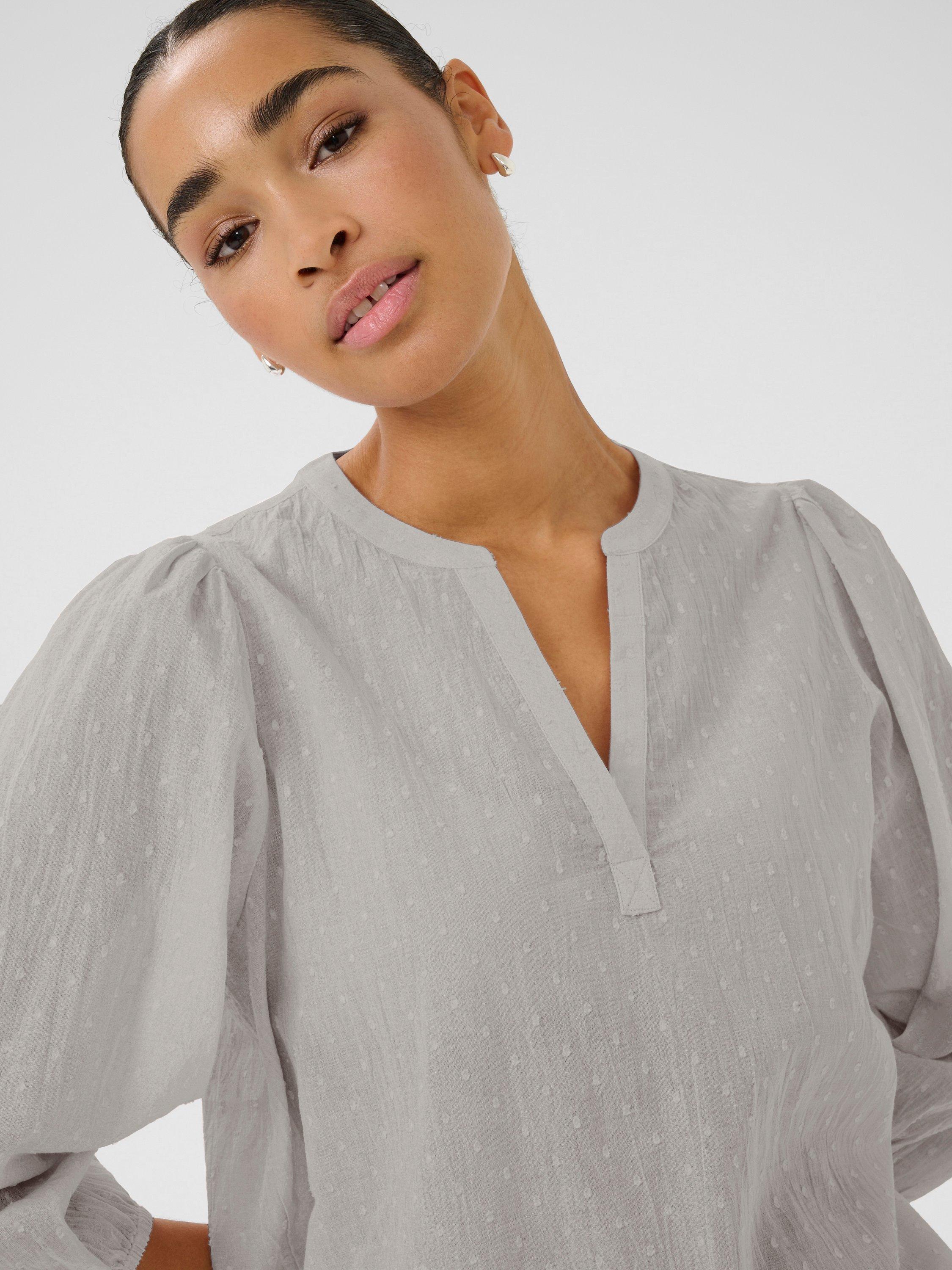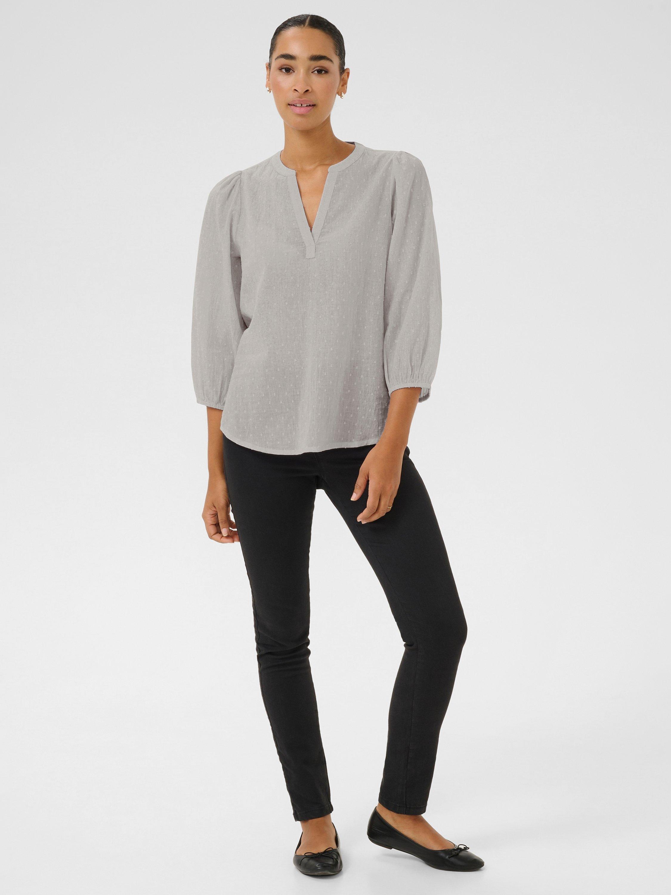 The silja blouse is a soft top that will look great with both trousers, jeans, and a skirt. It has a narrow and deep V-notch neck with a band collar, and it has a regular fit. The sleeves are 3/4 length balloon sleeves, and they are gathered in an elastic edge.
