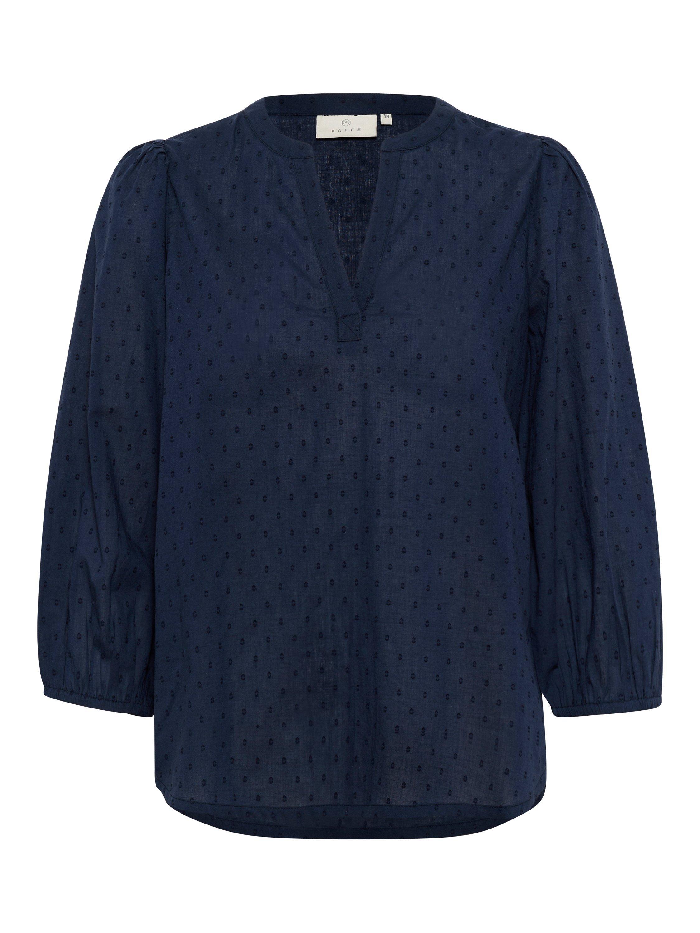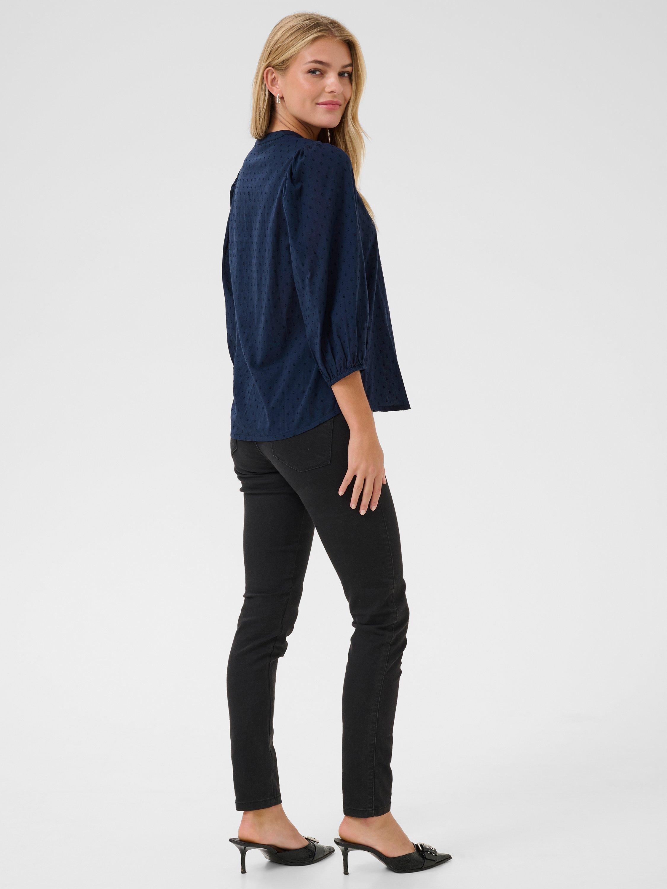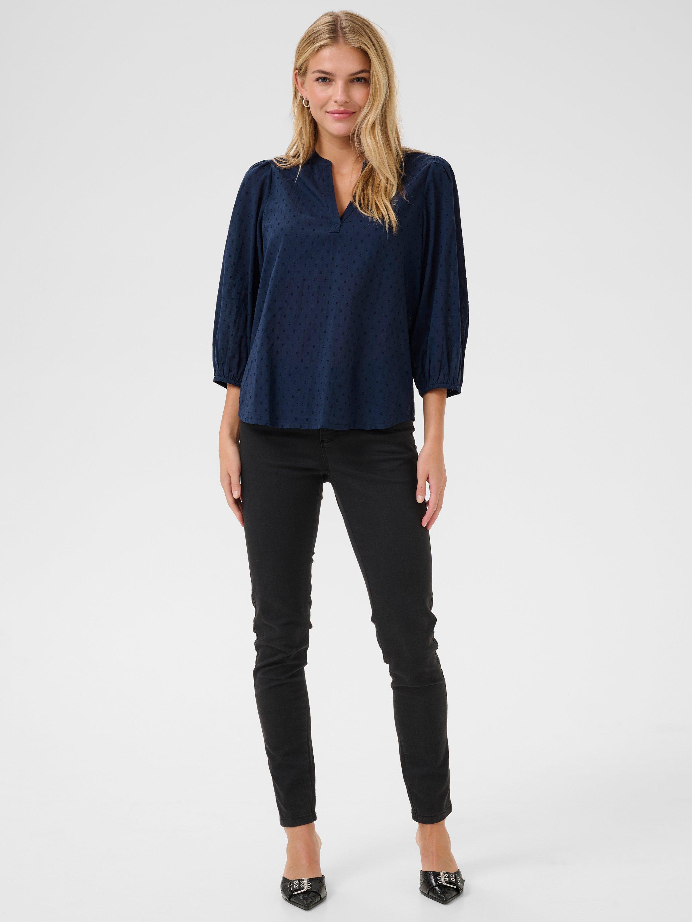 The silja blouse is a soft top that will look great with both trousers, jeans, and a skirt. It has a narrow and deep V-notch neck with a band collar, and it has a regular fit. The sleeves are 3/4 length balloon sleeves, and they are gathered in an elastic edge.