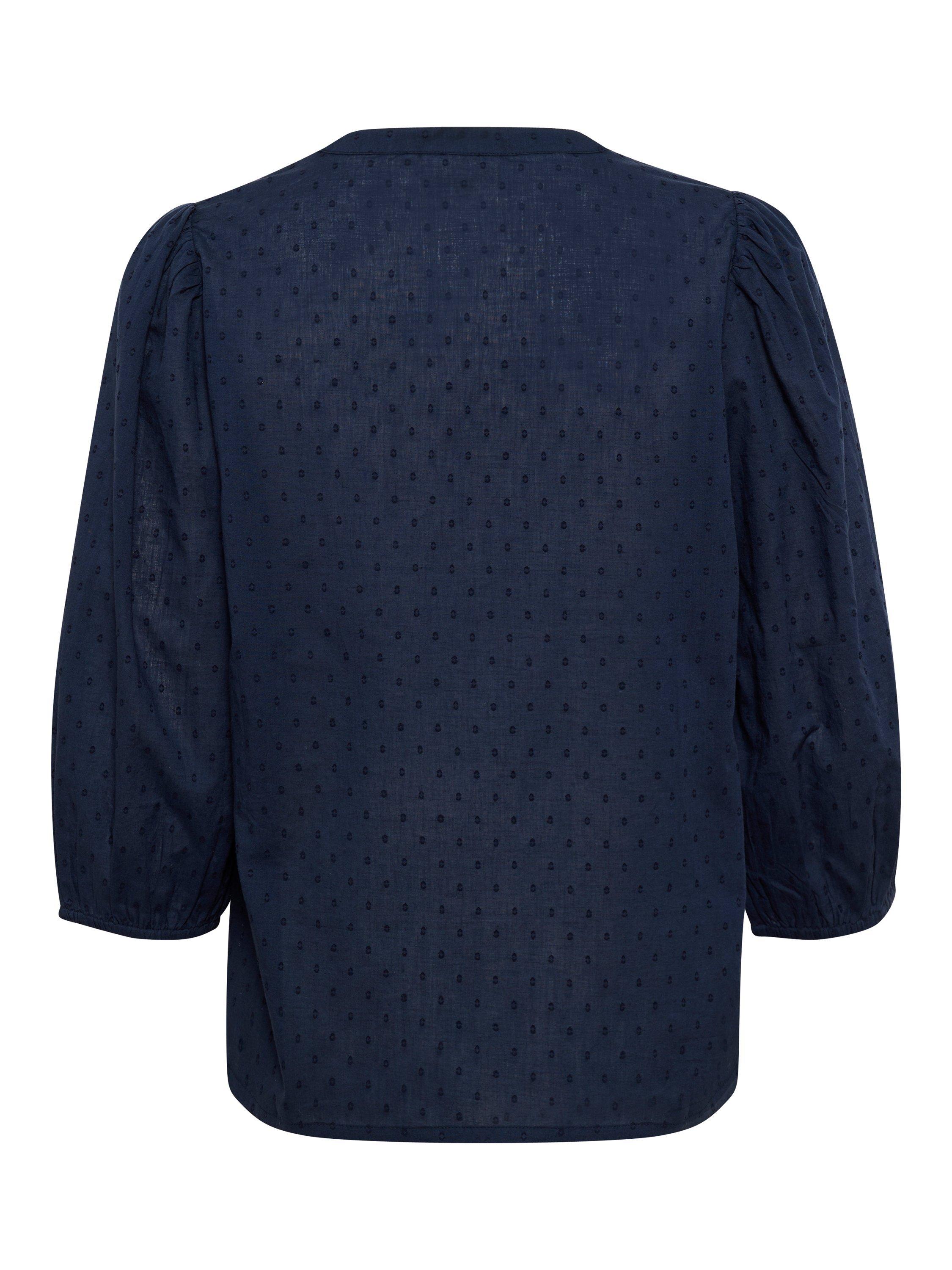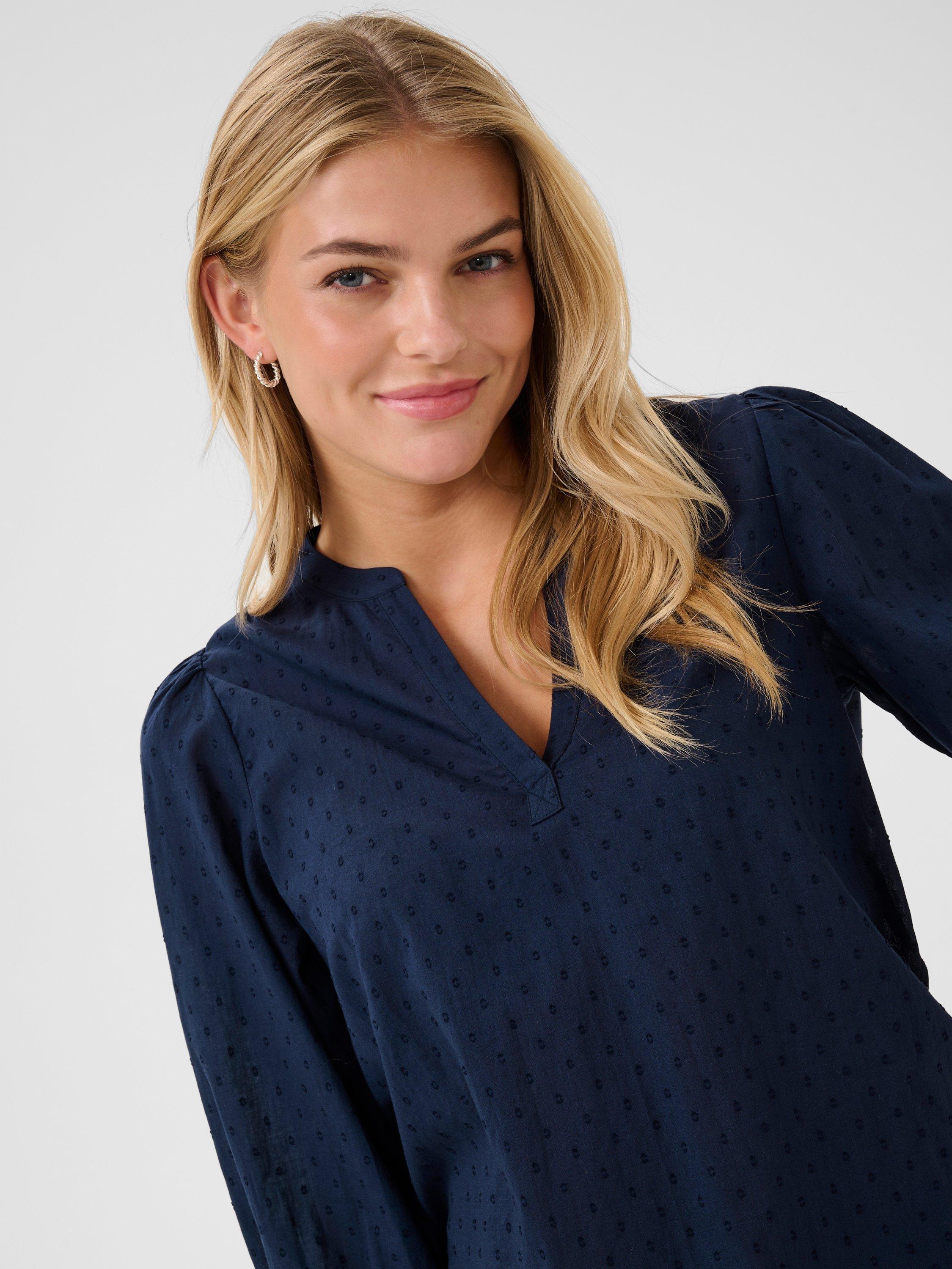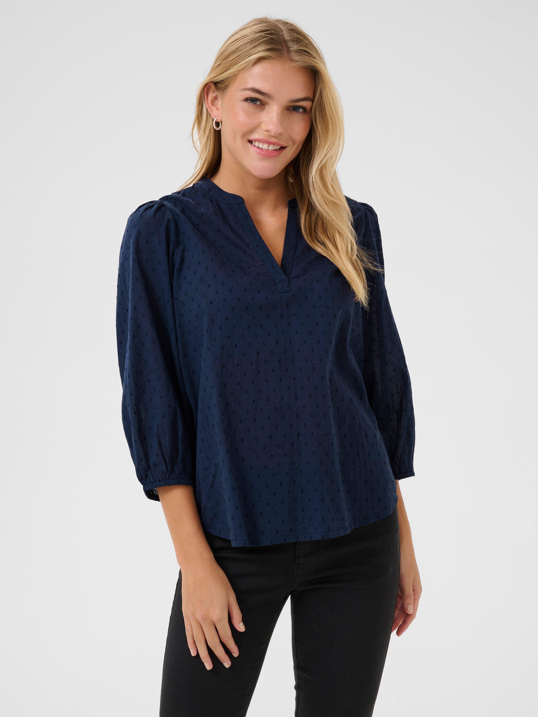 The silja blouse is a soft top that will look great with both trousers, jeans, and a skirt. It has a narrow and deep V-notch neck with a band collar, and it has a regular fit. The sleeves are 3/4 length balloon sleeves, and they are gathered in an elastic edge.