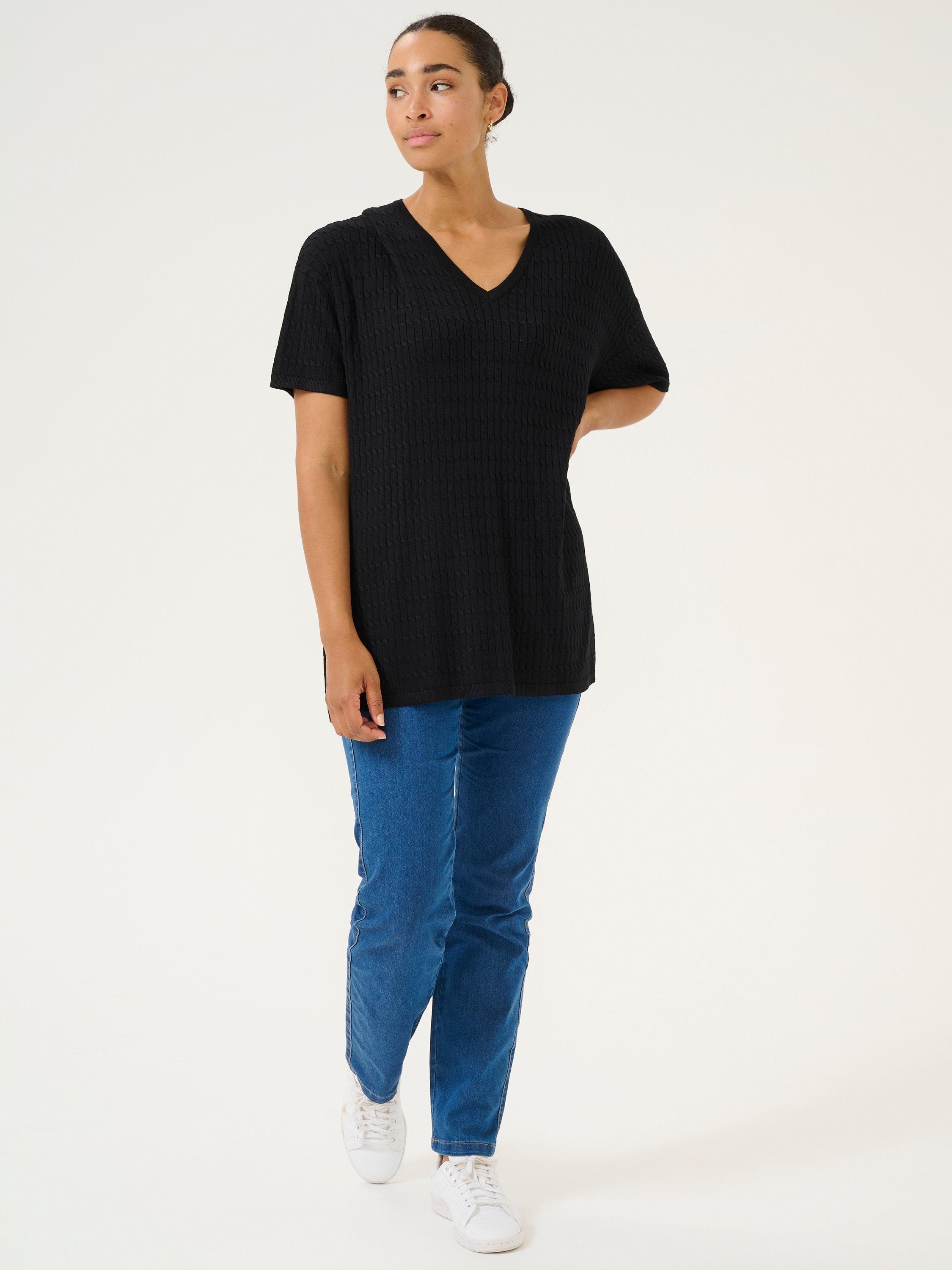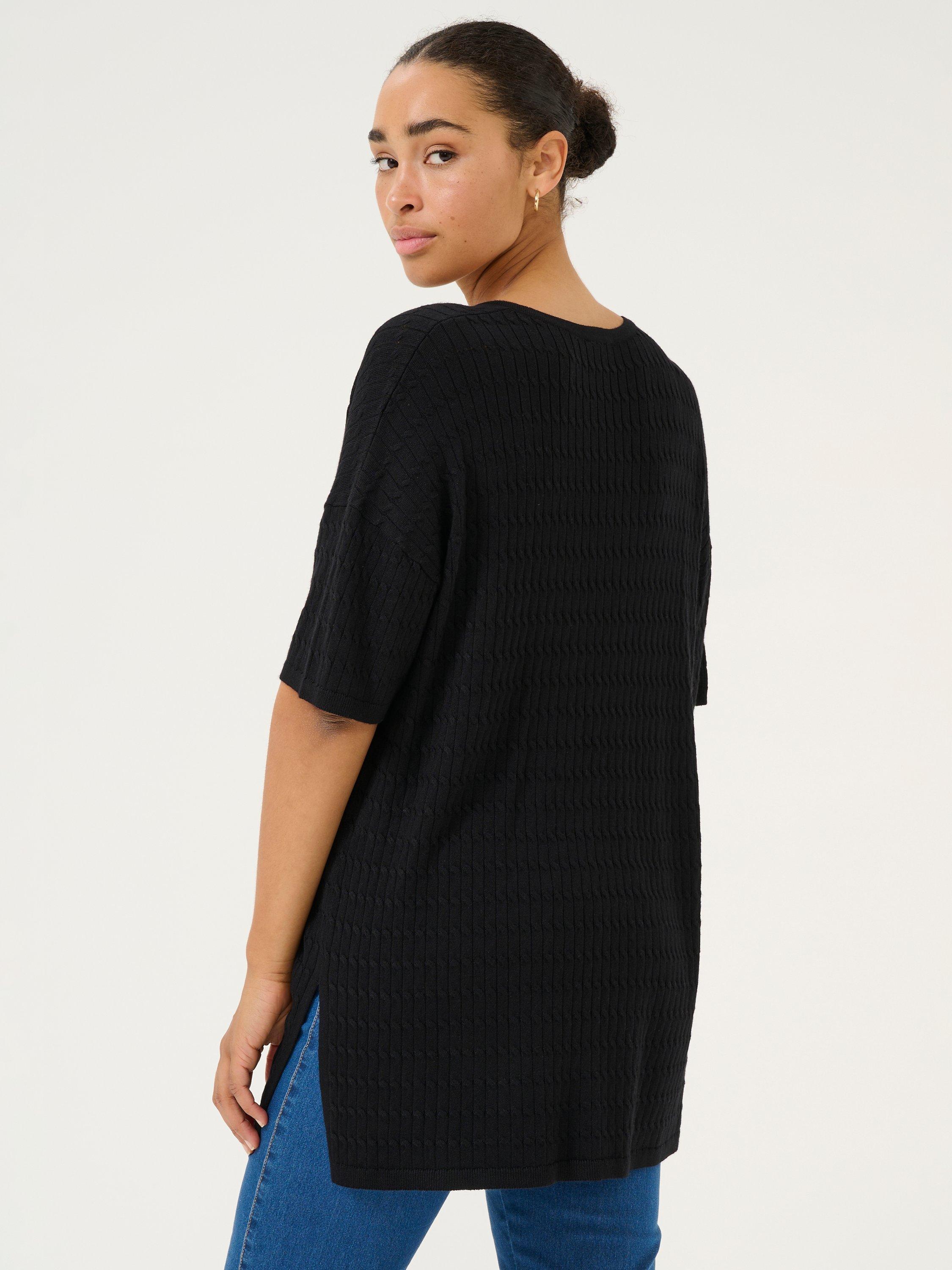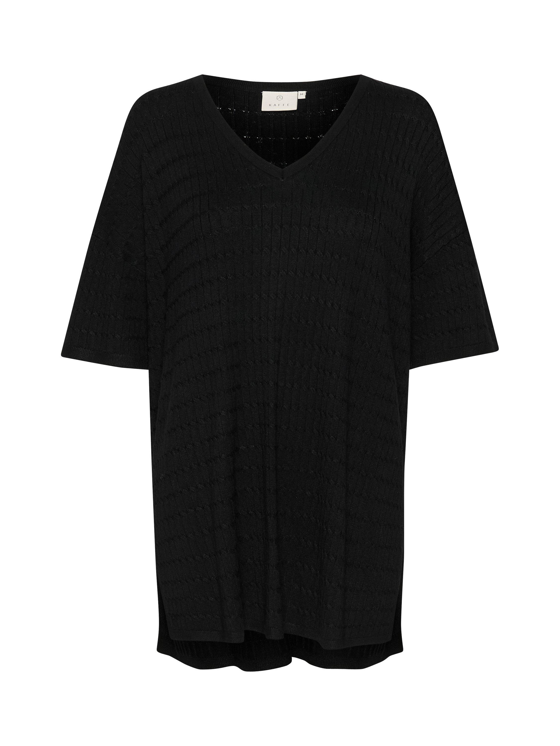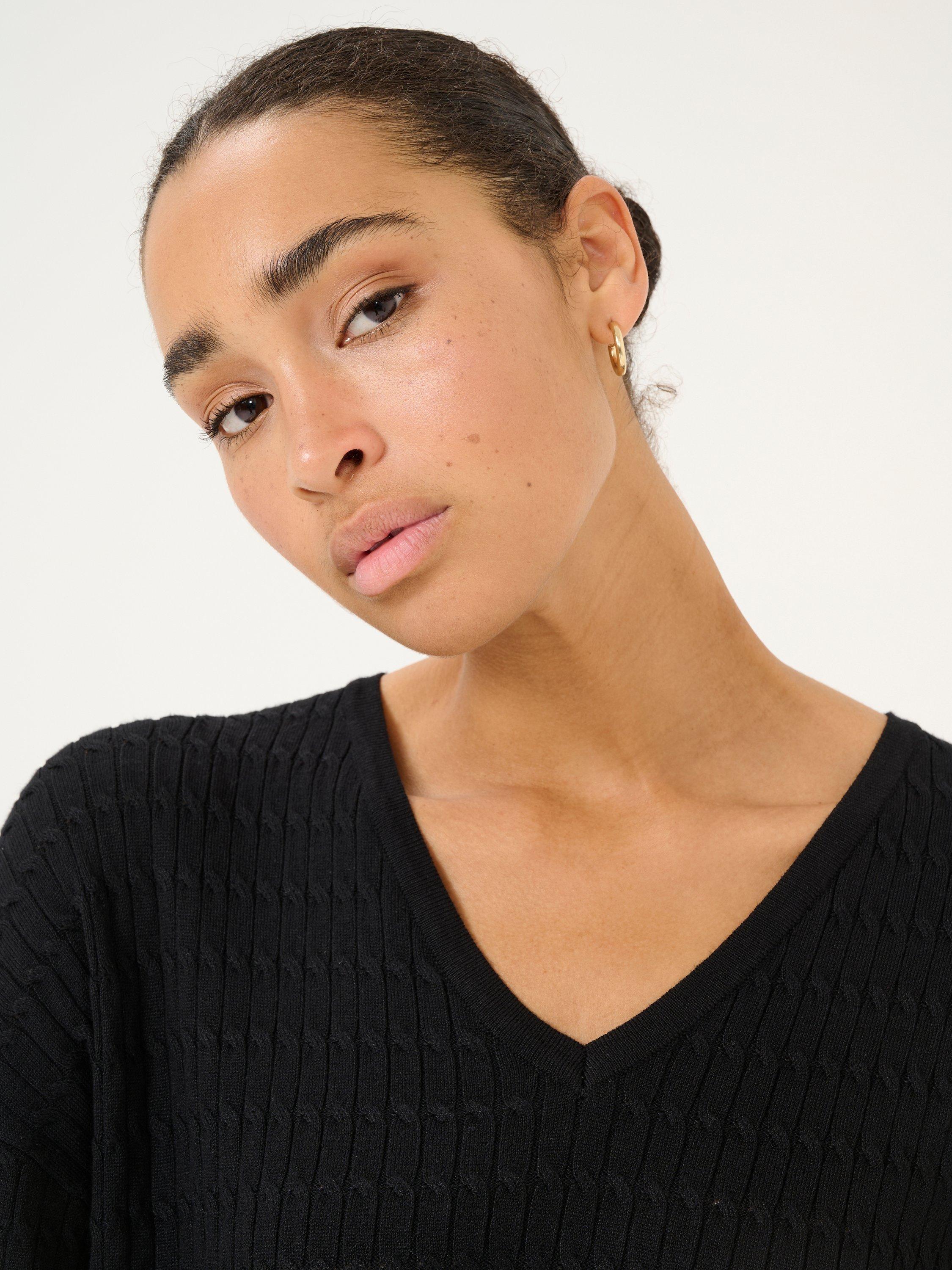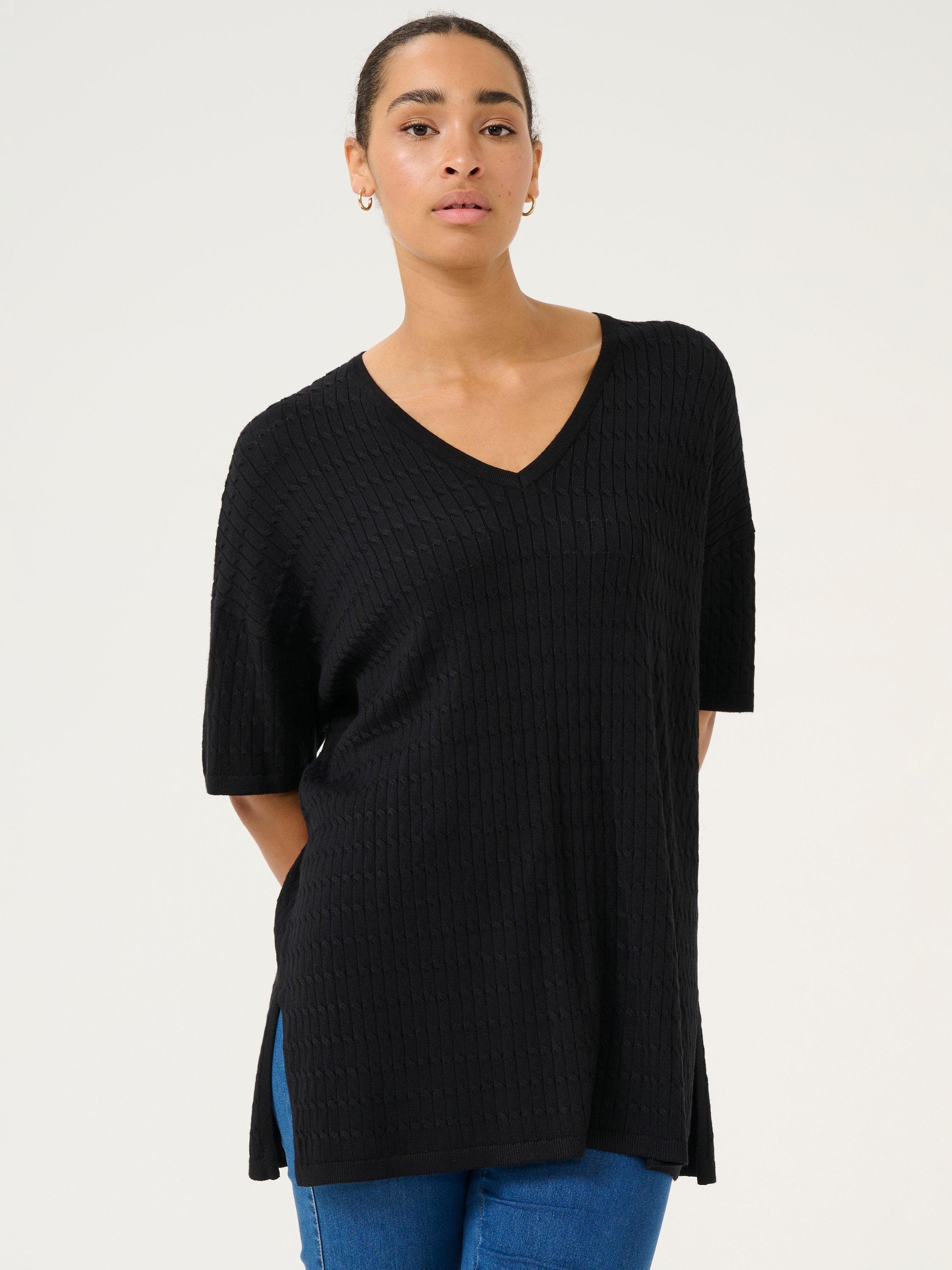 The silla pullover is a casual knit top with lots of styling options. It has a V-neck and an oversized fit with drop shoulders, and it is made in a soft cable knit fabric. The sleeves are half-length with a loose fit, and the pullover is cut below the hips and has a split hem.