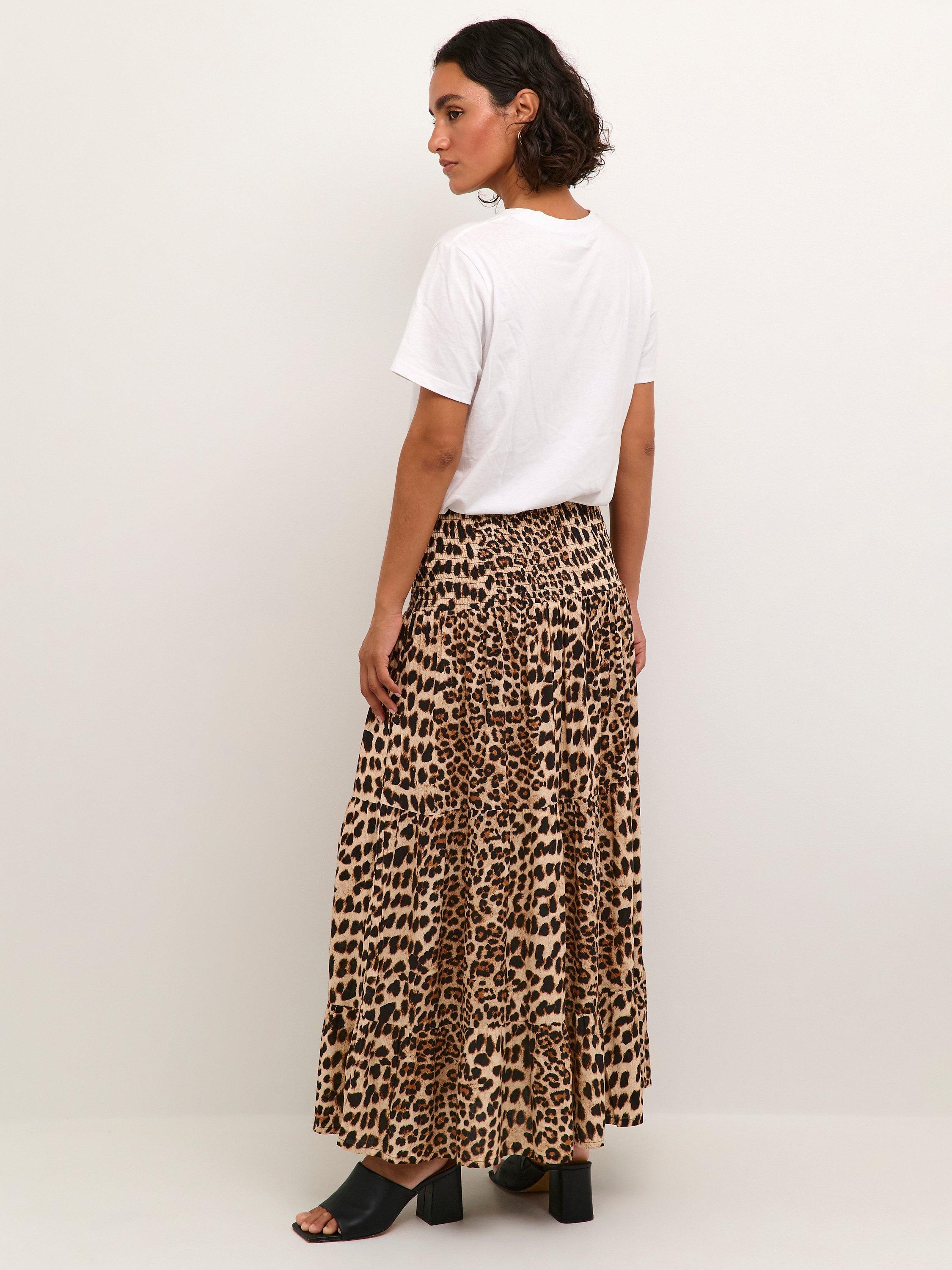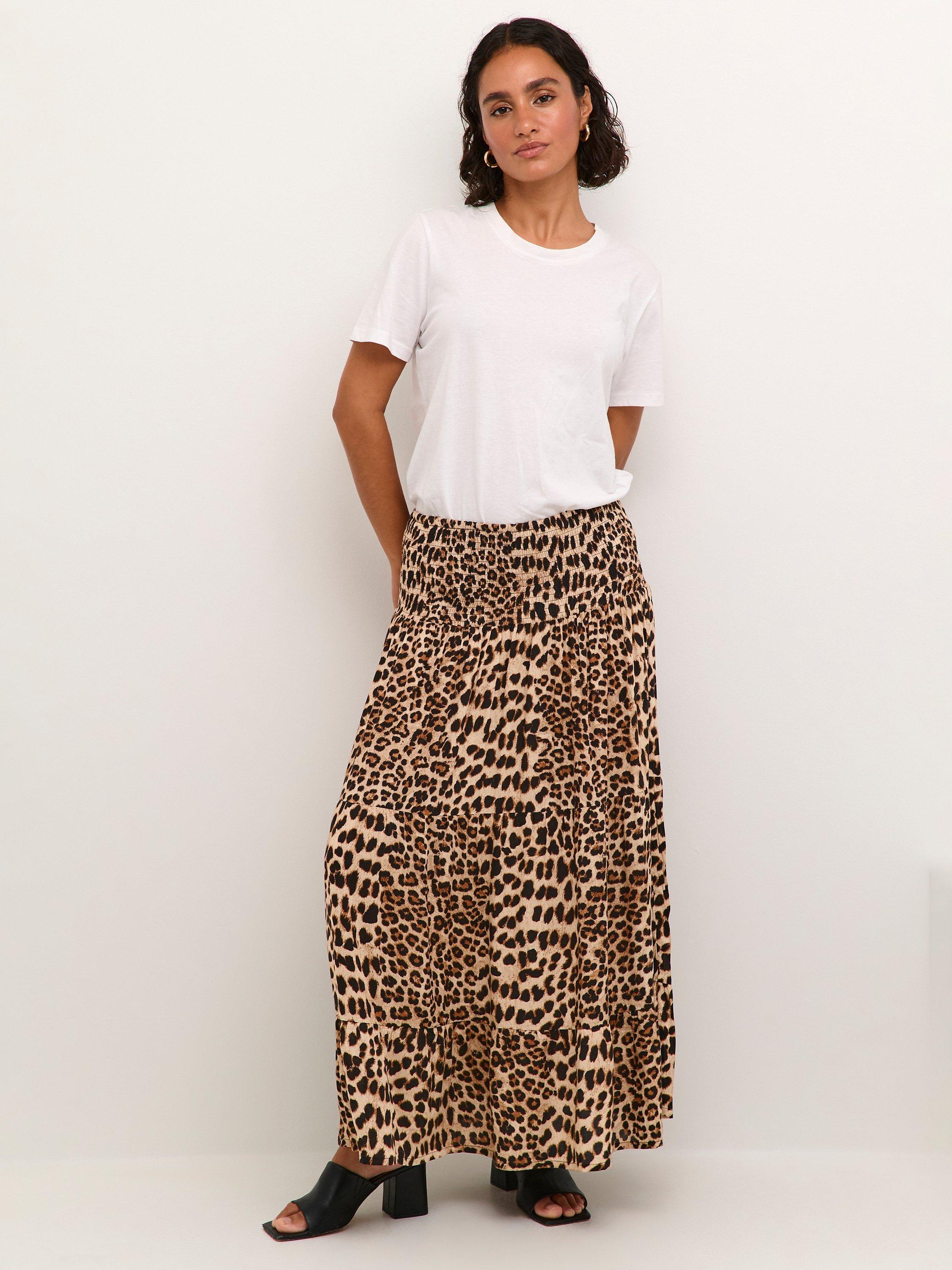 A cool maxi skirt in a great print. It has a midrise waist with a wide smock waistband, that makes feel and look great all day. The skirt has a flowy A-line fit, and comes down below the ankles.