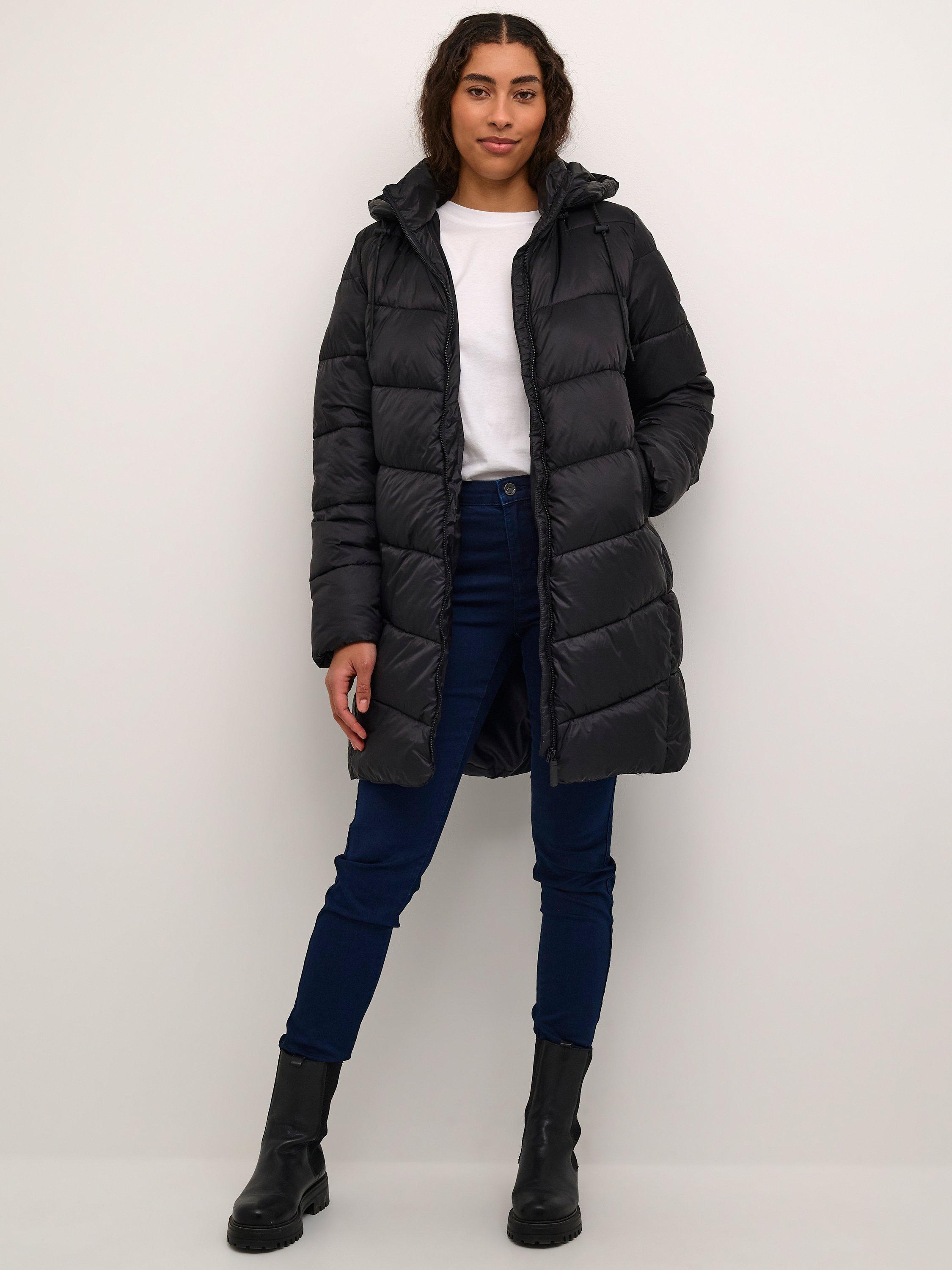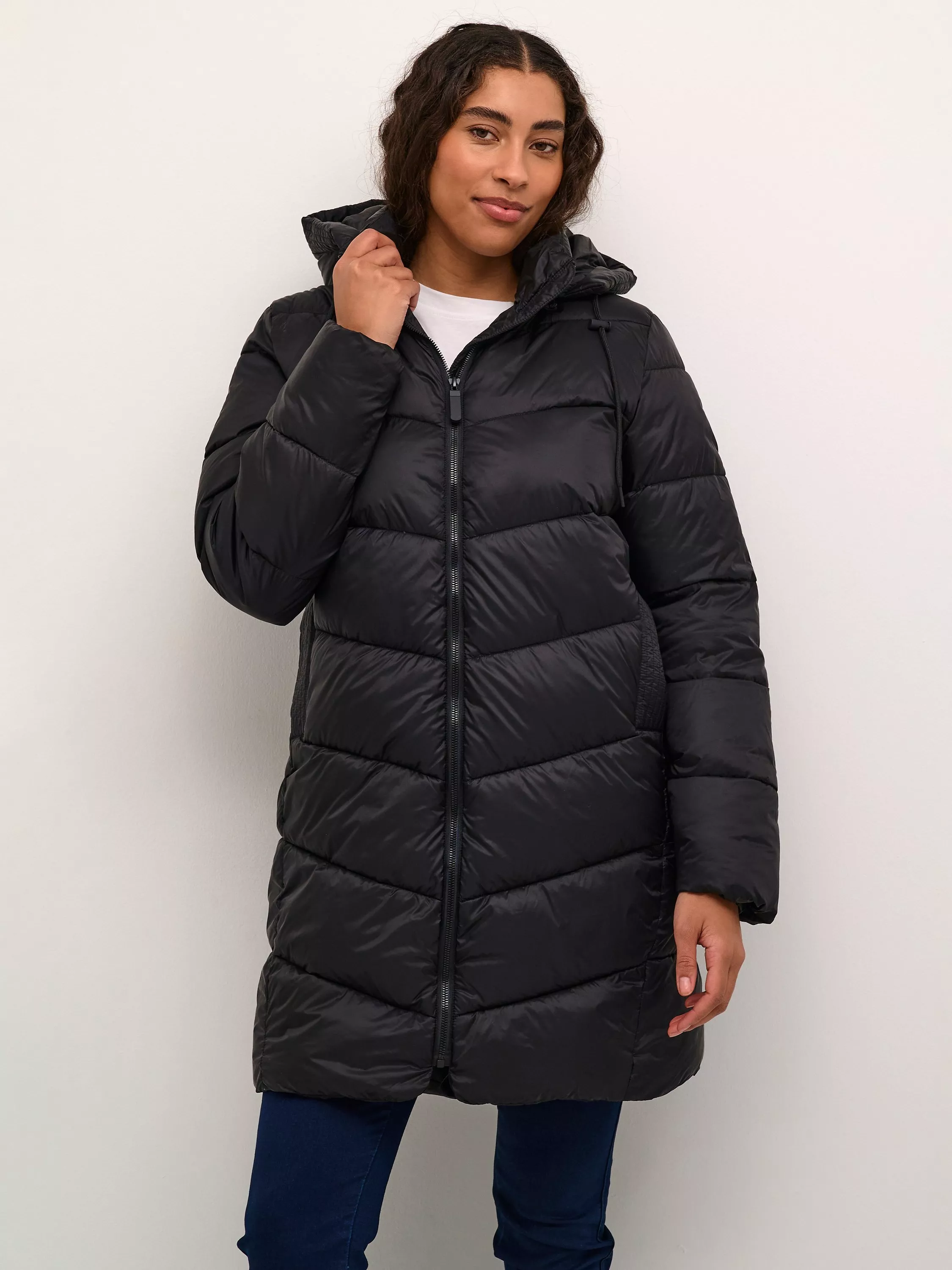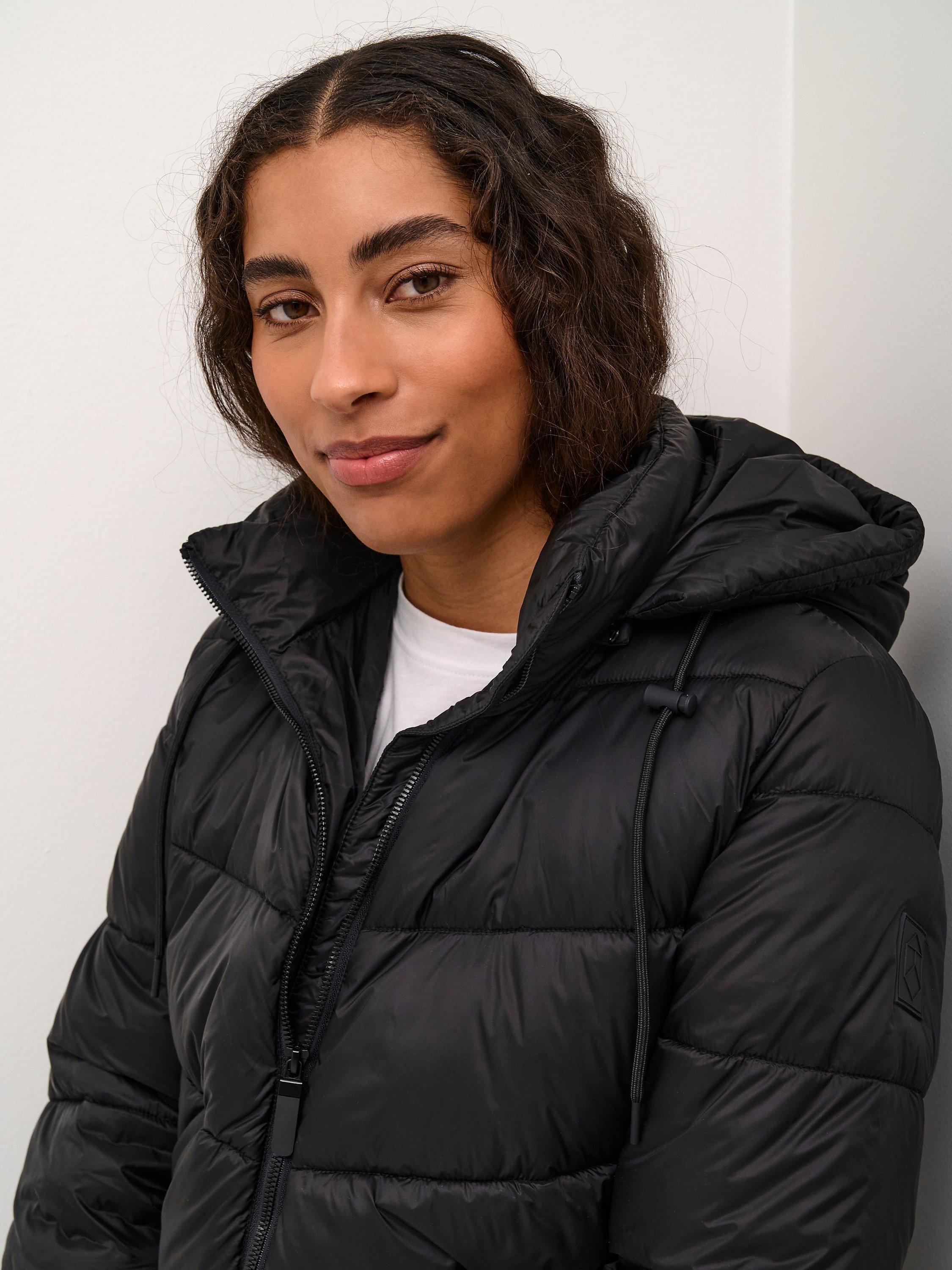 The susanne coat is a warm puffer coat with a sporty look. It has a high collar and a detachable hood, and it has a zipper fastening. The sleeves are long with elastic cuffs, and the coat is cut at the mid-thigh. It has slanted front pockets, and it is quilted in a wide chevron pattern.
