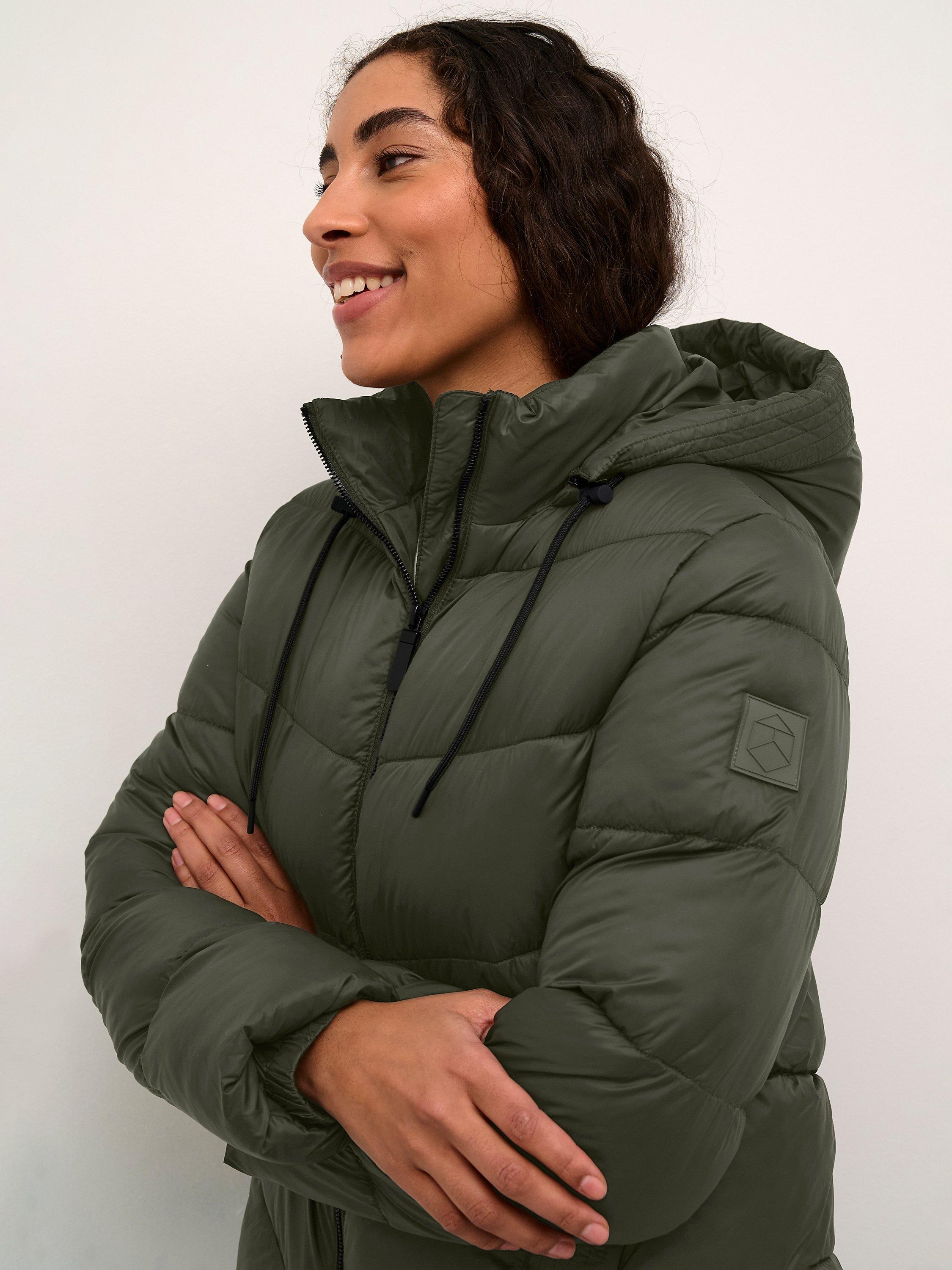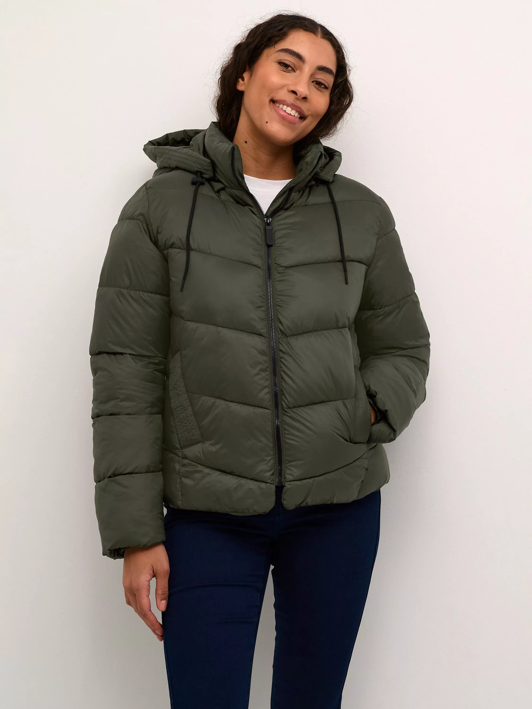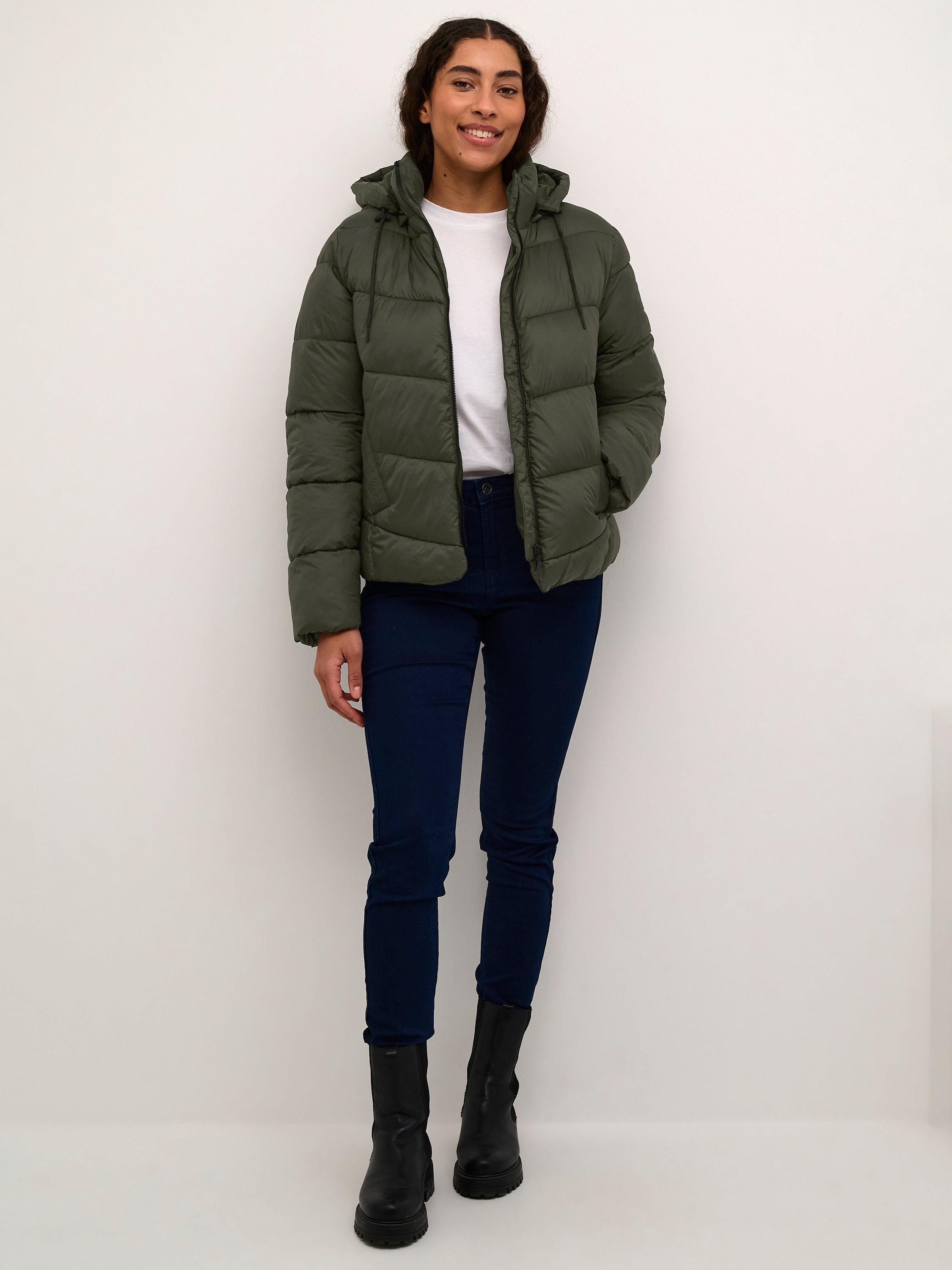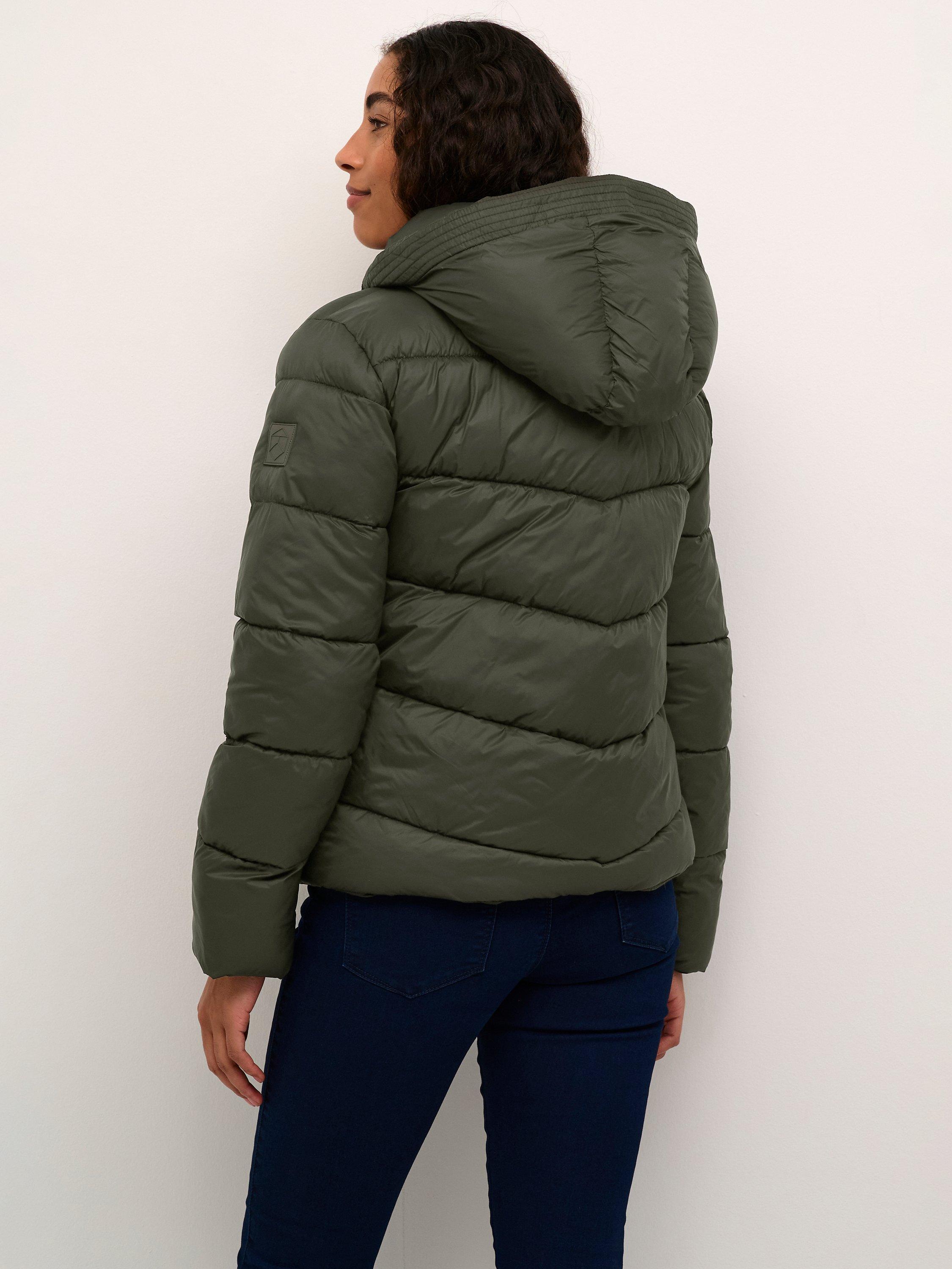 The susanne jacket is a casual piece of outerwear with a sporty look. It has a high collar with a detachable hood, and it has a zipper fastening. The sleeves are long with elastic cuffs, and the jacket is cut at the hips. It has slanted front pockets, and it is quilted in a wide chevron pattern.