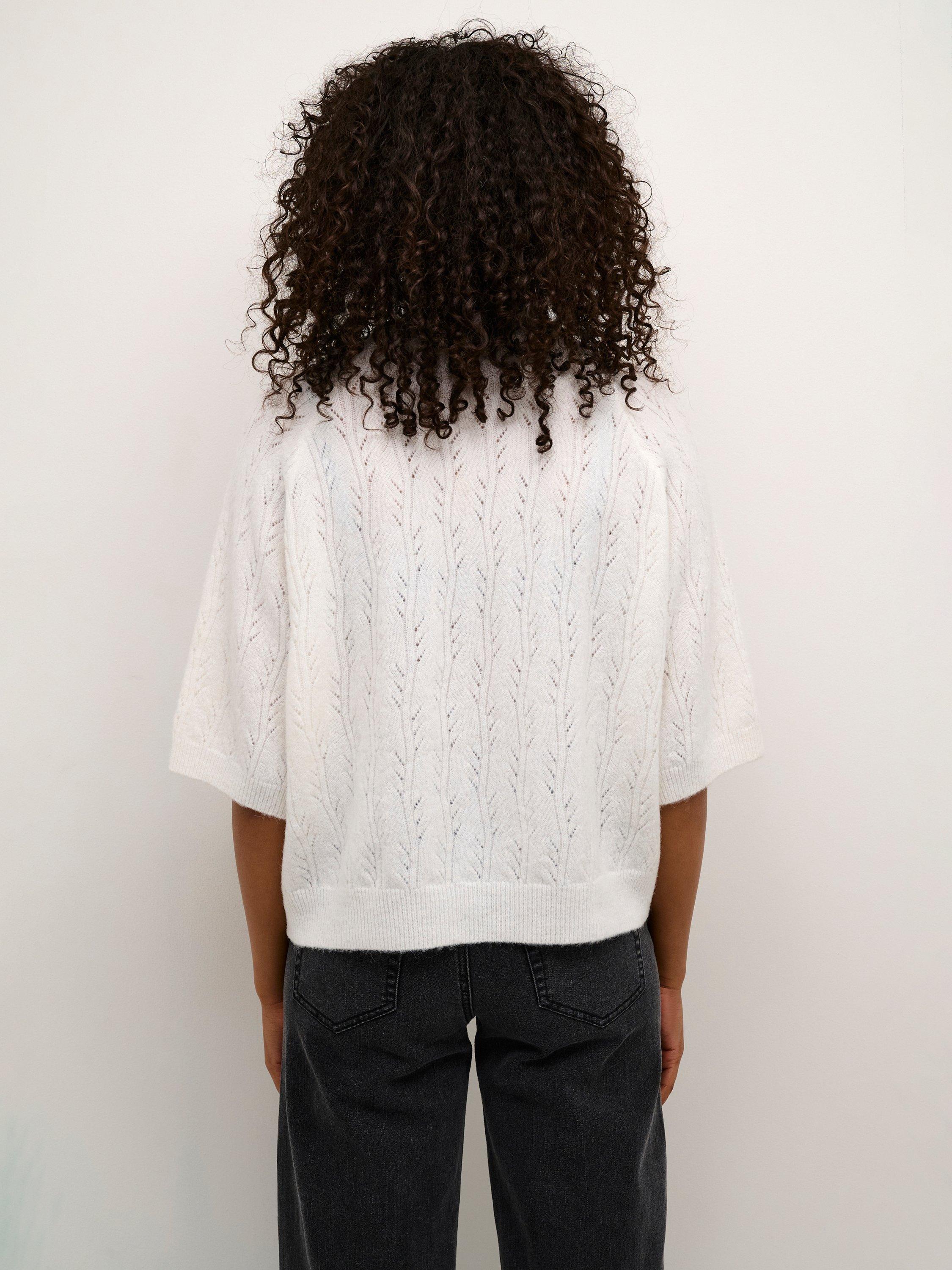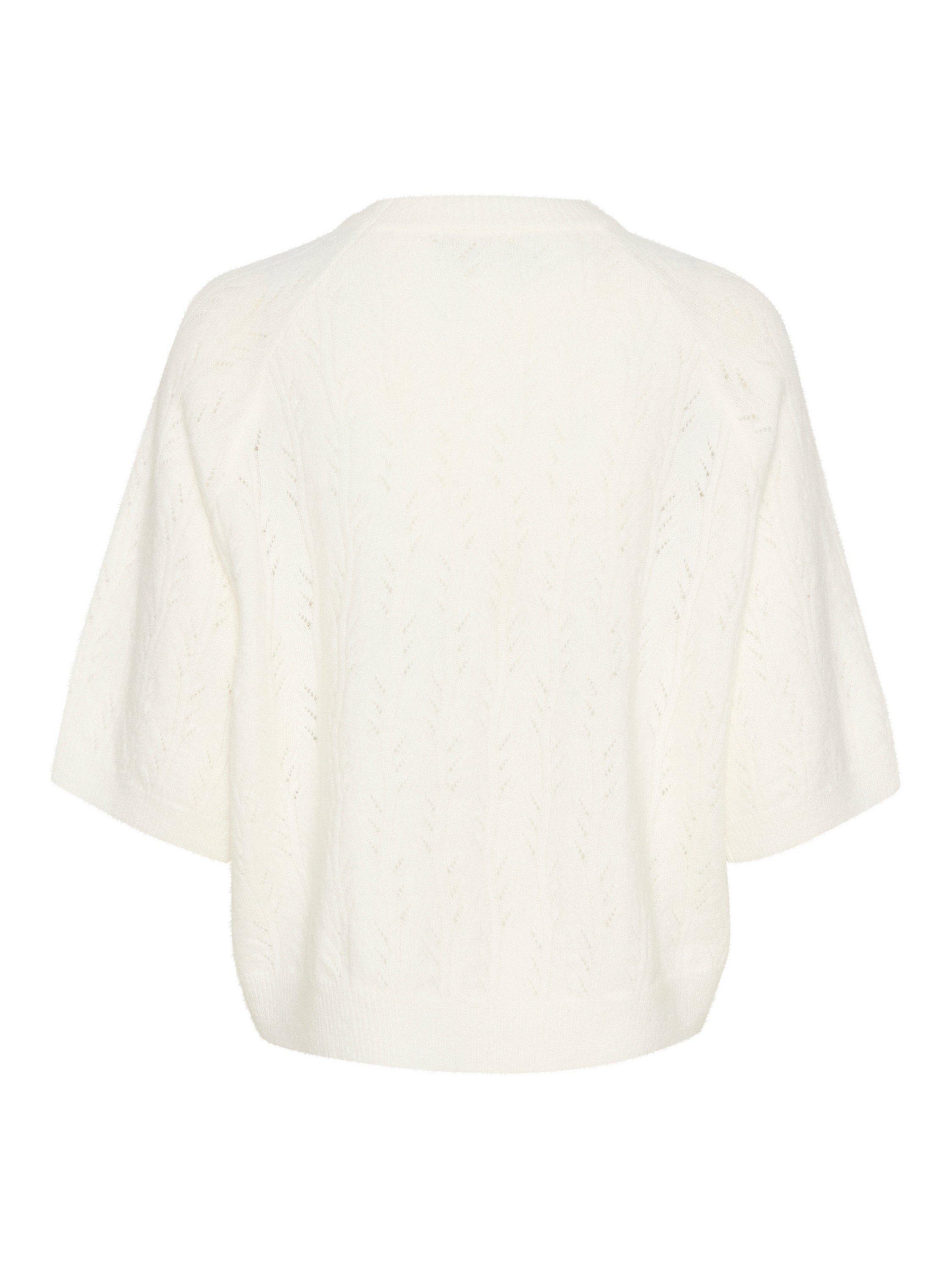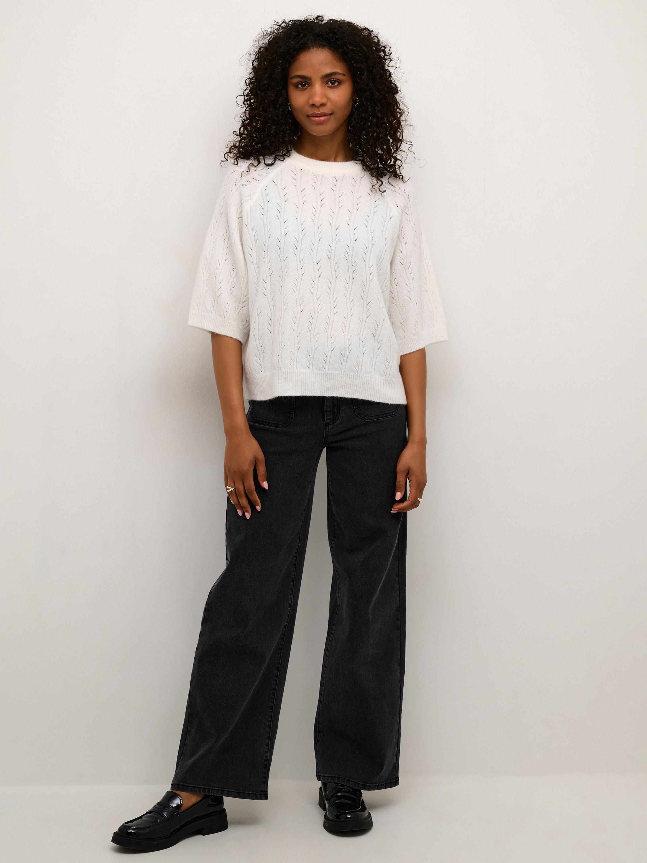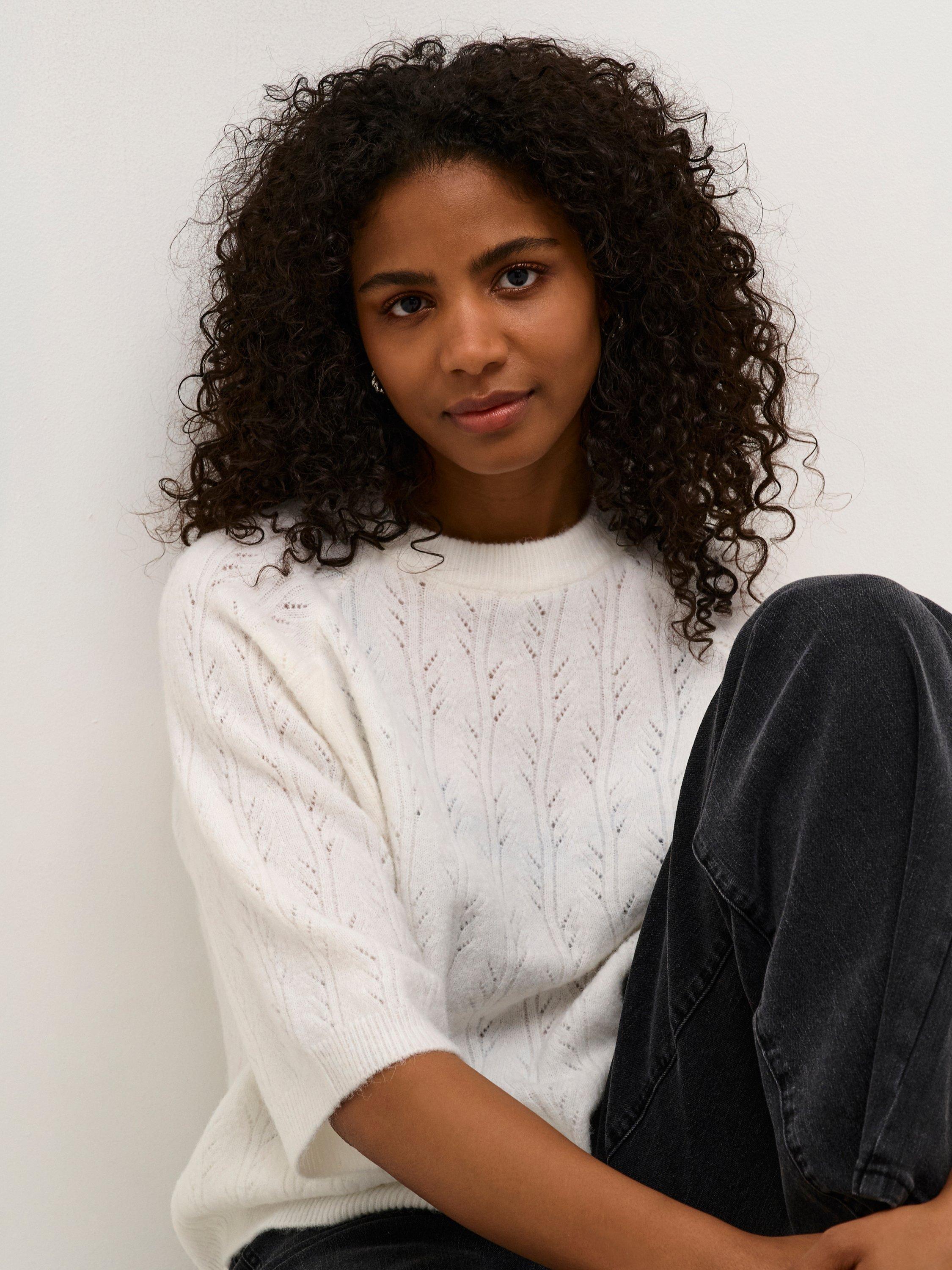 The tella pullover is a simple and casual style in a cute hole knit pattern. It has a round neck and a regular fit, and it has rib knit edges. The sleeves are half-length raglan sleeves with a straight fit, and the pullover is cut at the hips.