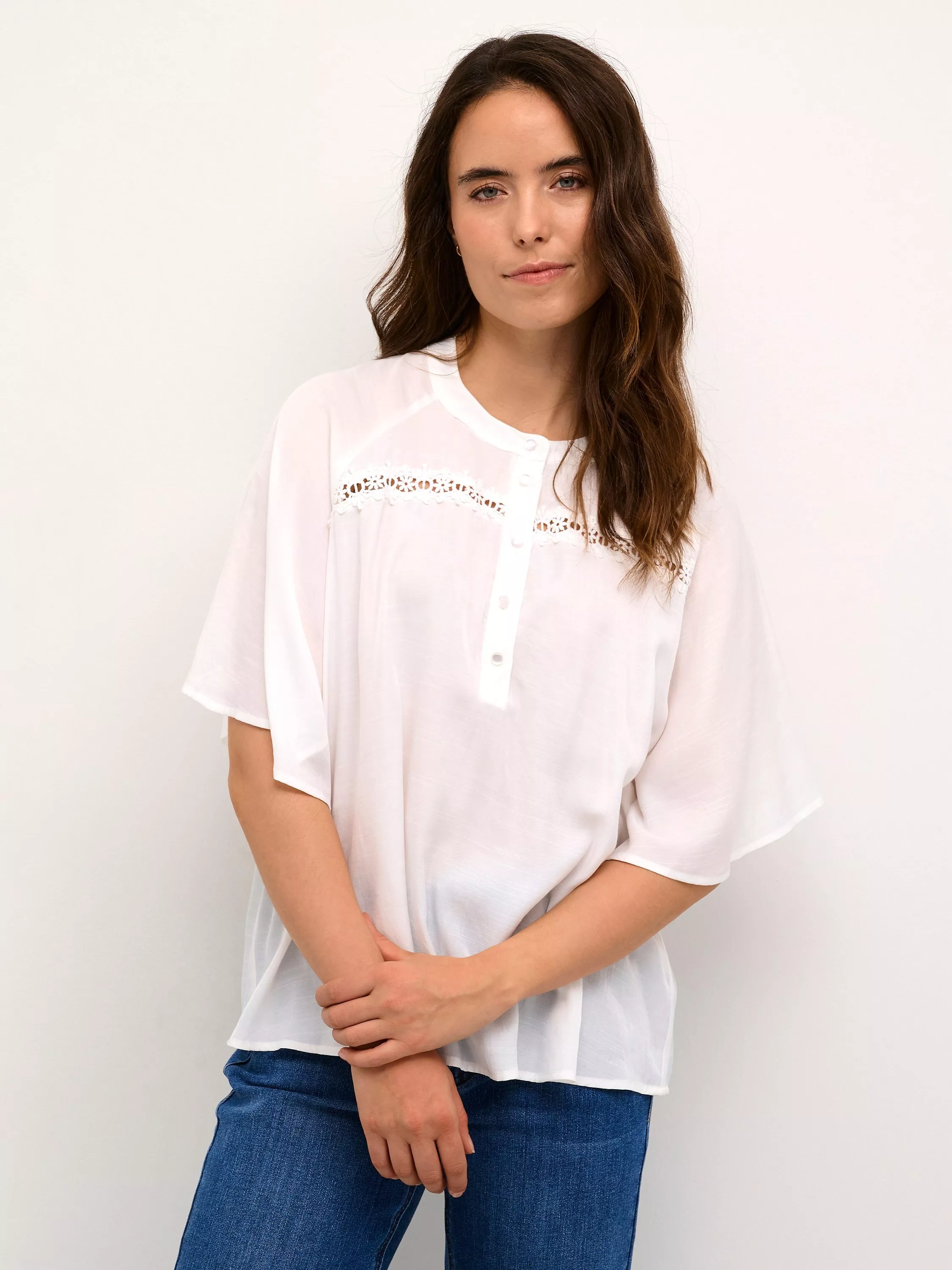 The Tilde blouse is a cute and simple top, that you can wear with anything. It has a round henley neck with buttons, and it has a lace inset across the chest and back. The sleeves are half-length raglan sleeves with a loose and flowy fit, and it is cut at the hips.