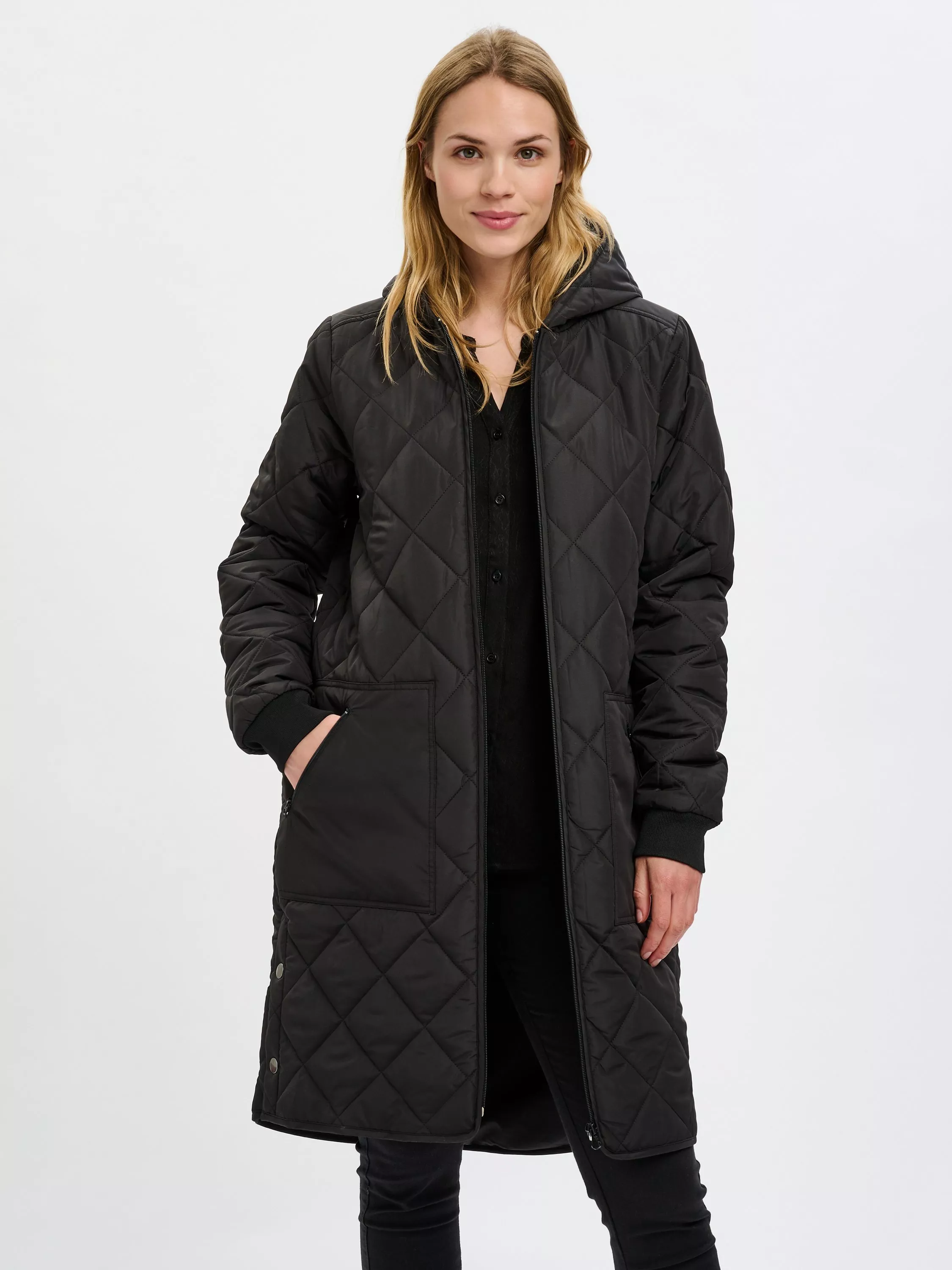 The Tilla coat is a simple and casual piece of outerwear, perfect for your everyday wardrobe. It is hooded with a zipper fastening, and it is quilted in a diamond shaped pattern. The sleeves are long with rib cuffs, and the coat has slanted front pockets and is cut at the mid-thigh.