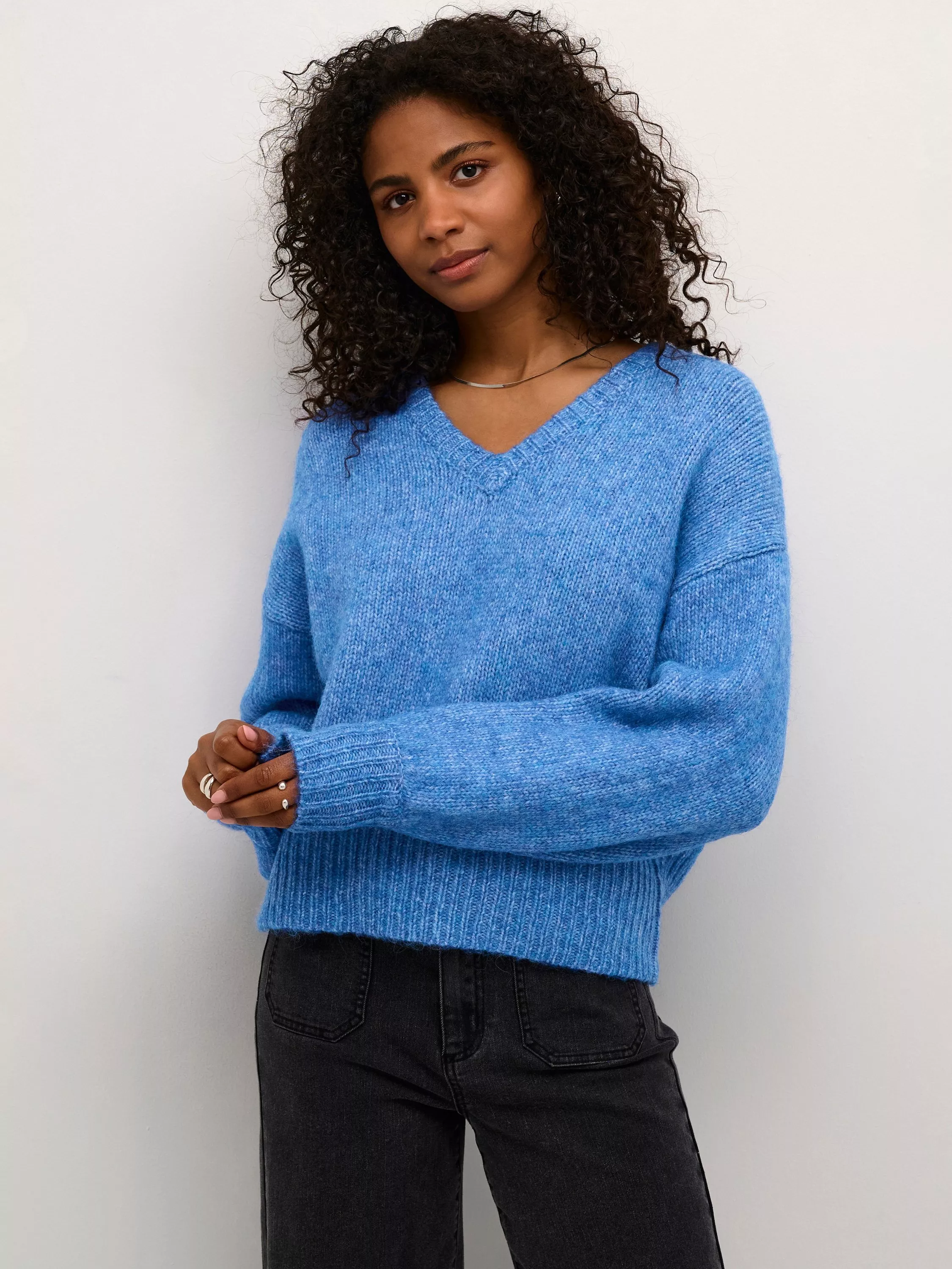 The trina pullover is a cool and cosy knit style, that you can easily wear with both trousers, jeans, and a skirt. It has a V-neck and a relaxed fit with drop shoulders, and it is made in a soft and fuzzy rib knit. The sleeves are long and loose, and they are gathered in a wide knit cuff. All the edges are finished in a chunky rib knit.
