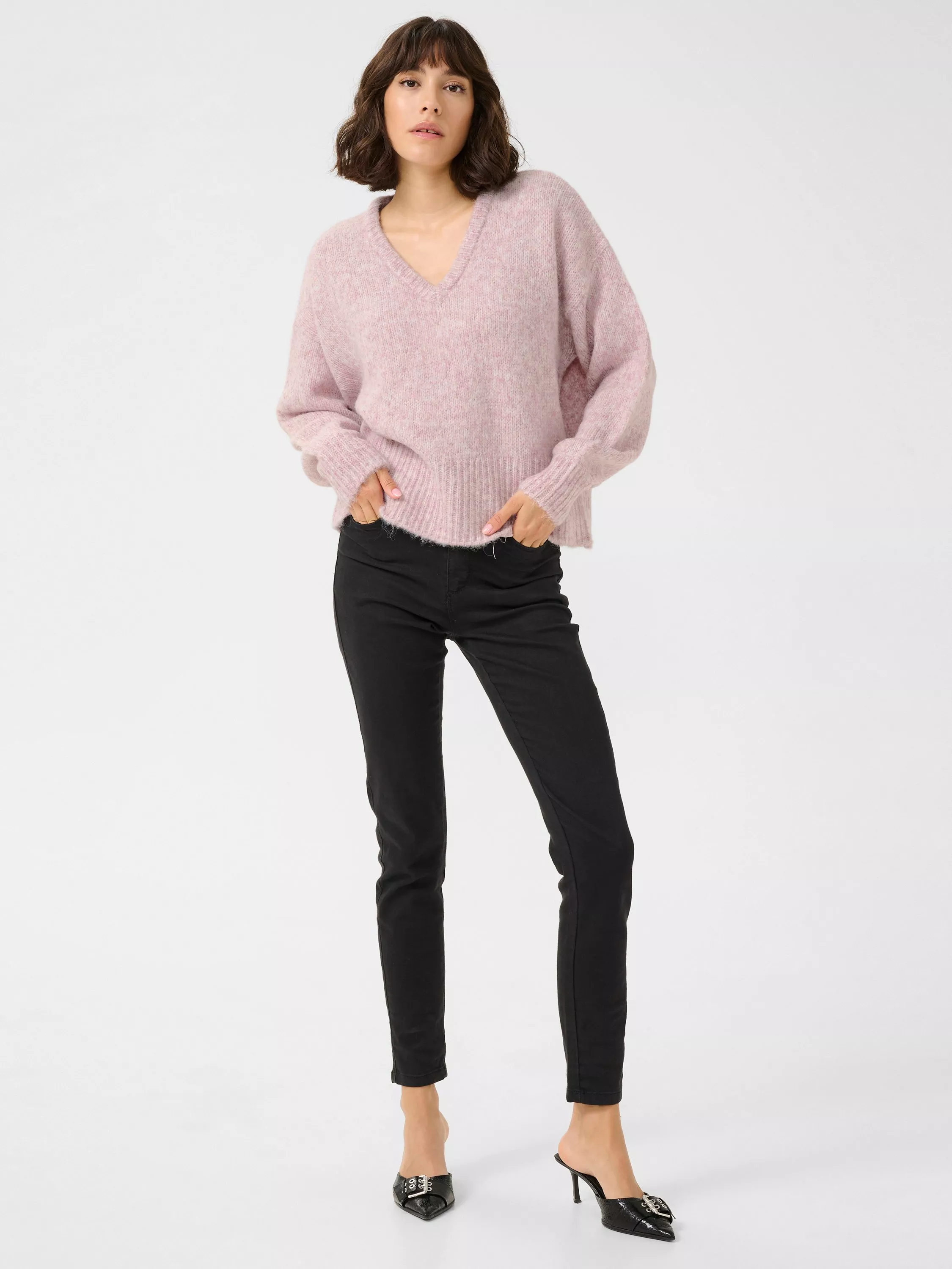 The trina pullover is a cool and cosy knit style, that you can easily wear with both trousers, jeans, and a skirt. It has a V-neck and a relaxed fit with drop shoulders, and it is made in a soft and fuzzy rib knit. The sleeves are long and loose, and they are gathered in a wide knit cuff. All the edges are finished in a chunky rib knit.