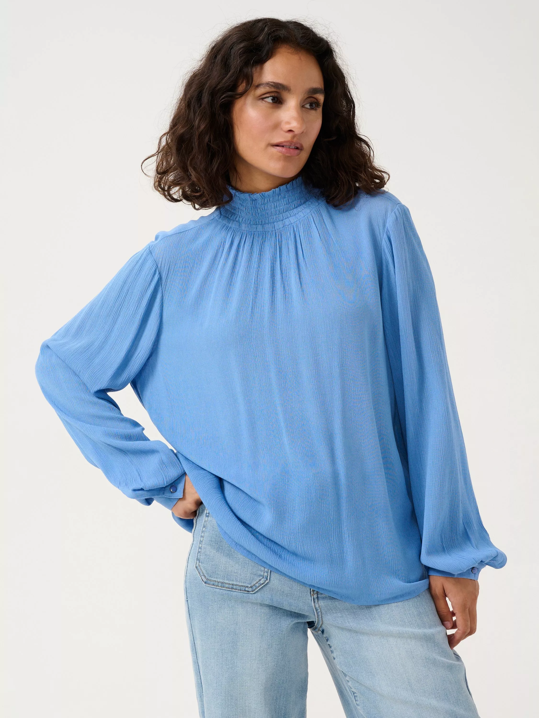The trine blouse is the perfect addition to your everyday wardrobe. It has a high smock neck with two buttons at the back for fastening and a narrow keyhole detail underneath. The sleeves are long and loose with buttoned cuffs, and the blouse has a relaxed fit.