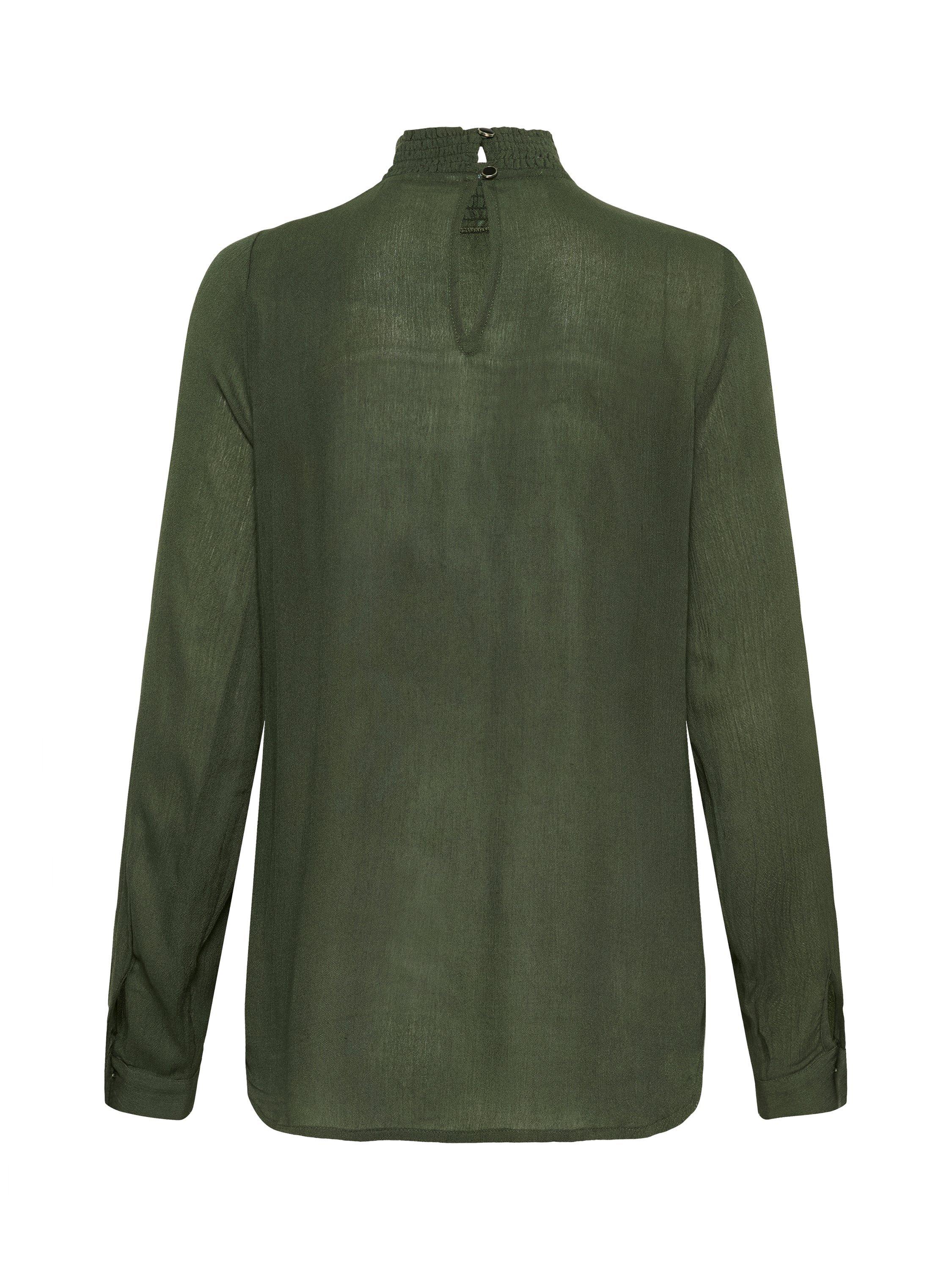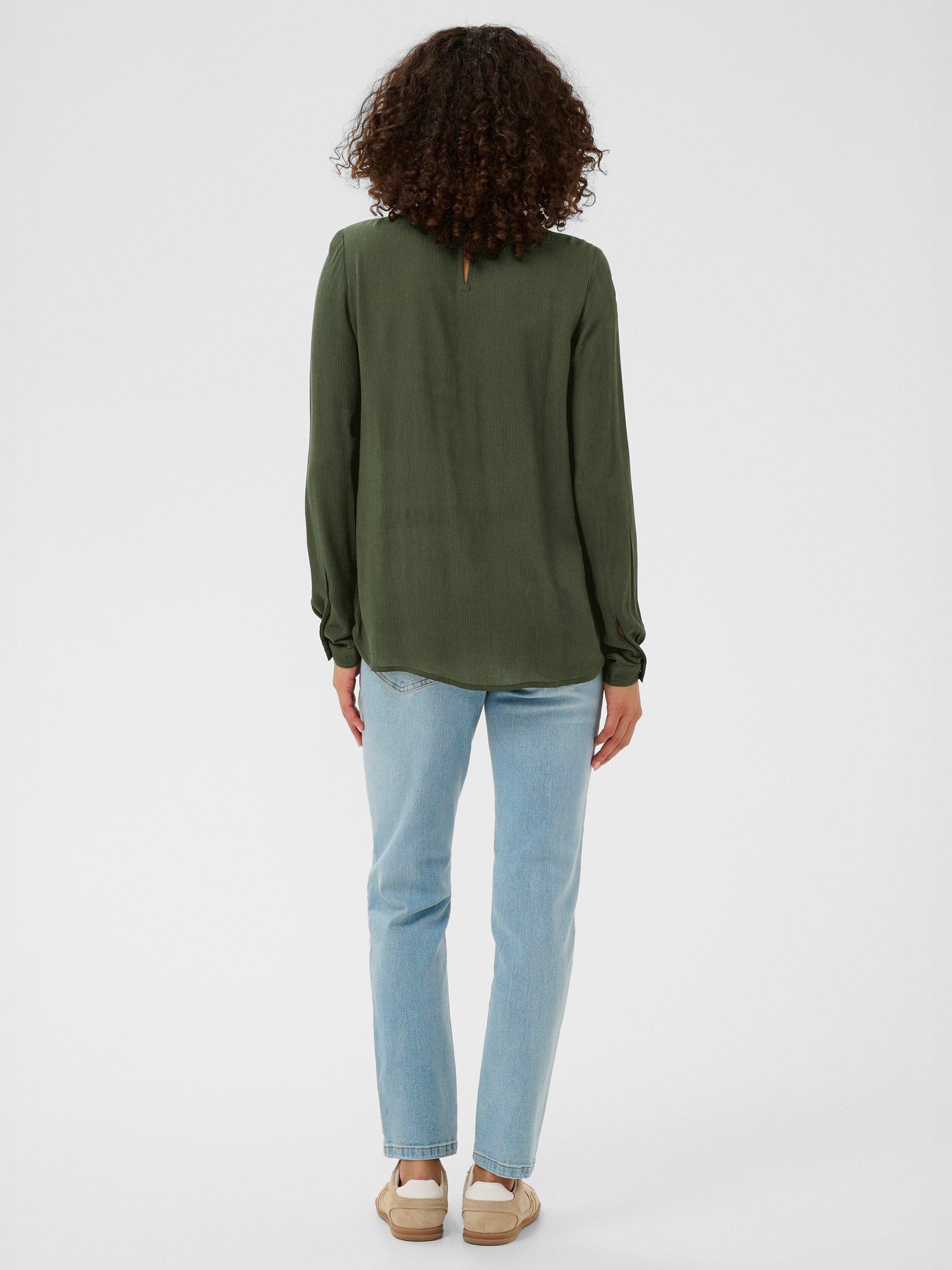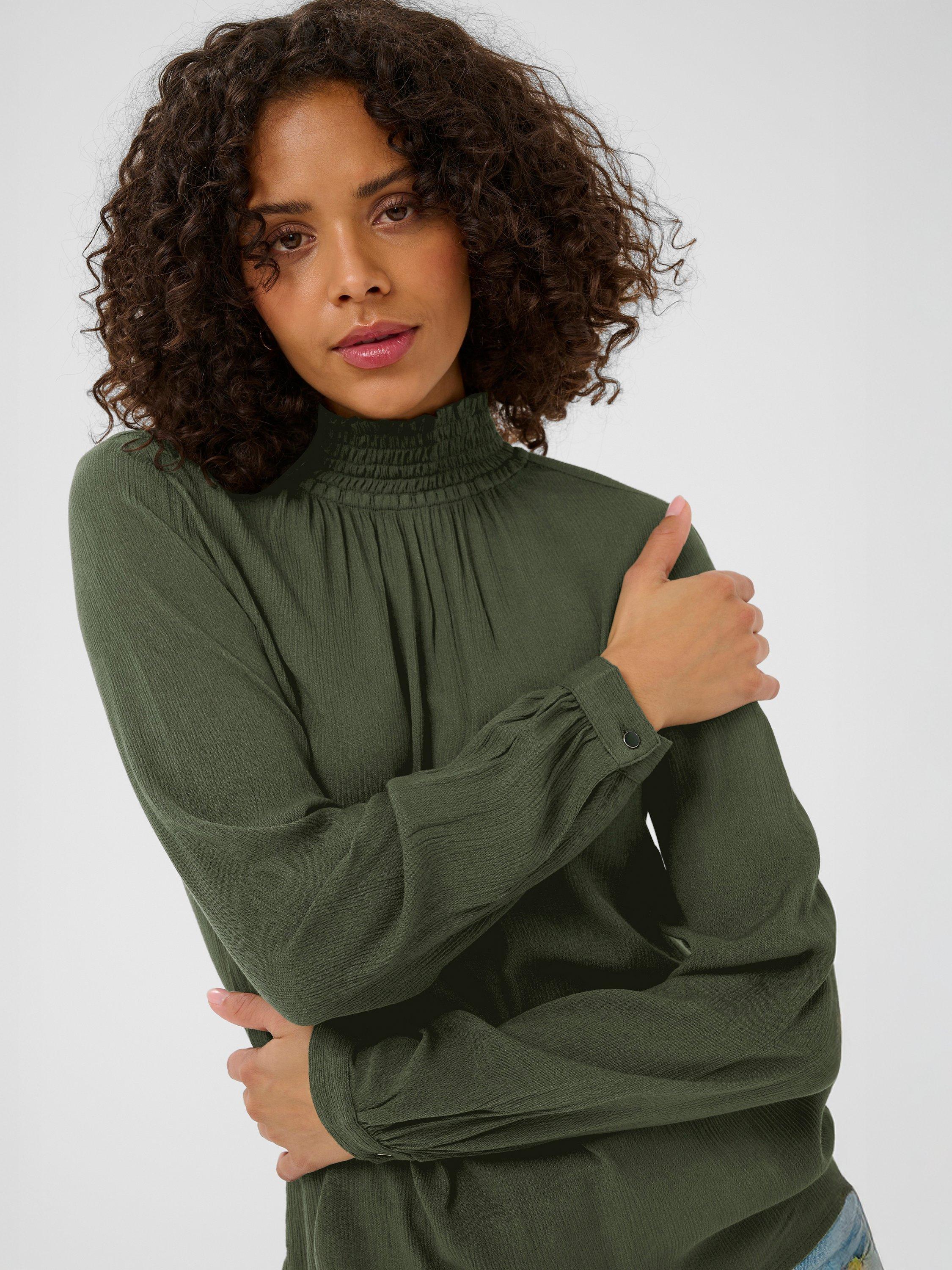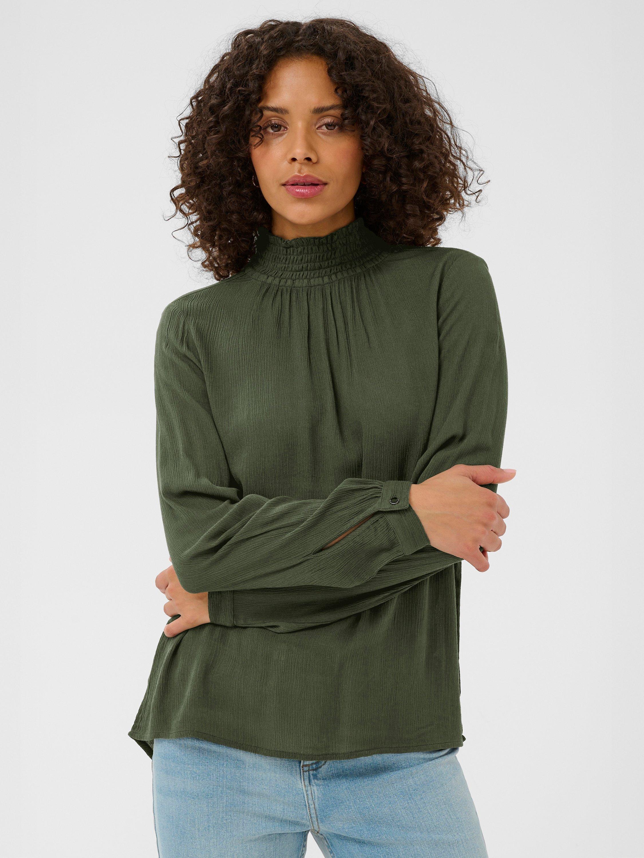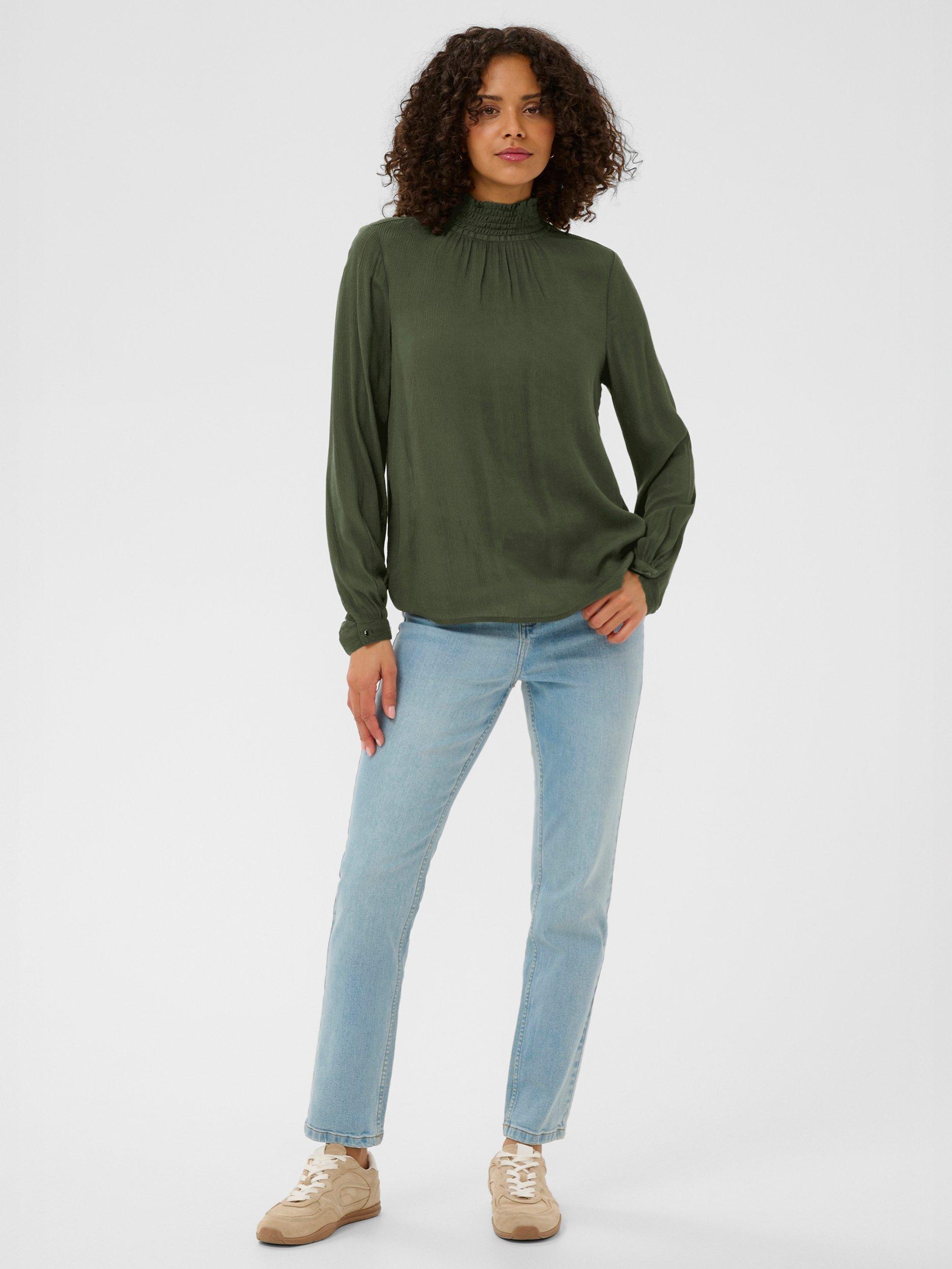 The trine blouse is the perfect addition to your everyday wardrobe. It has a high smock neck with two buttons at the back for fastening and a narrow keyhole detail underneath. The sleeves are long and loose with buttoned cuffs, and the blouse has a relaxed fit.