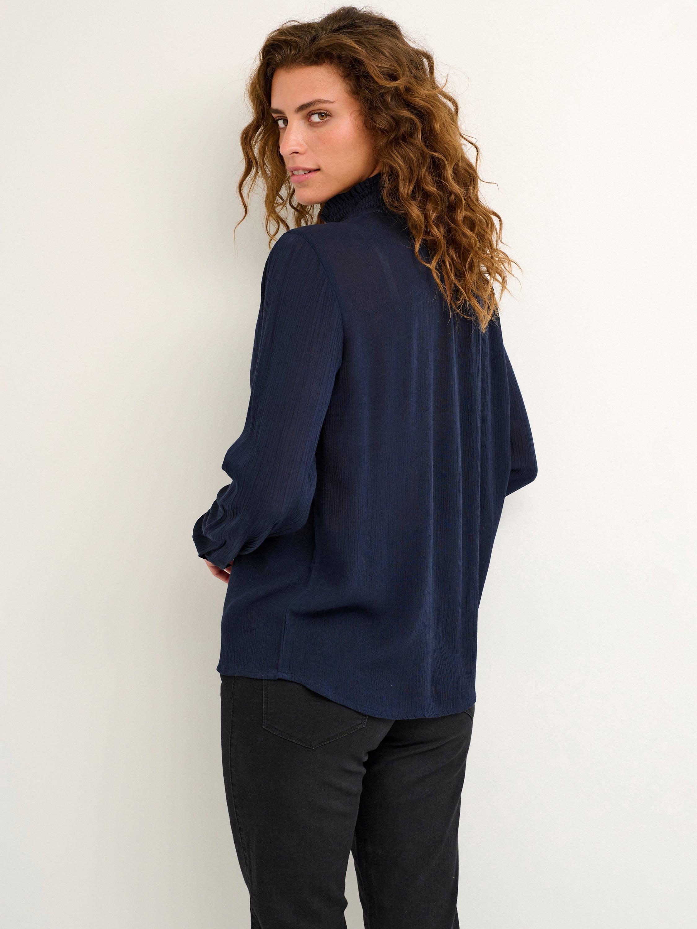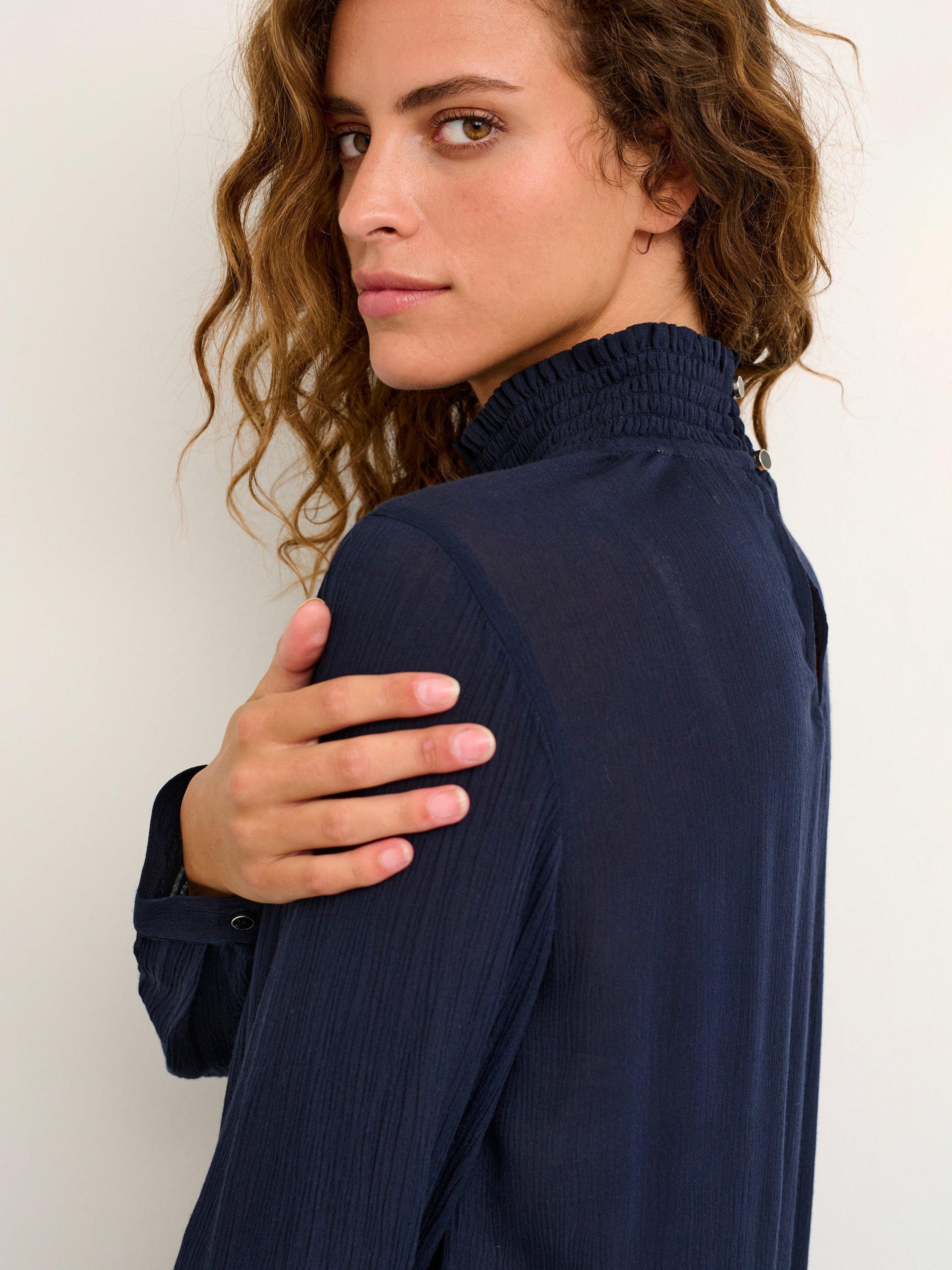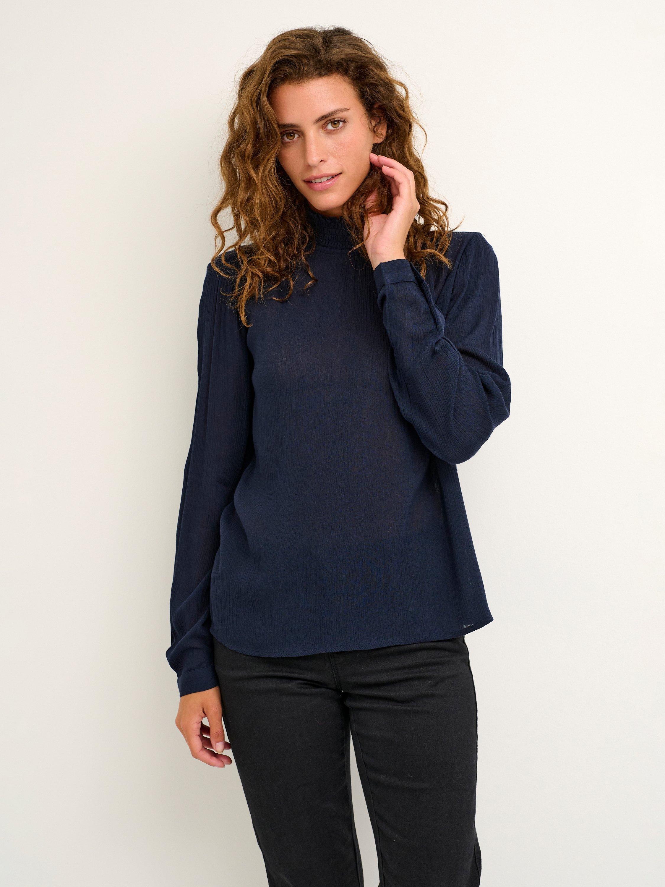 The trine blouse is the perfect addition to your everyday wardrobe. It has a high smock neck with two buttons at the back for fastening and a narrow keyhole detail underneath. The sleeves are long and loose with buttoned cuffs, and the blouse has a relaxed fit.