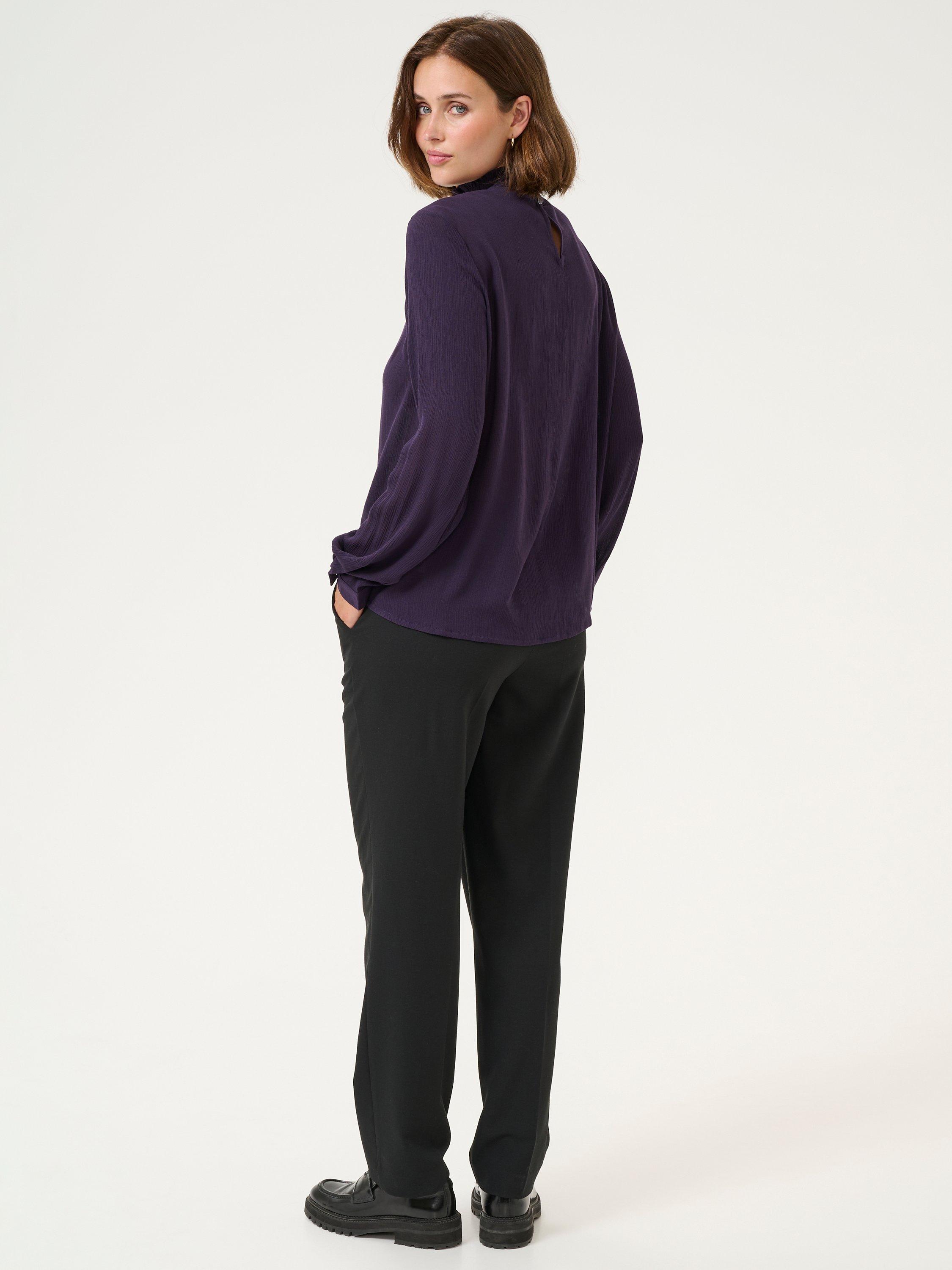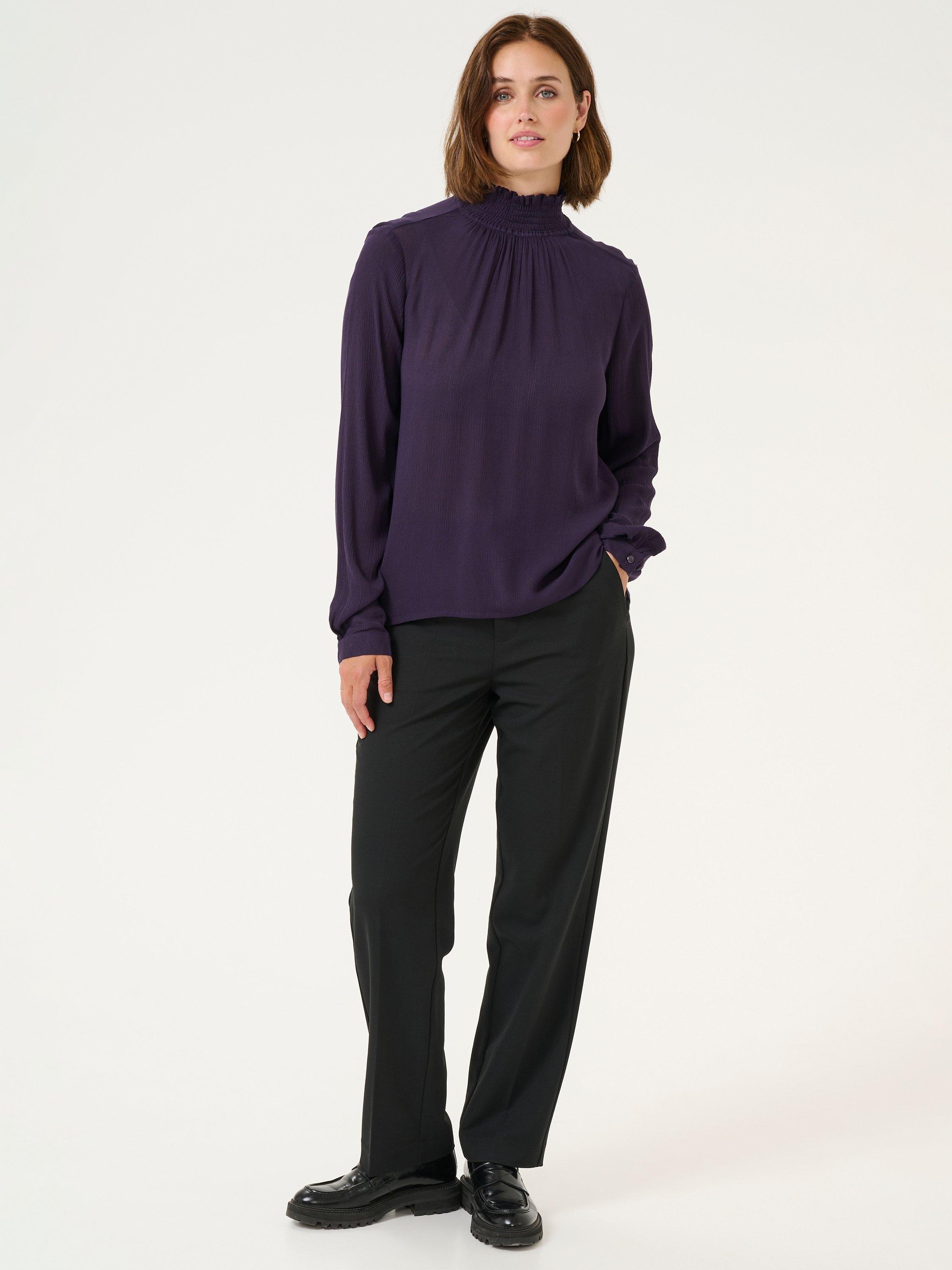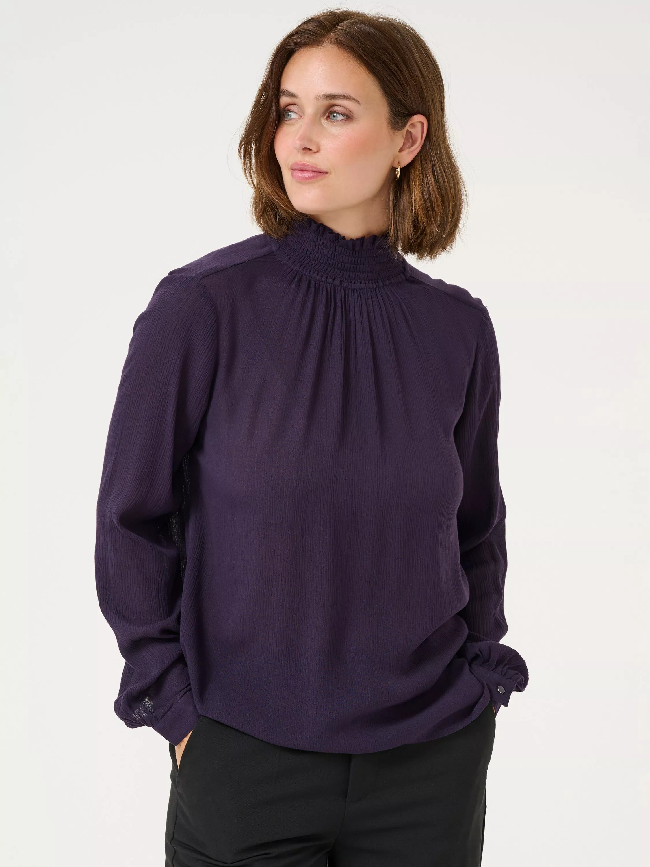 The trine blouse is the perfect addition to your everyday wardrobe. It has a high smock neck with two buttons at the back for fastening and a narrow keyhole detail underneath. The sleeves are long and loose with buttoned cuffs, and the blouse has a relaxed fit.