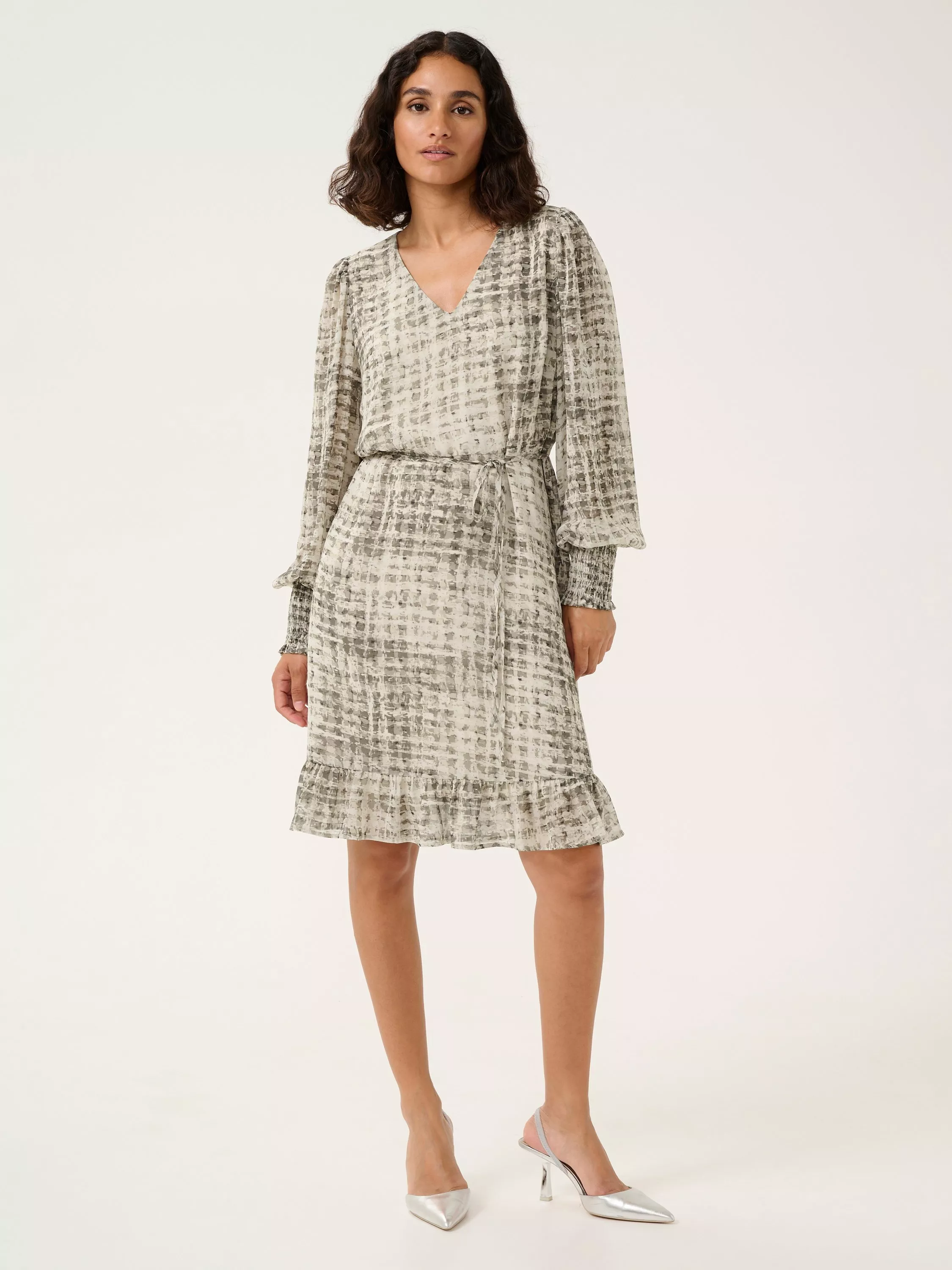 The trinike dress is a feminine and versatile style - perfect for lots of occasions this season. It has a V-neck and a regular fit with a drawstring waist, and it has a ruffled hem. The sleeves are long and voluminous bishop sleeves with smock cuffs, and the dress is cut at the knees.