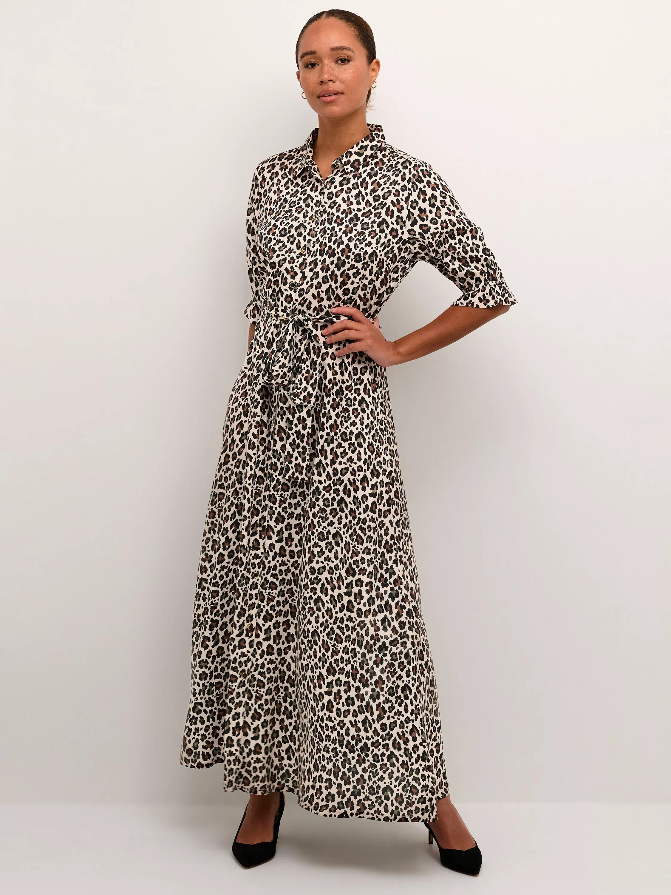 The Velana maxi dress is a versatile and flattering dress, that you can use on any occasion. It is a full-length shirt dress with buttons all down the front. The dress has a classic shirt collar and a tying belt at the waist. It has half-length sleeves that are gathered in an elastic cuff with a frilled edge.