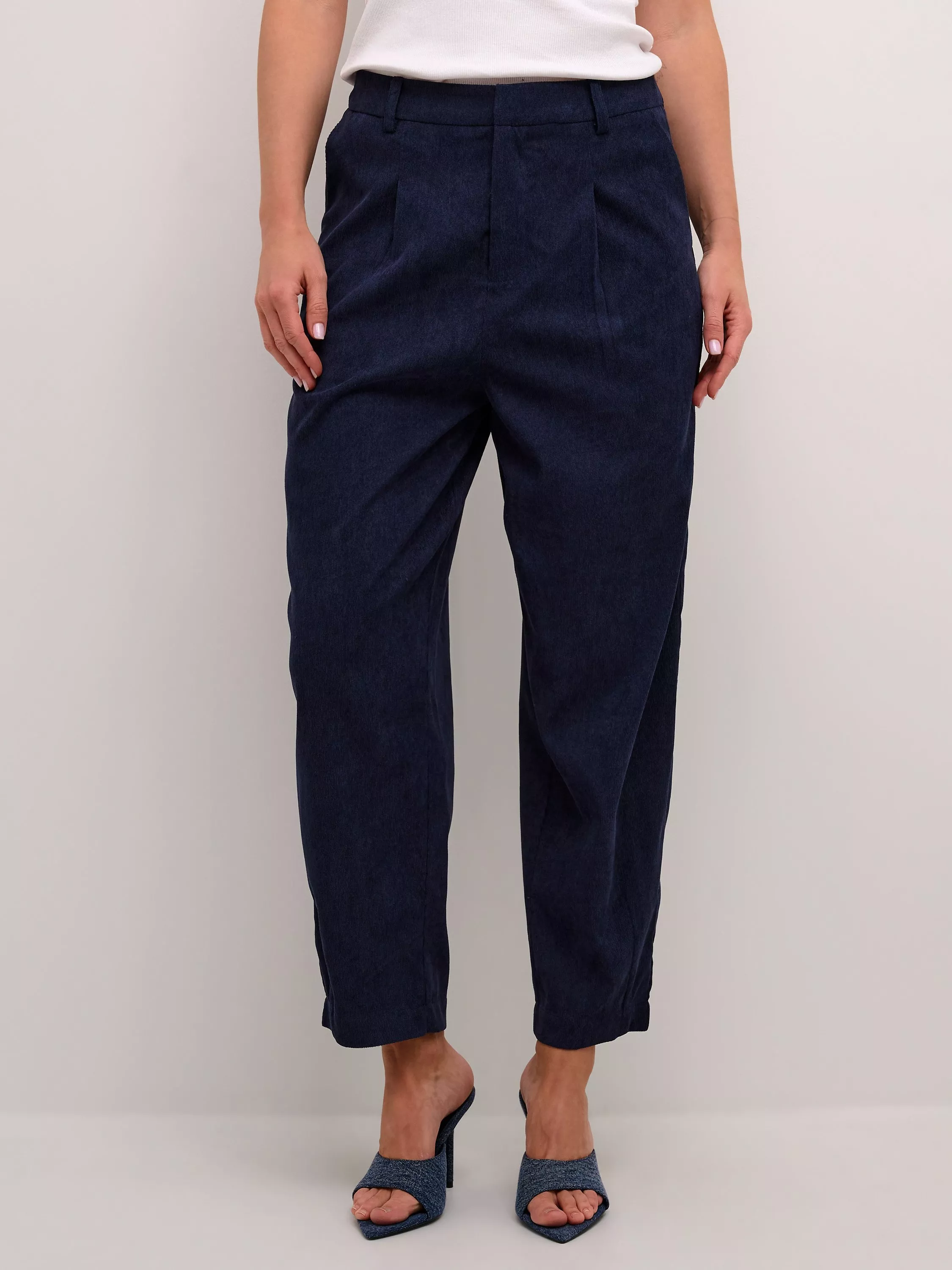 The vera trousers are a cool pair of trousers made in a soft corduroy fabric. They have a midrise waist with a zipper and hook and bar fastening, and they have a casual fit. The legs are tapered and cropped at the ankles, and the trousers have welted back pockets and seamed side pockets.