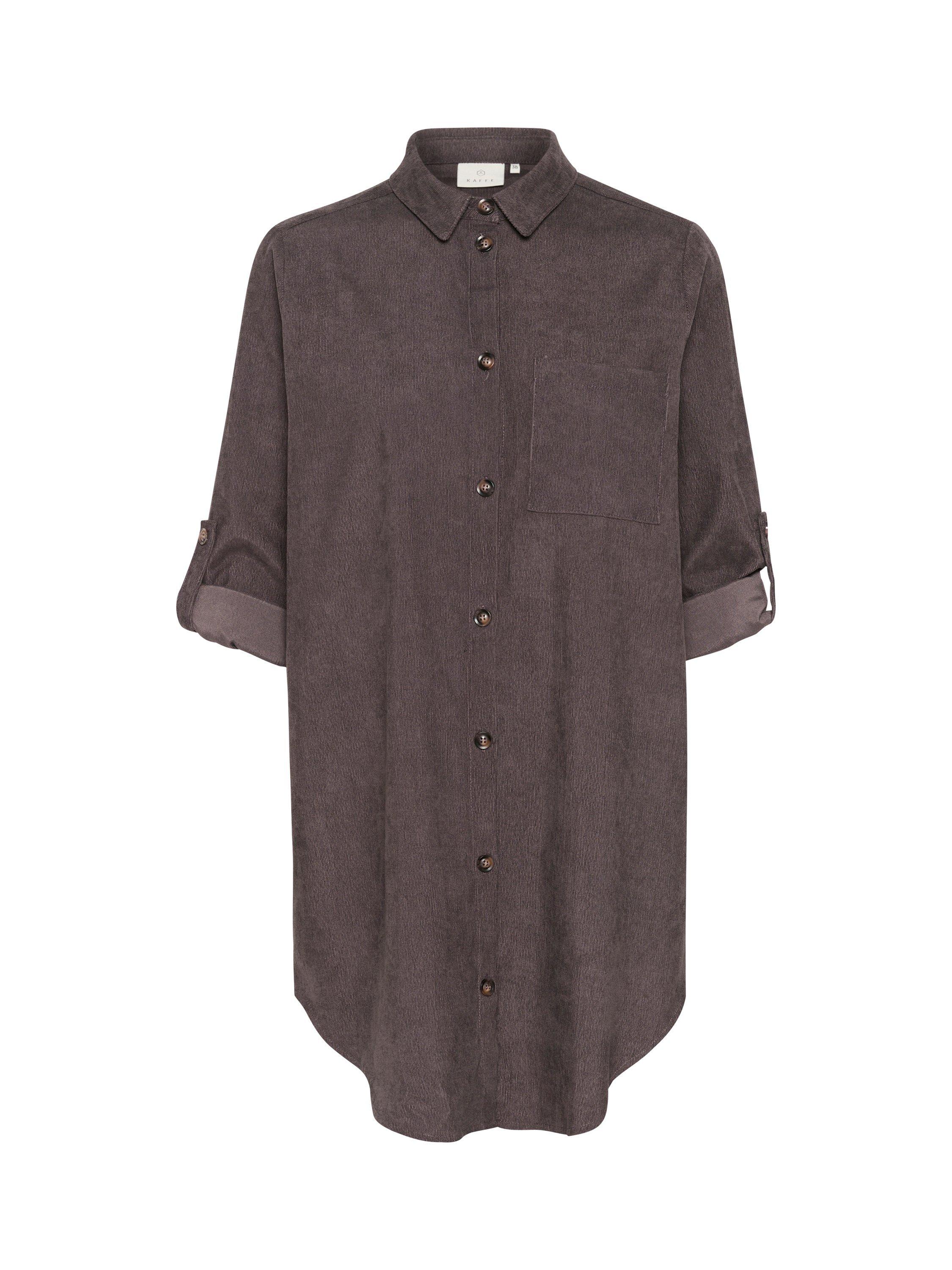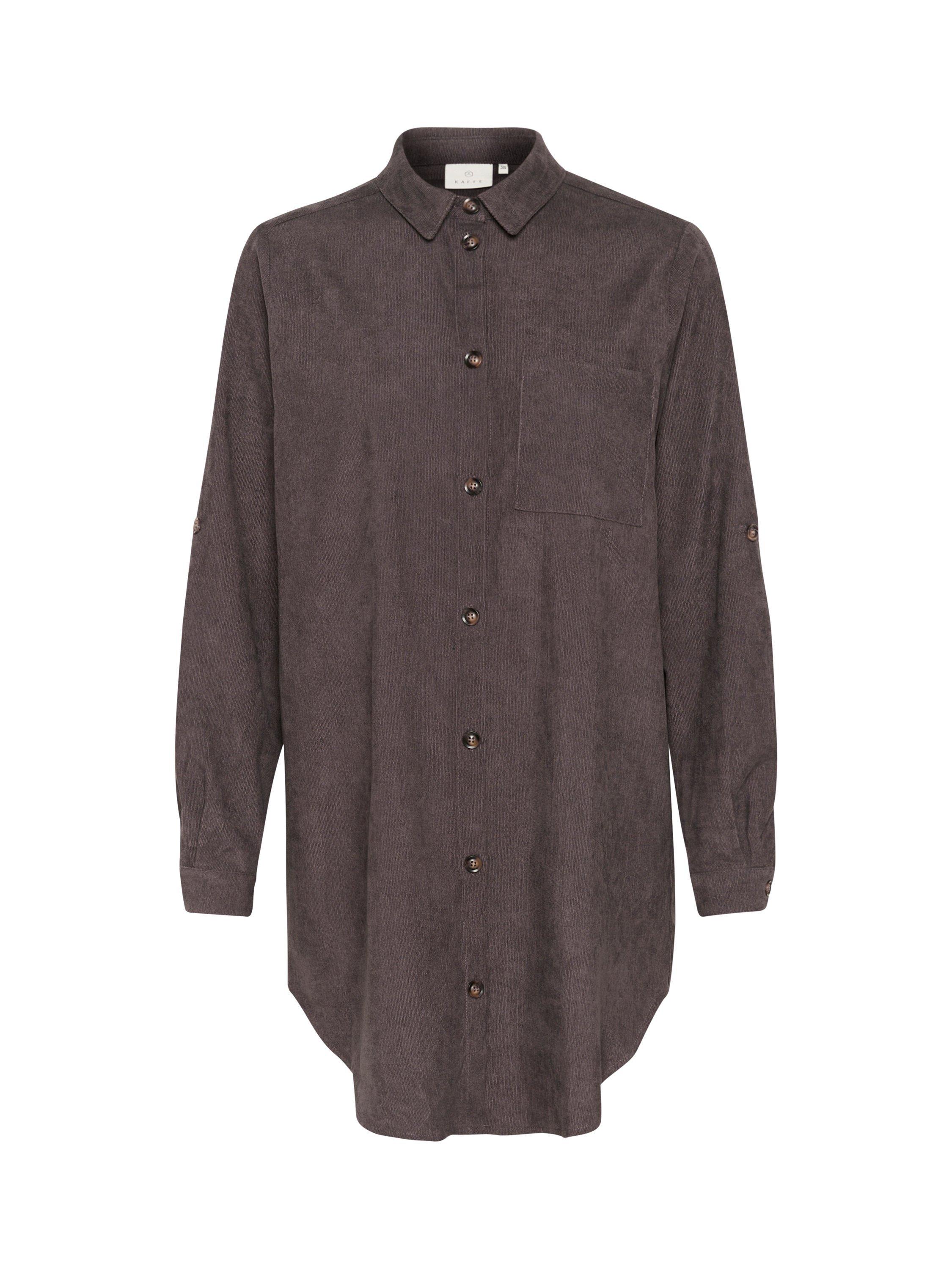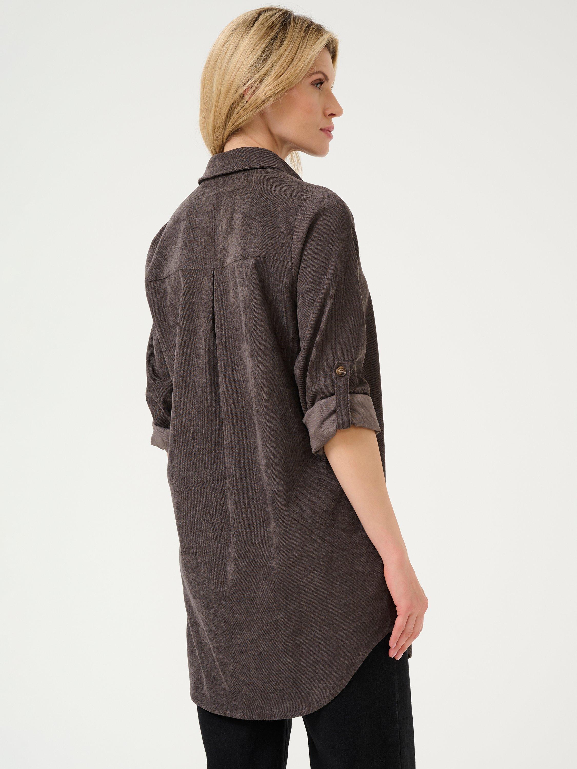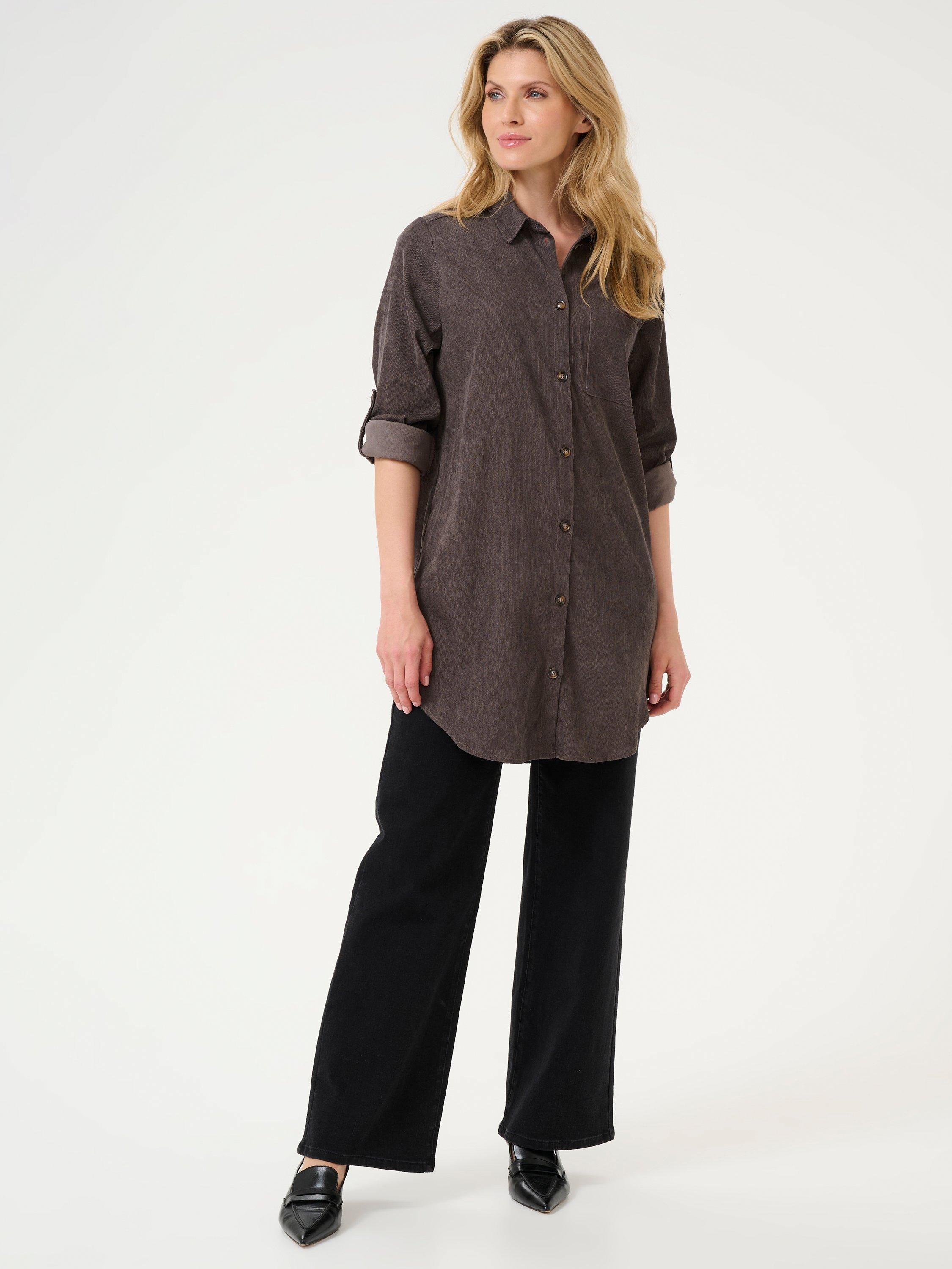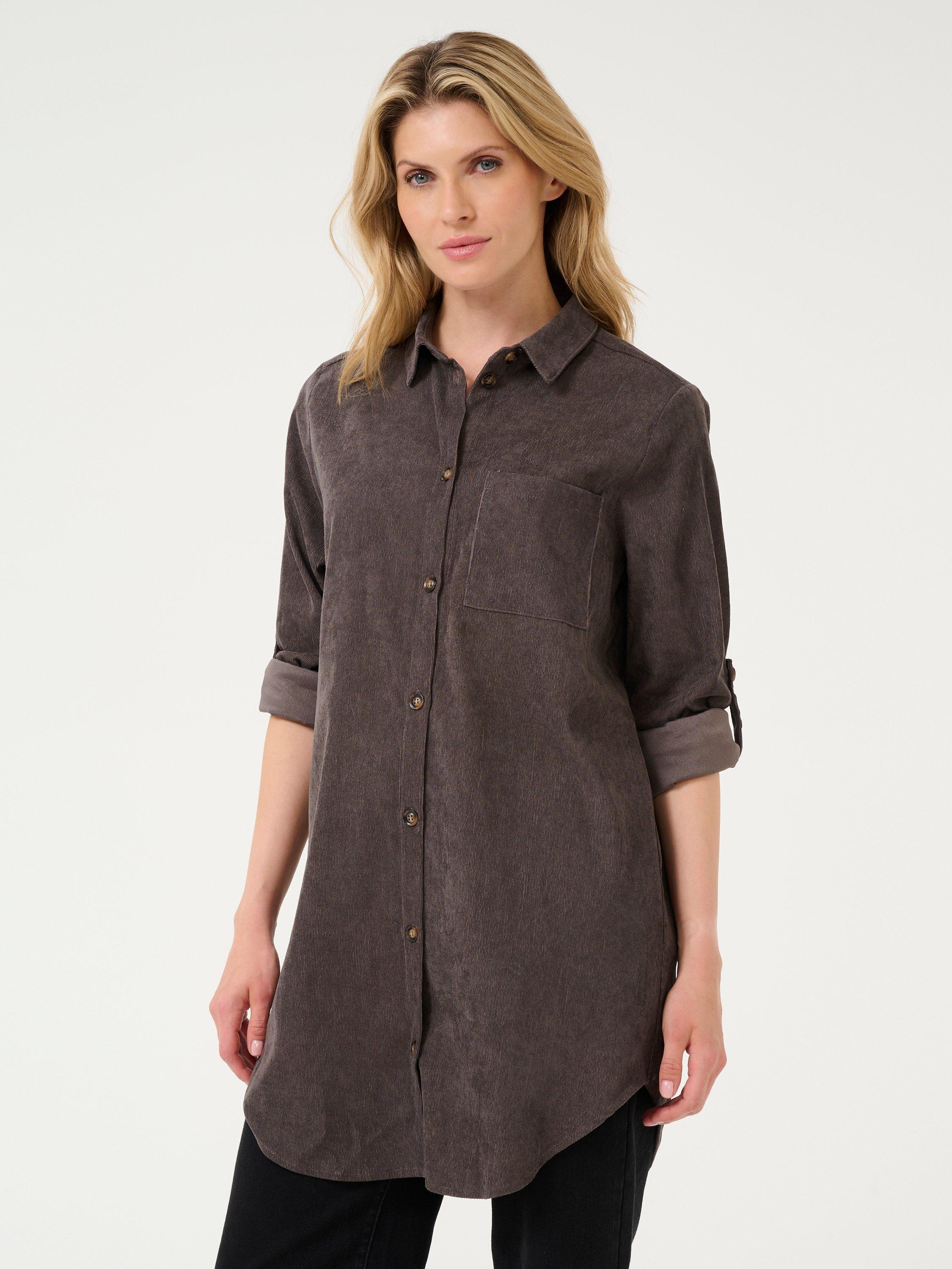 The vera tunic is a casual shirt, and a great addition to your everyday wardrobe. It has a spread collar and button fastening, and it has a patch chest pocket. The tunic is cut above the knees and has a rounded hem, and the sleeves are long with buttoned roll tabs.