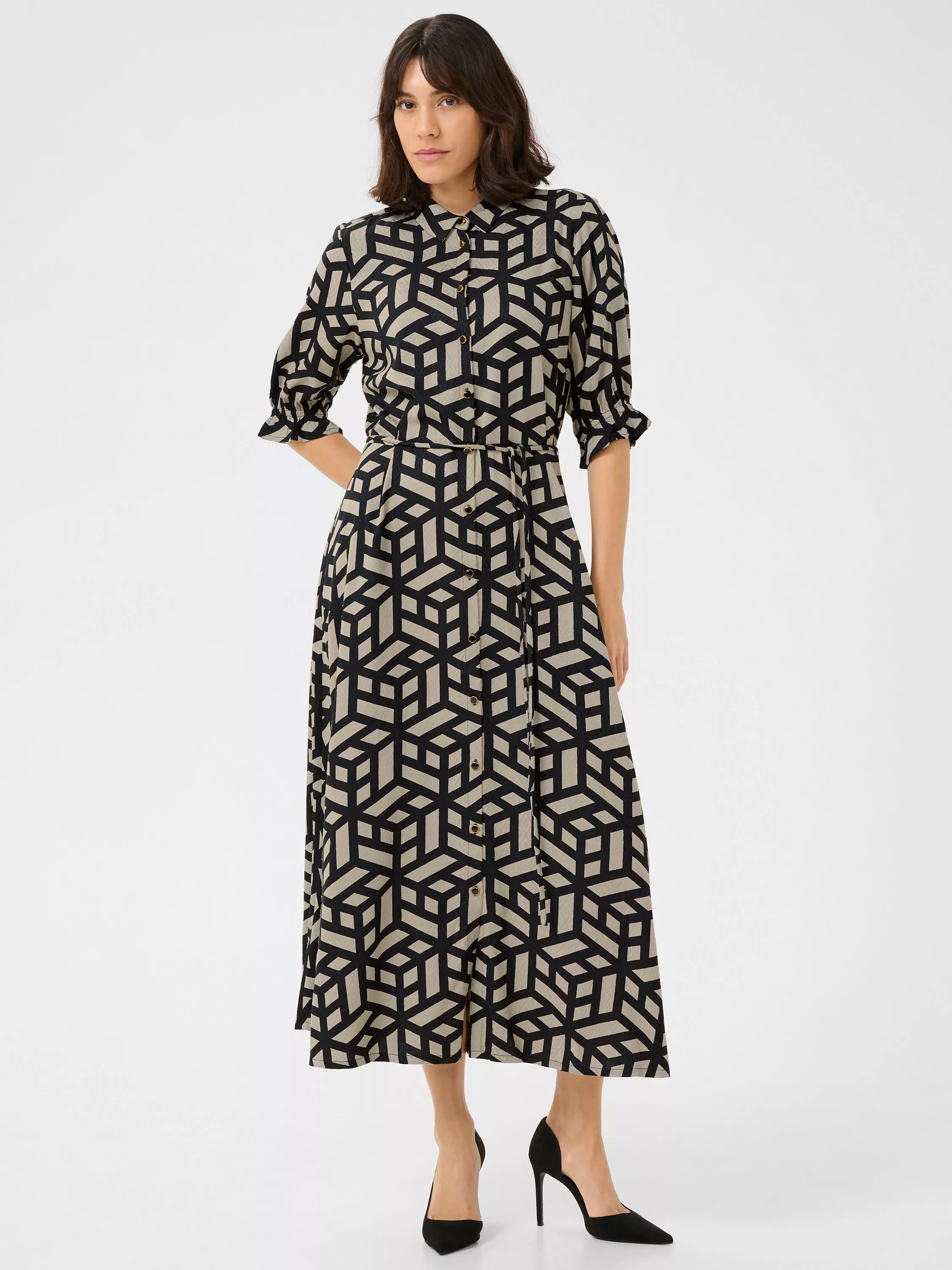 The veronica maxi dress is a casual shirt dress in a great print. It has a spread collar and button fastening, and it has a relaxed fit with a narrow tying belt at the waist. The sleeves are half-length and gathered in a frilled, elastic edge.