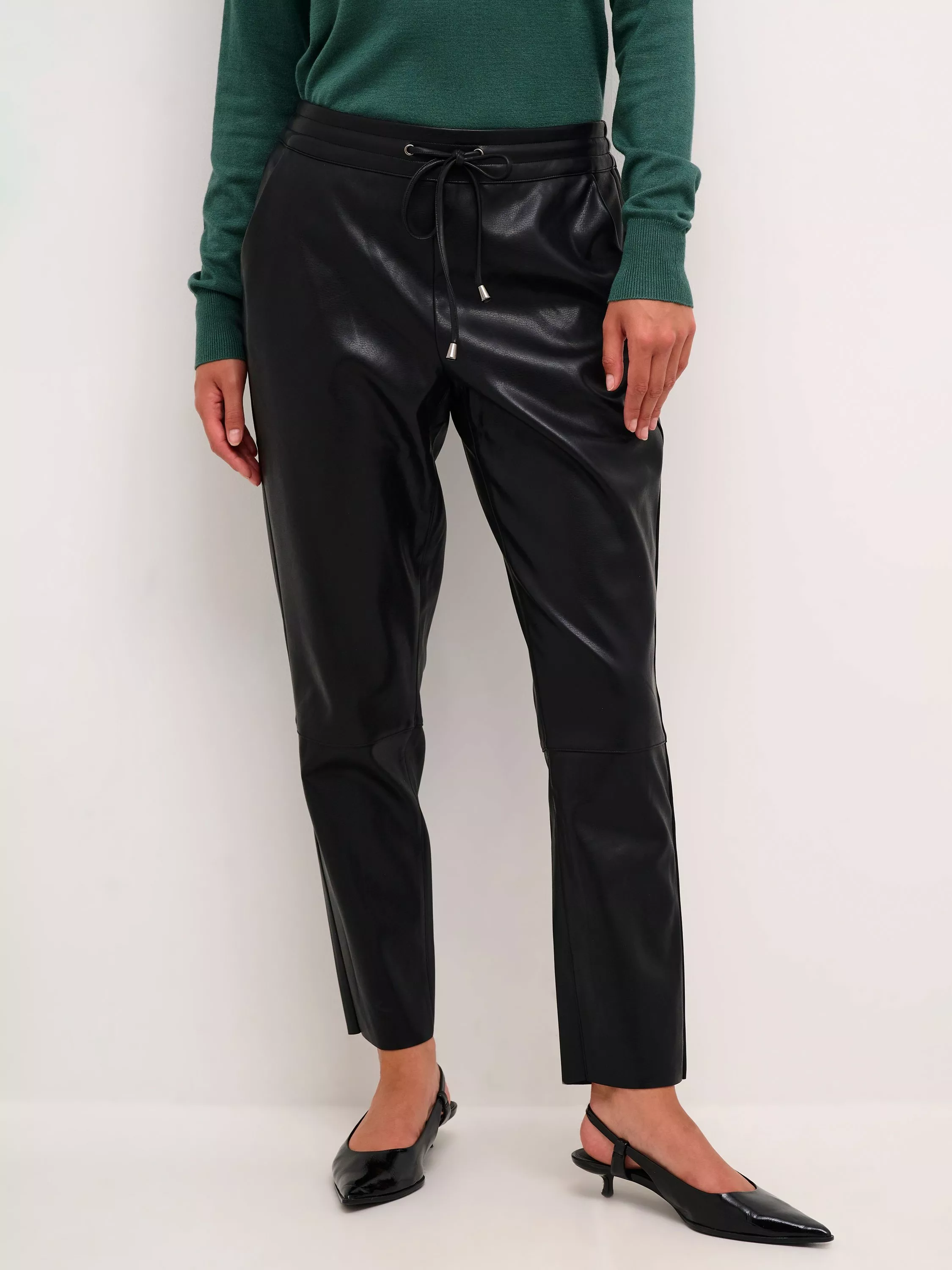 The villa joggers are a super cool pair of pants, and a great alternative to jeans. They are made in a faux leather fabric and have tapered, cropped legs. The pants are high-waisted with an elastic drawstring waistband. They have jetted back pockets and oblique front pockets.