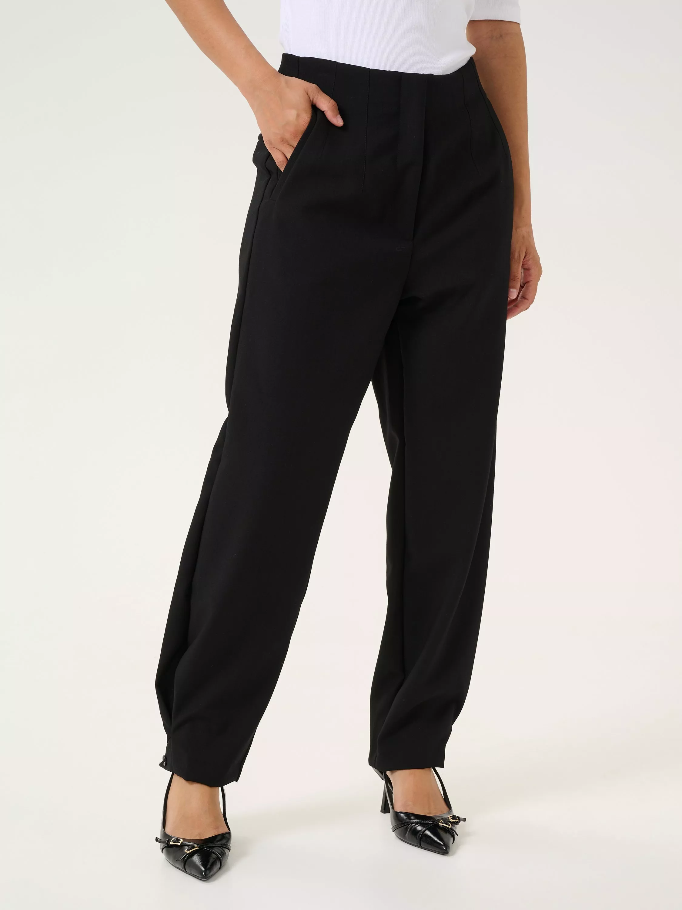 The vitta trousers are a cool and simple pair of trousers with lots of styling options. They are high-waisted with pleats and a hidden waistband, and they have a casual fit with tapered legs that are fastened with a button at the hem. The trousers have slanted front pockets and welted back pockets, and they are full-length.