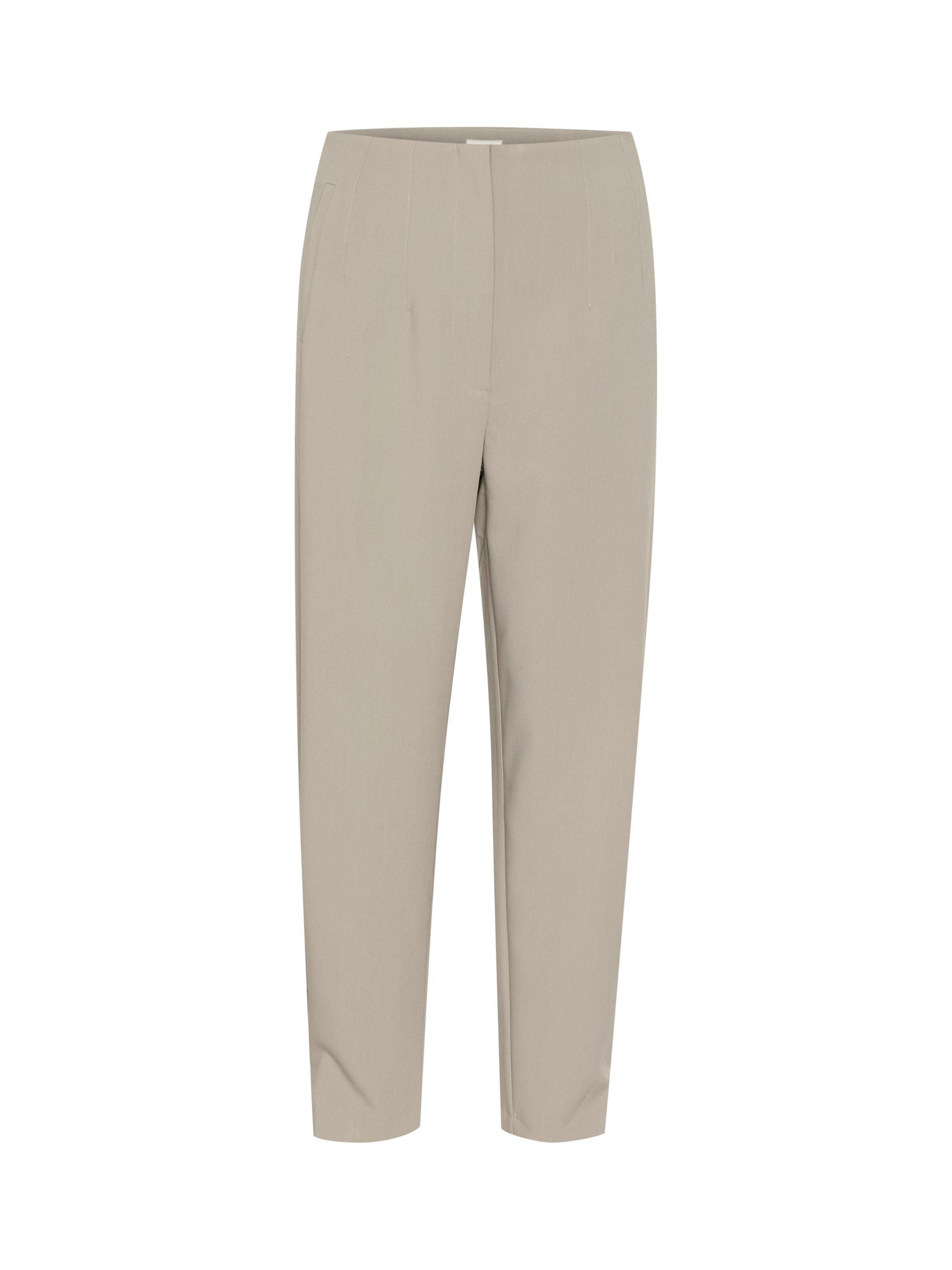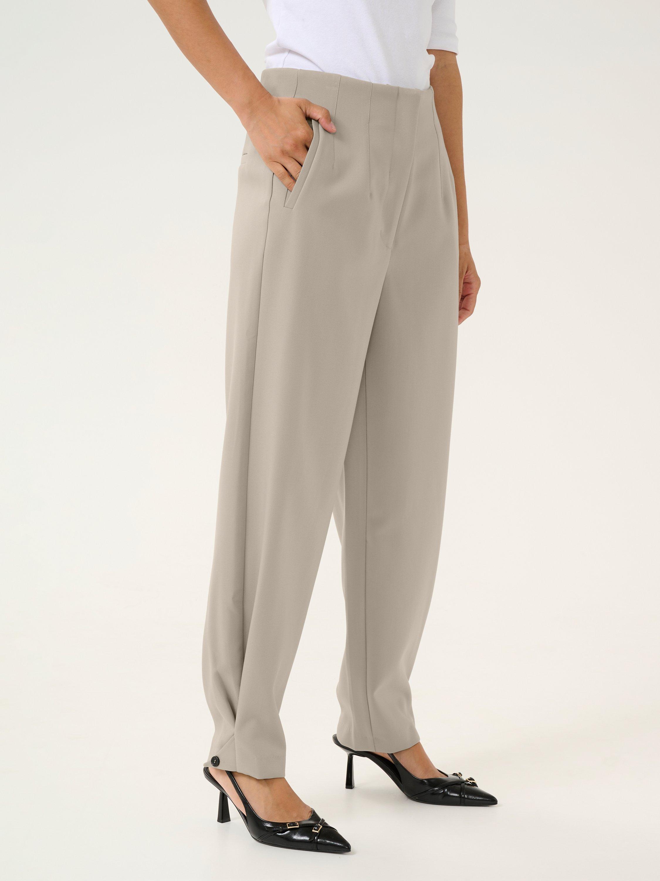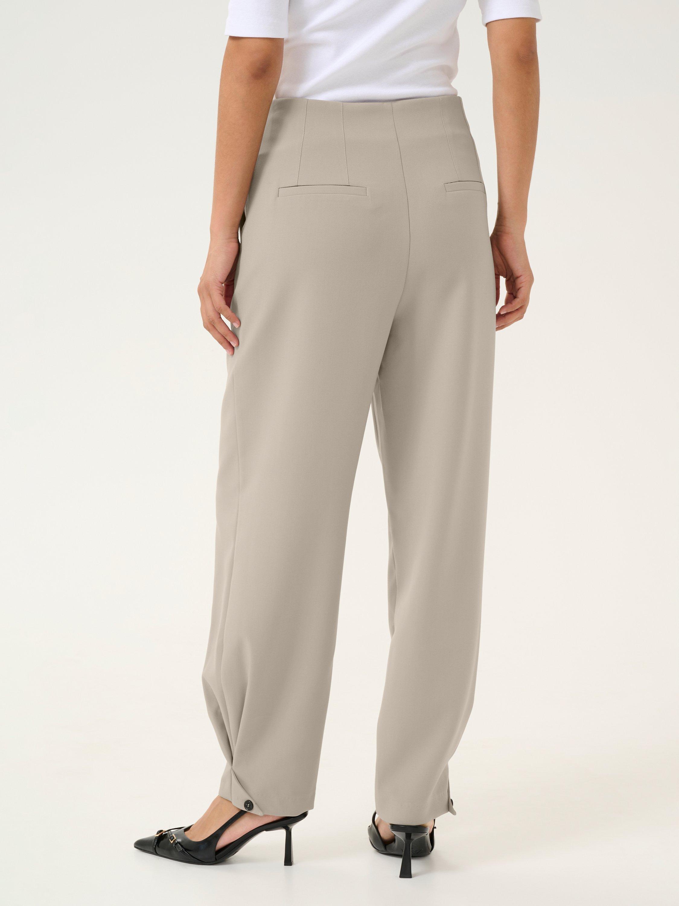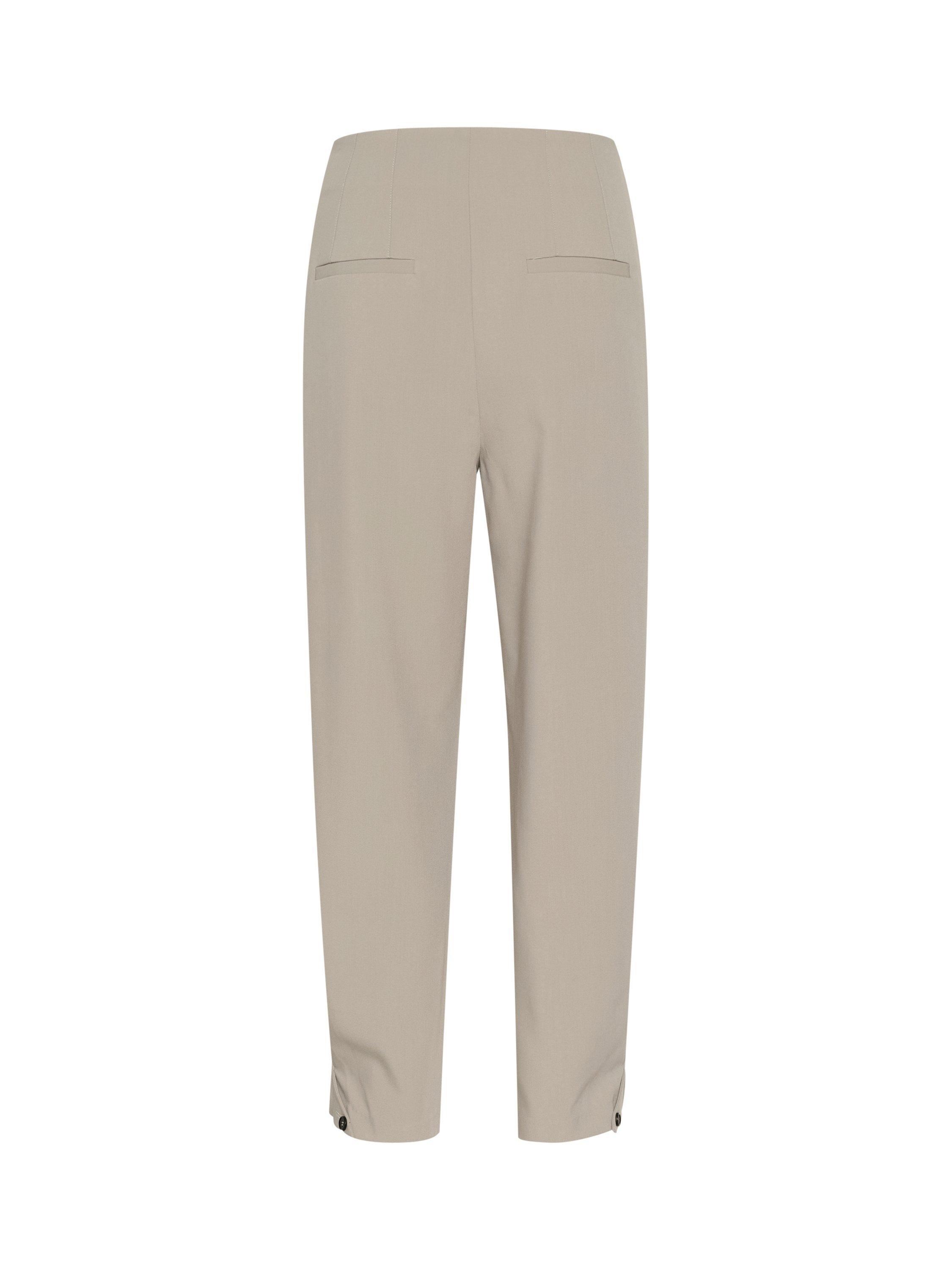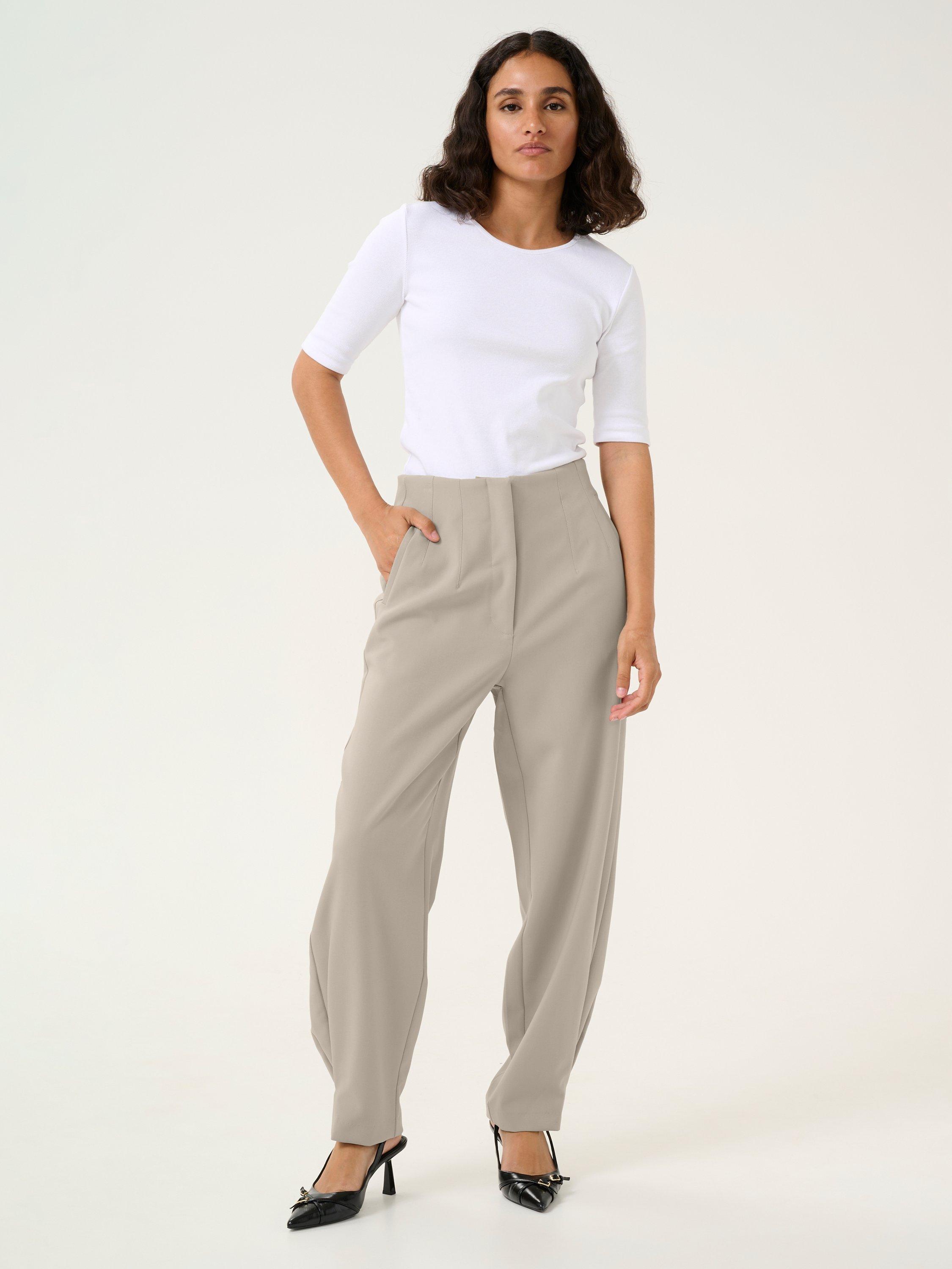 The vitta trousers are a cool and simple pair of trousers with lots of styling options. They are high-waisted with pleats and a hidden waistband, and they have a casual fit with tapered legs that are fastened with a button at the hem. The trousers have slanted front pockets and welted back pockets, and they are full-length.
