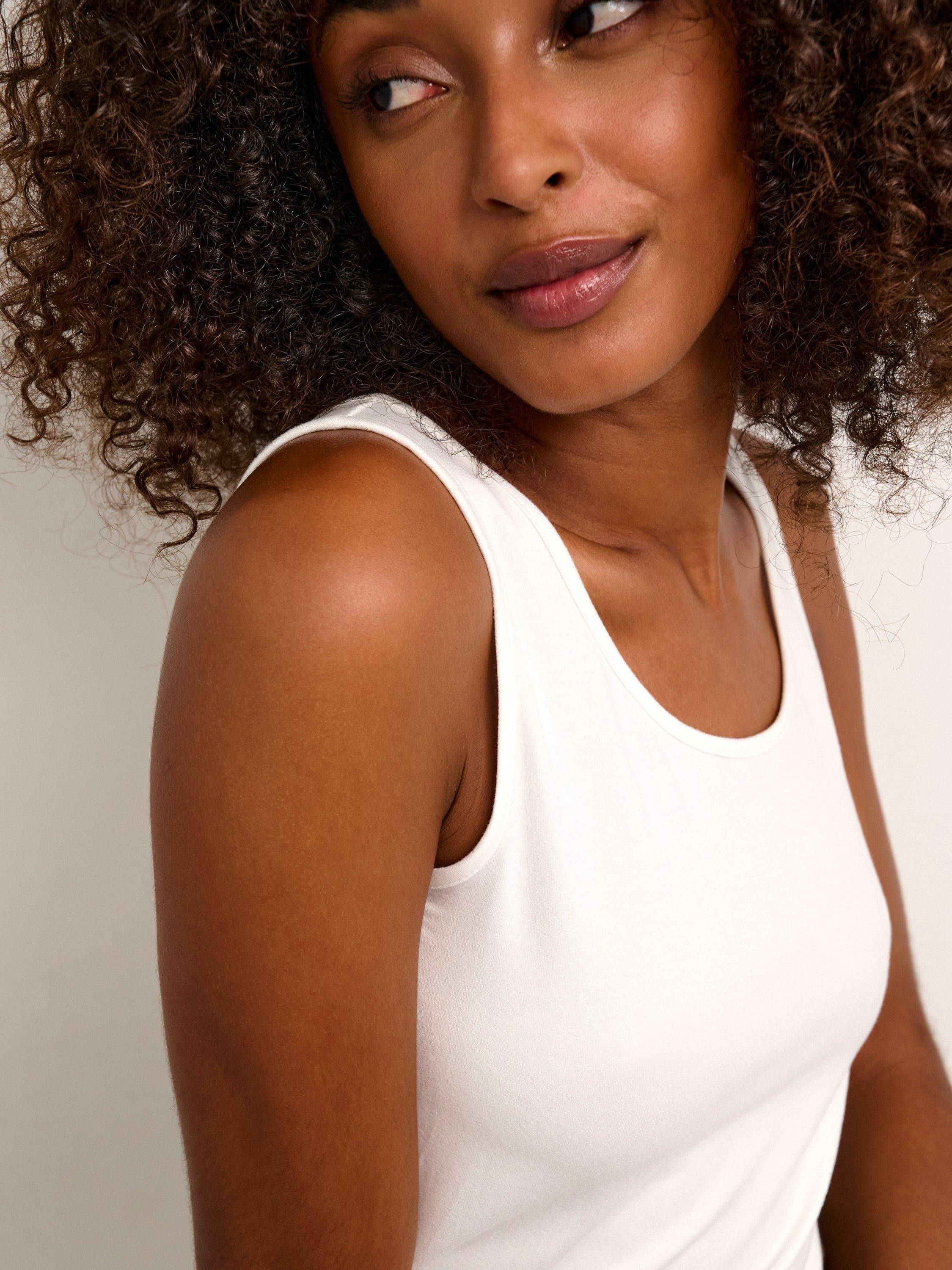 The yoko tank top is a simple and minimalistic top, and it is a must-have item in any wardrobe. It has a scoop neck and narrow straps, and it has a slim fit. The top is made in a soft and stretchy jersey fabric, and it is cut at the hips.