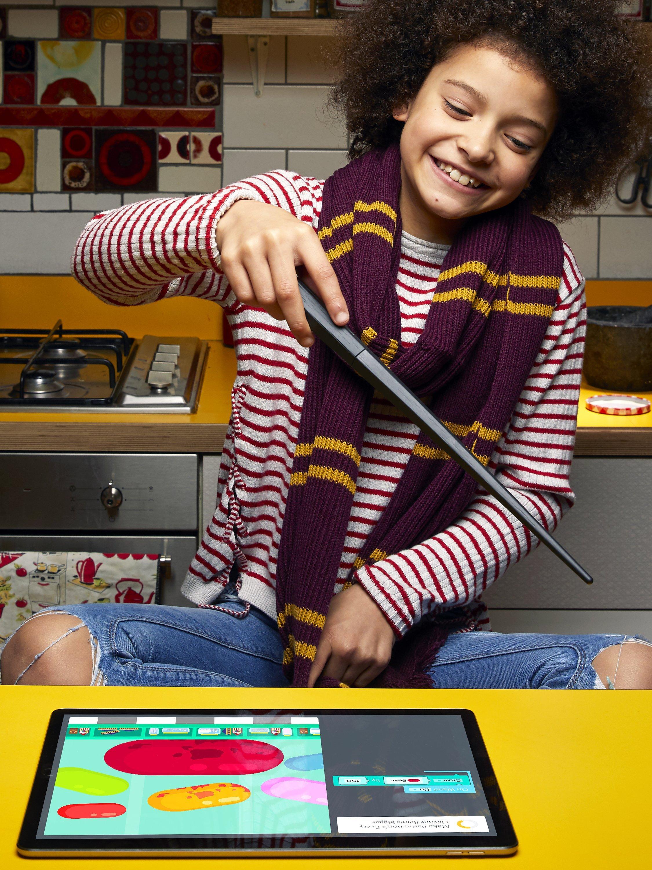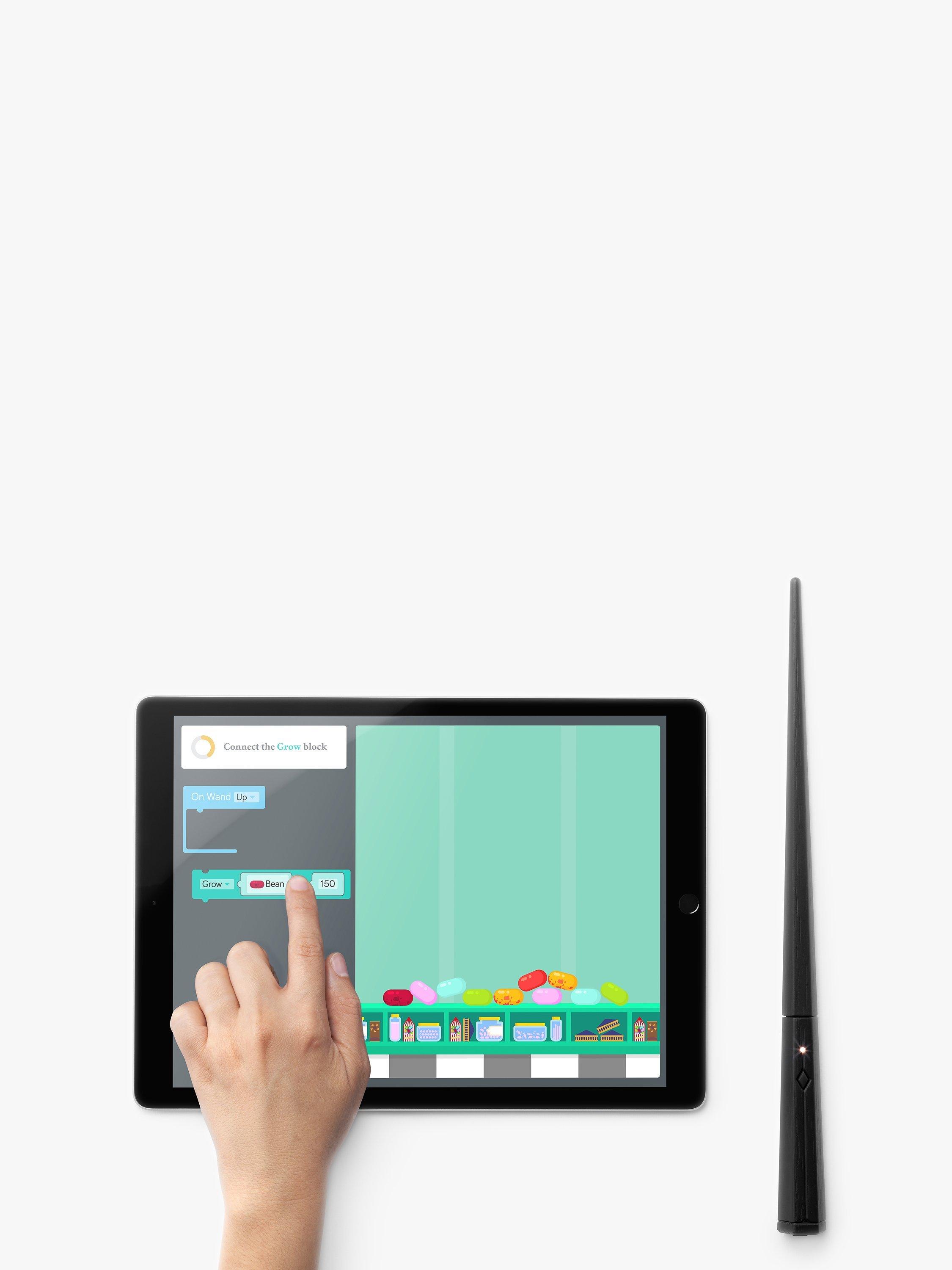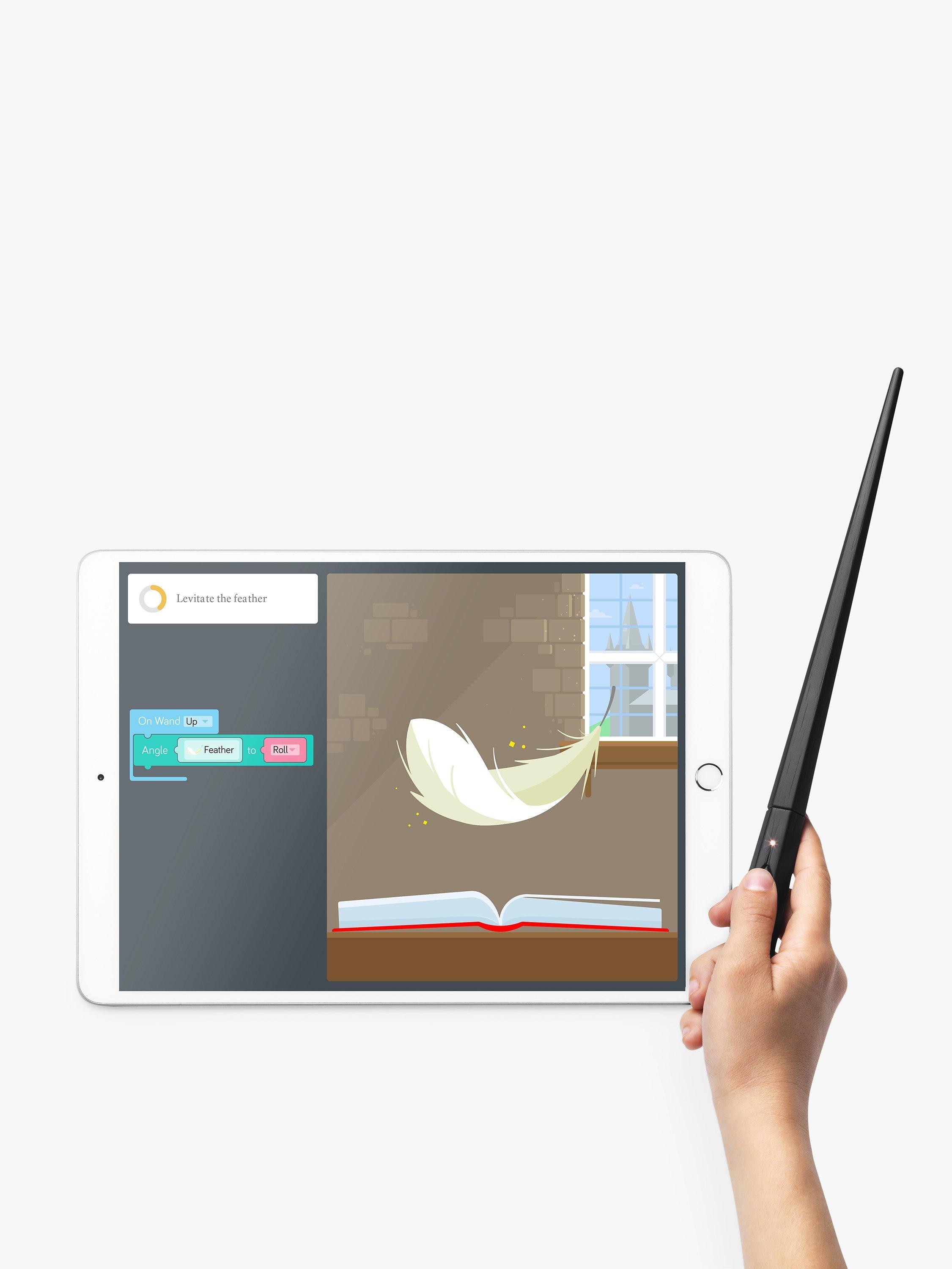 This is the first wand of its kind. It knows if you're moving it up, down, left, right, forwards, backwards, fast or slow and there are 70+ step-by-step challenges aid you on your coding journey. Connect code blocks, see the JavaScript, learn about loops, logic, and variables.