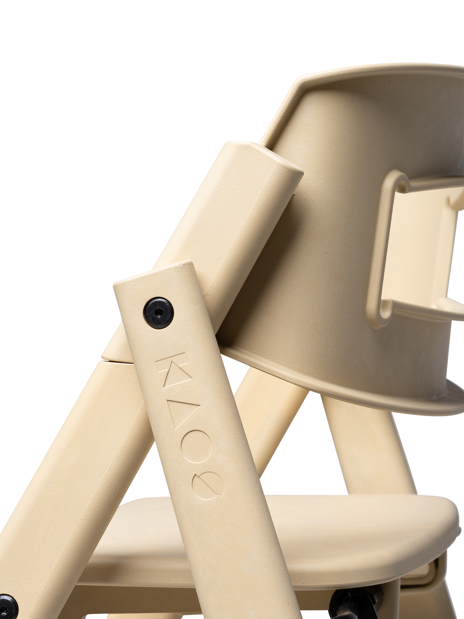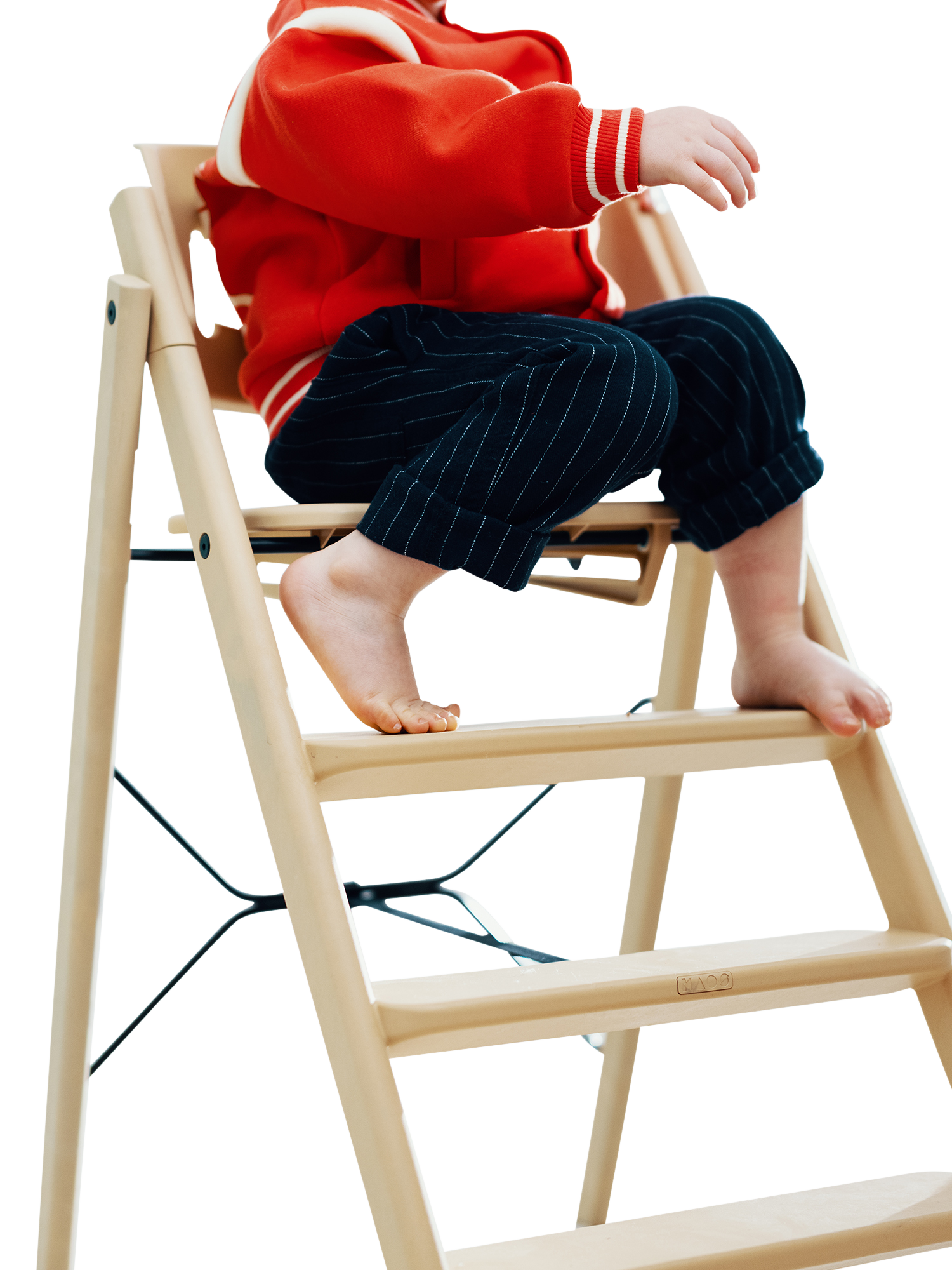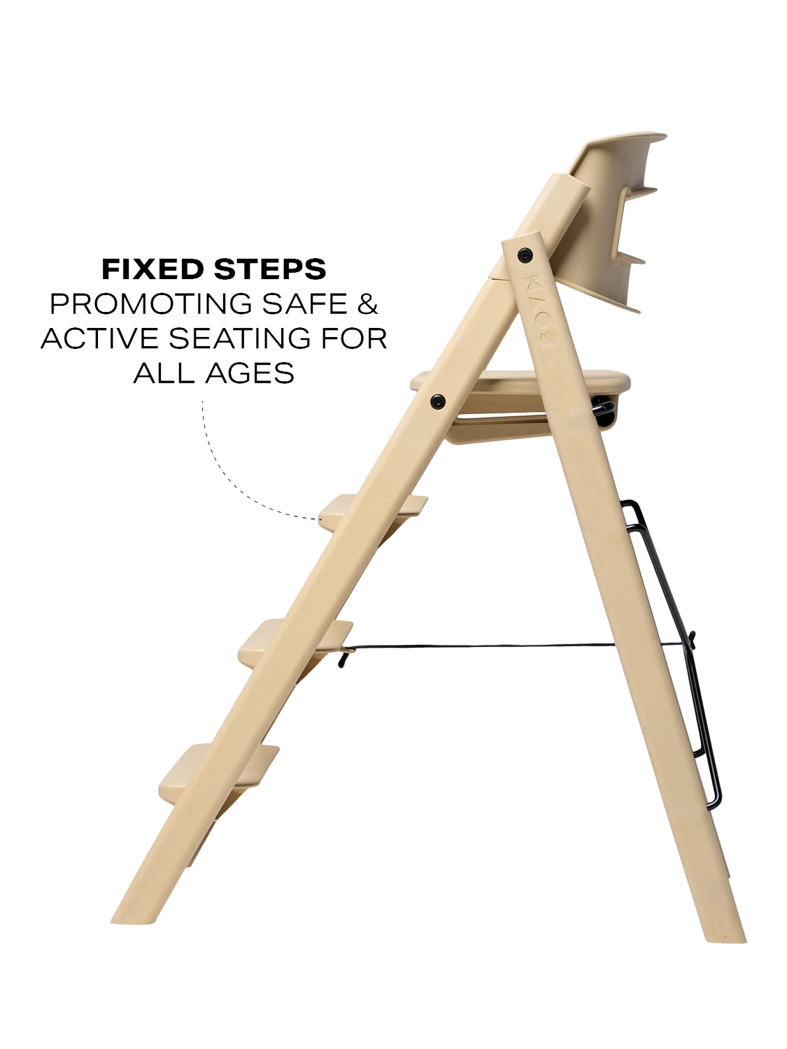 The design is based on the analogy of a staircase, where users of different sizes can sit down and quickly find a natural and good sitting position. The human body was developed to move, and KAOS Klapp allows the child to automatically change position, maintaining a natural movement. The fixed step ladders should never be adjusted so that the child can climb up and down from the chair themselves, fostering a great feeling of mastery from early on. As the child grows, the feet will find a natural, ergonomic position on various steps, providing a stable footrest at all times.