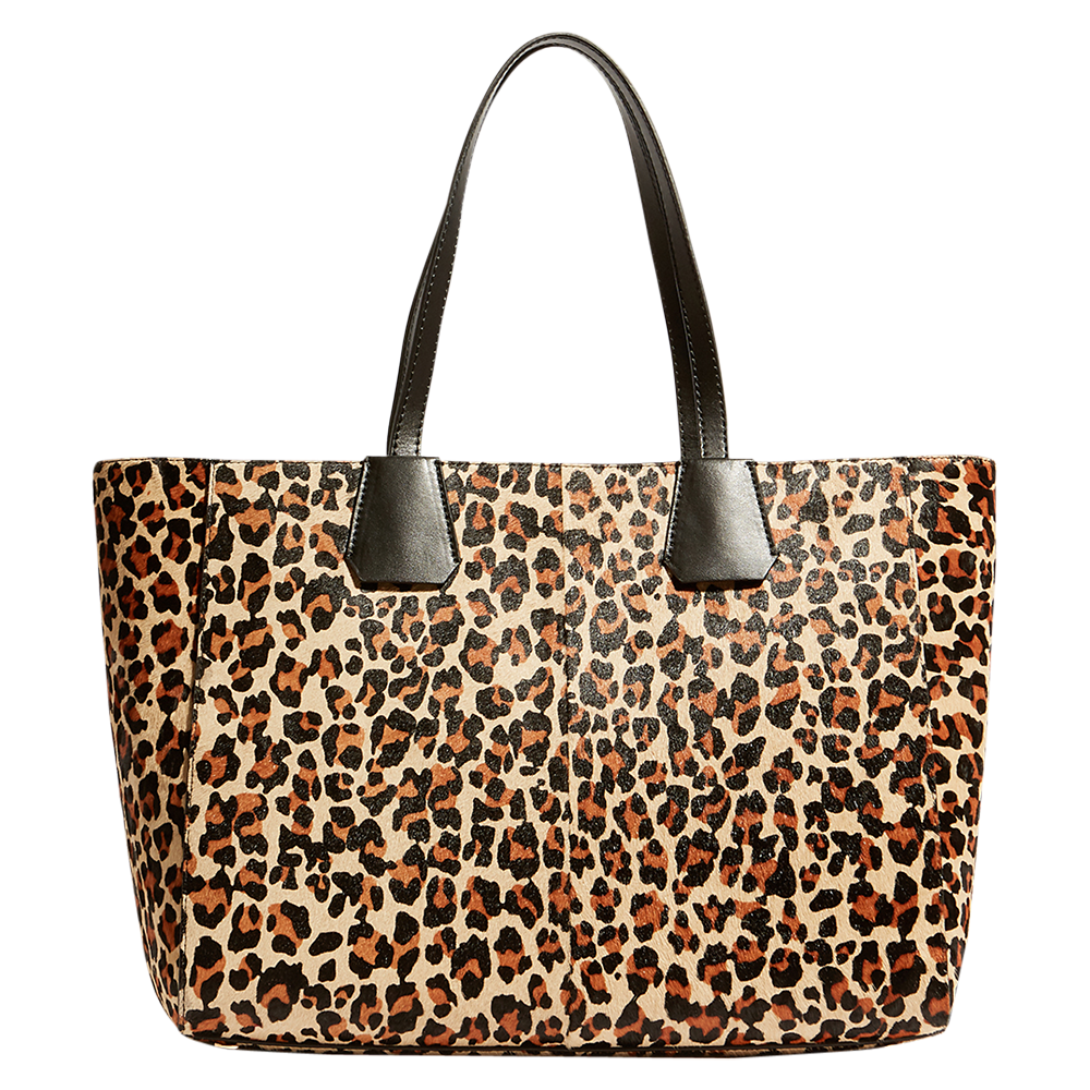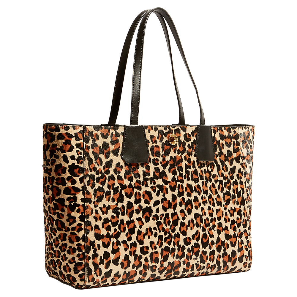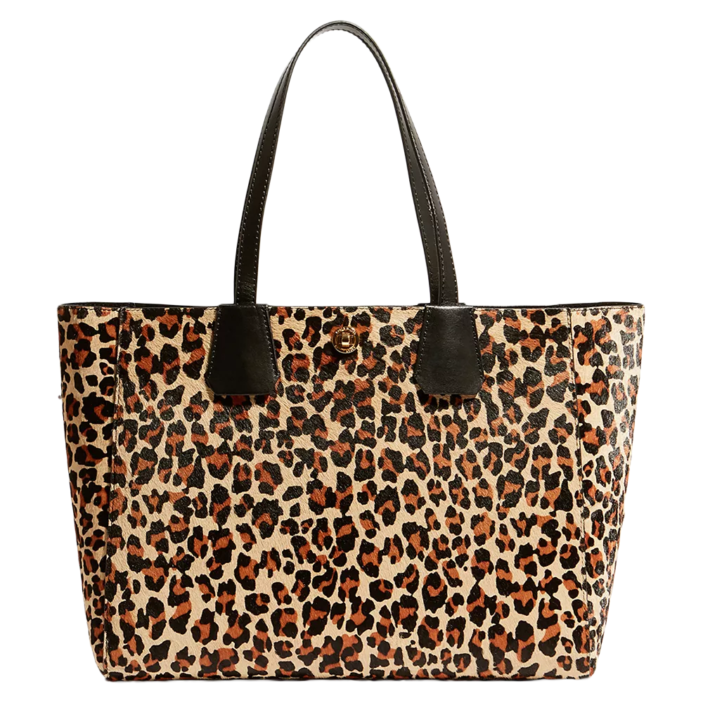 Crafted from soft leather and adorned with an eye-catching leopard print, this bag is complete with contrast handles for an easy-carry style.