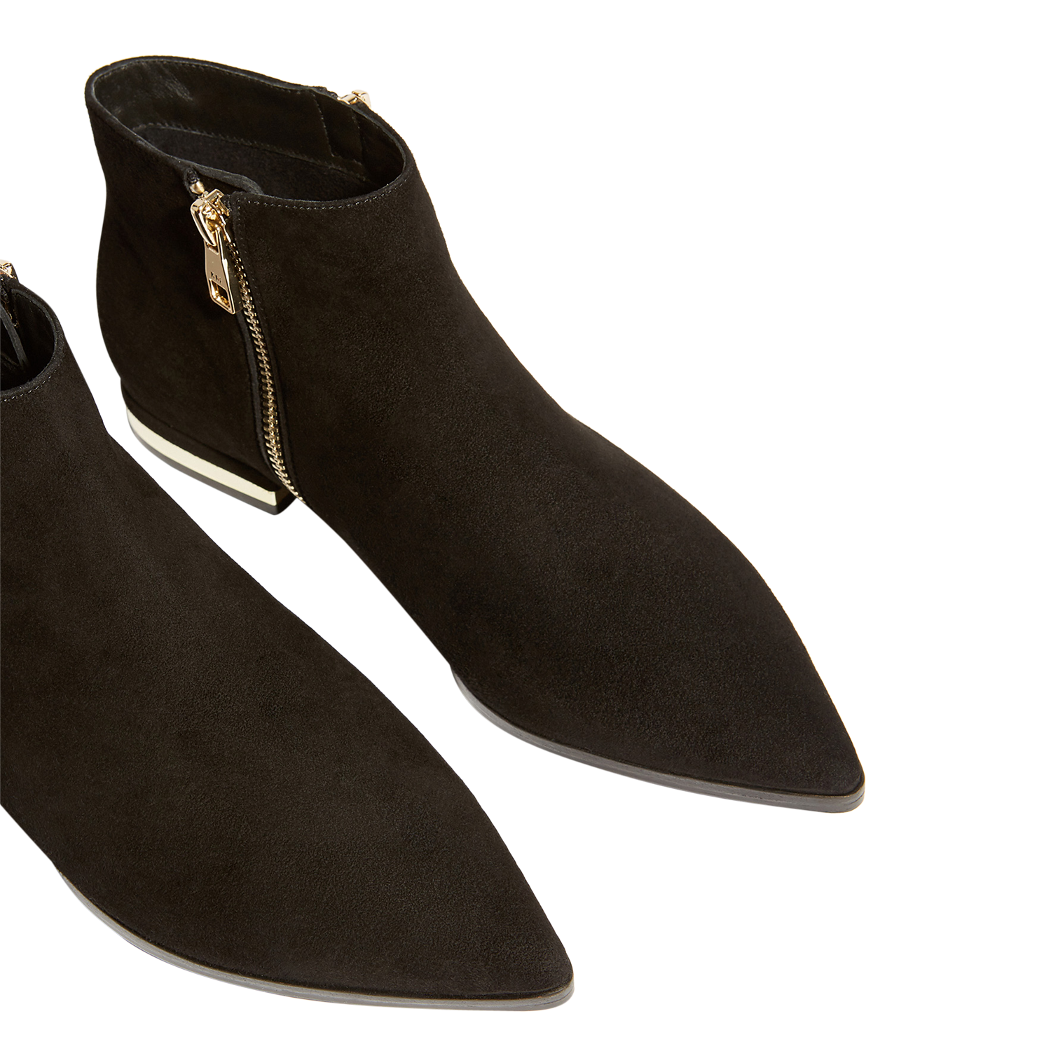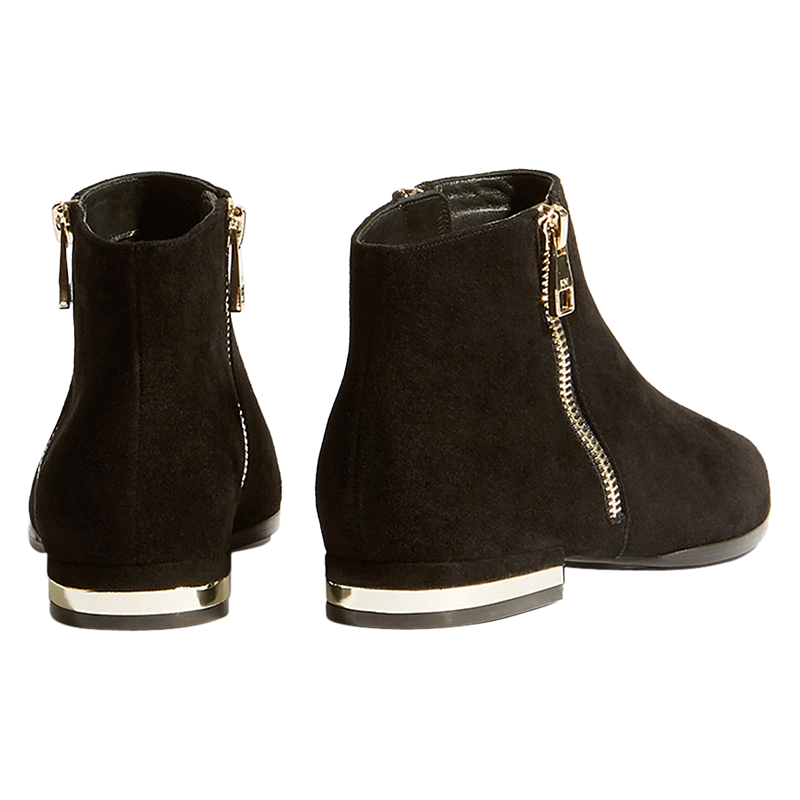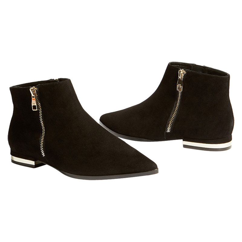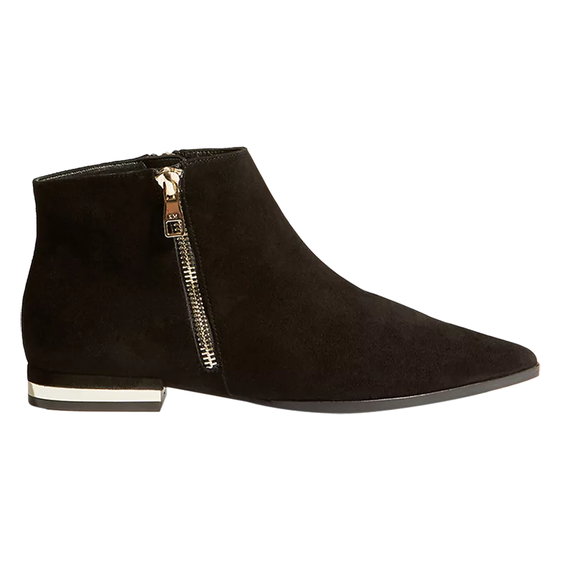 Crafted from soft suede, this sleek style features a pointed toe, double zip closure to either side and metallic detailing on the heel for an elevated touch.