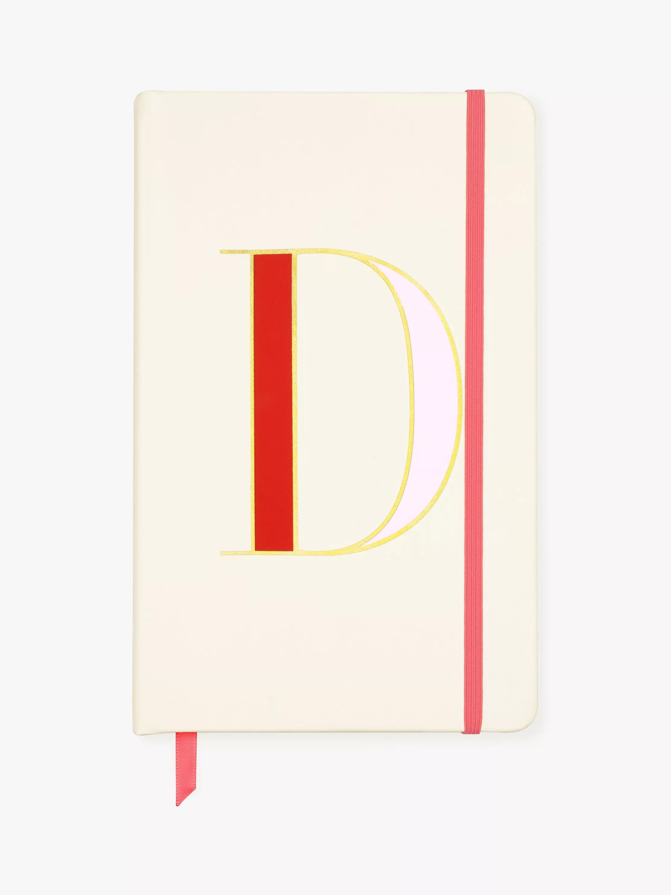 Initial here: kate spade new york's take note A5 notebook features a leather-like cover, gold foil detail, a ribbon bookmark, interior pocket to hold loose papers, and 168 lined pages to hold your thoughts.