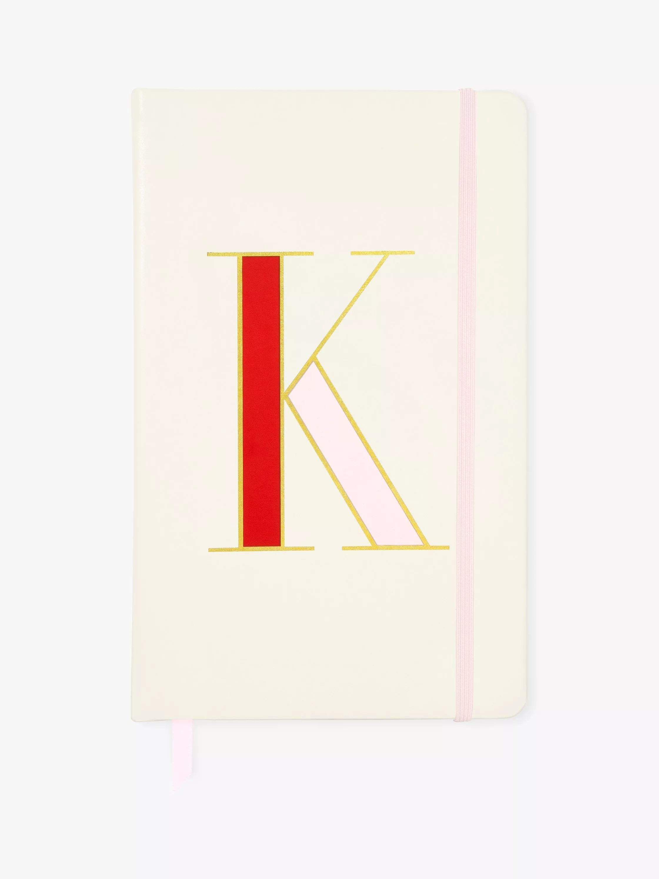 Initial here: kate spade new york's take note A5 notebook features a leather-like cover, gold foil detail, a ribbon bookmark, interior pocket to hold loose papers, and 168 lined pages to hold your thoughts.
