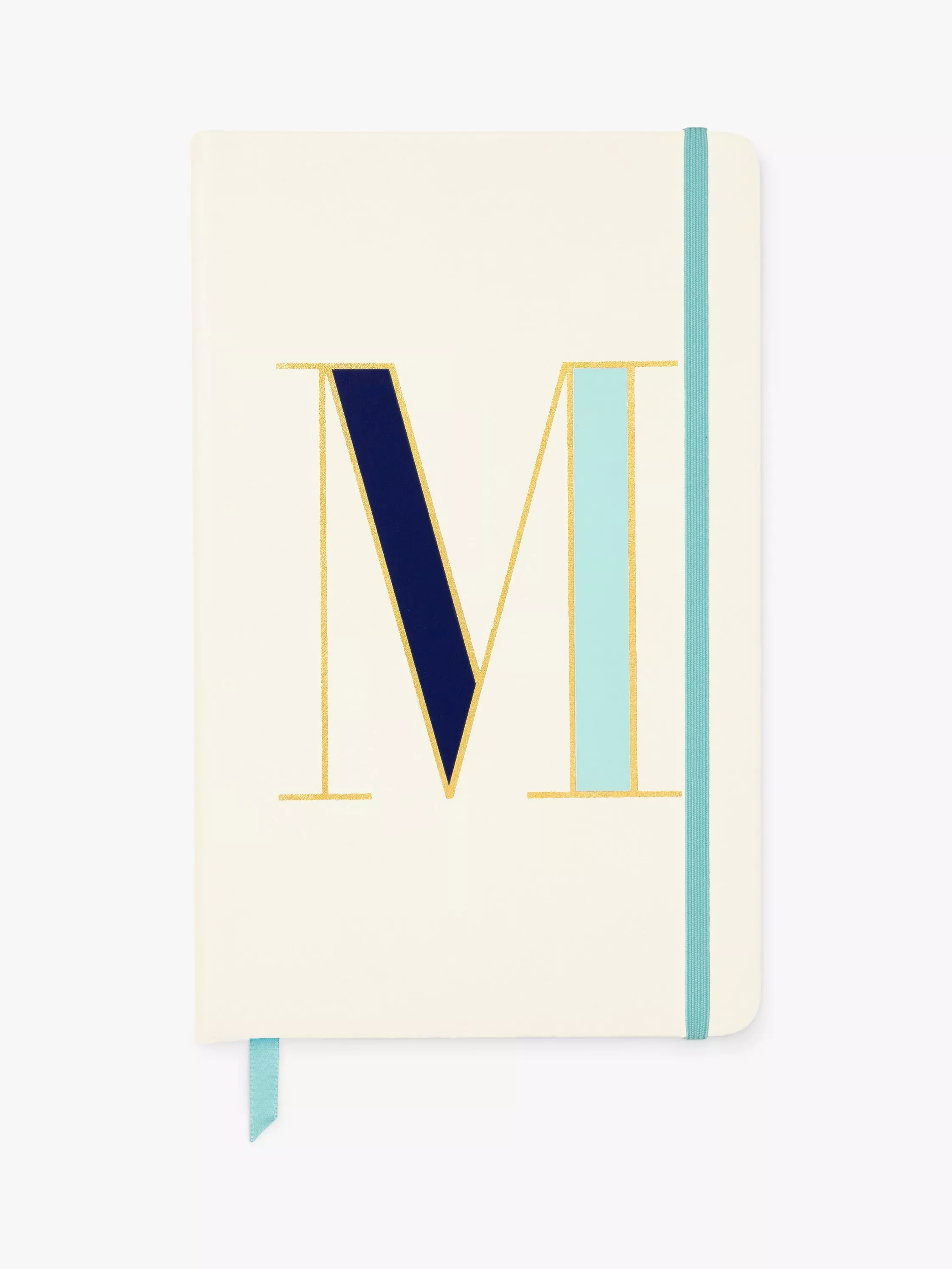 Initial here: kate spade new york's take note A5 notebook features a leather-like cover, gold foil detail, a ribbon bookmark, interior pocket to hold loose papers, and 168 lined pages to hold your thoughts.