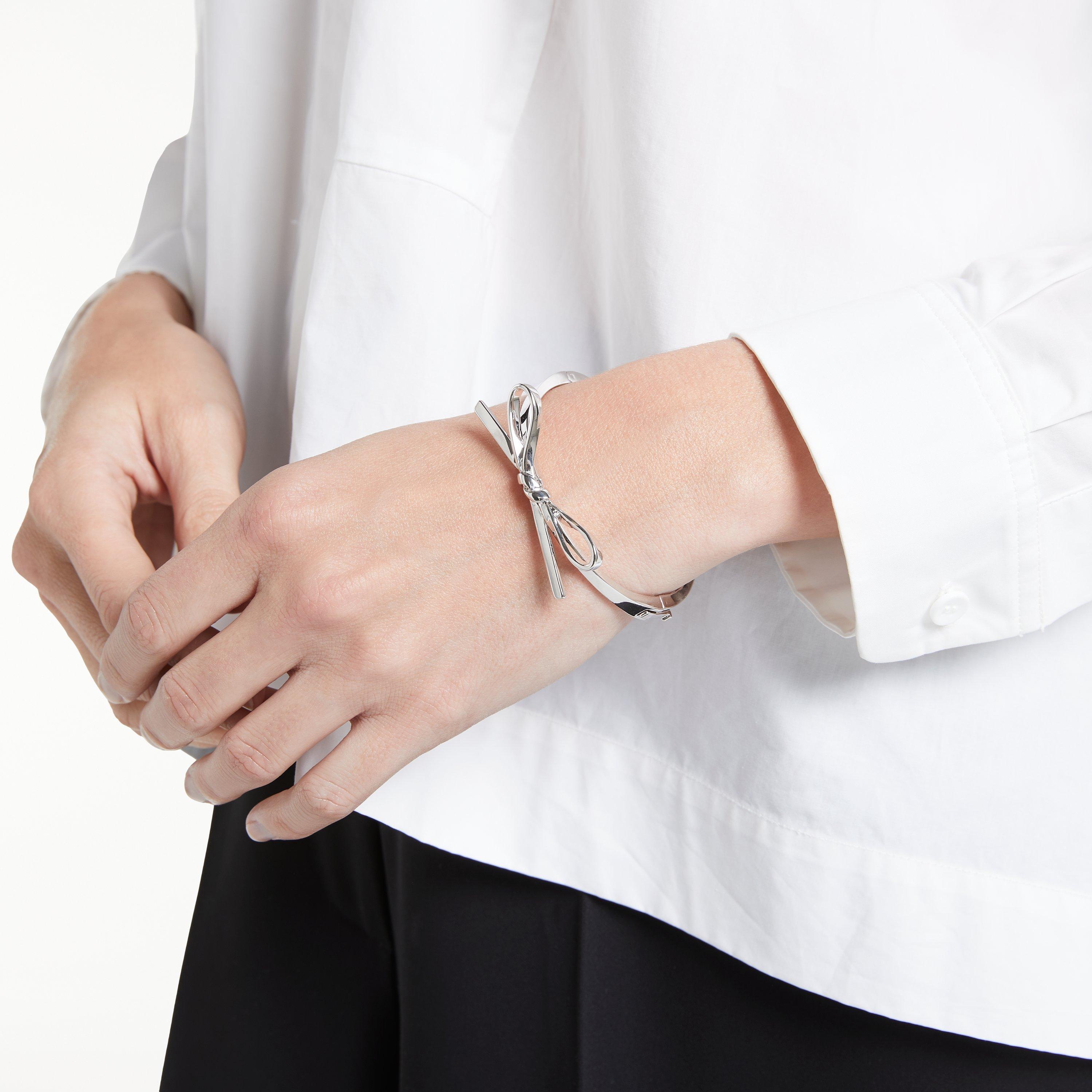 Offering a skinny design to flatter the wrist, the bangle presents a central bow element. A secure side clasp ensures secure and comfortable wear.