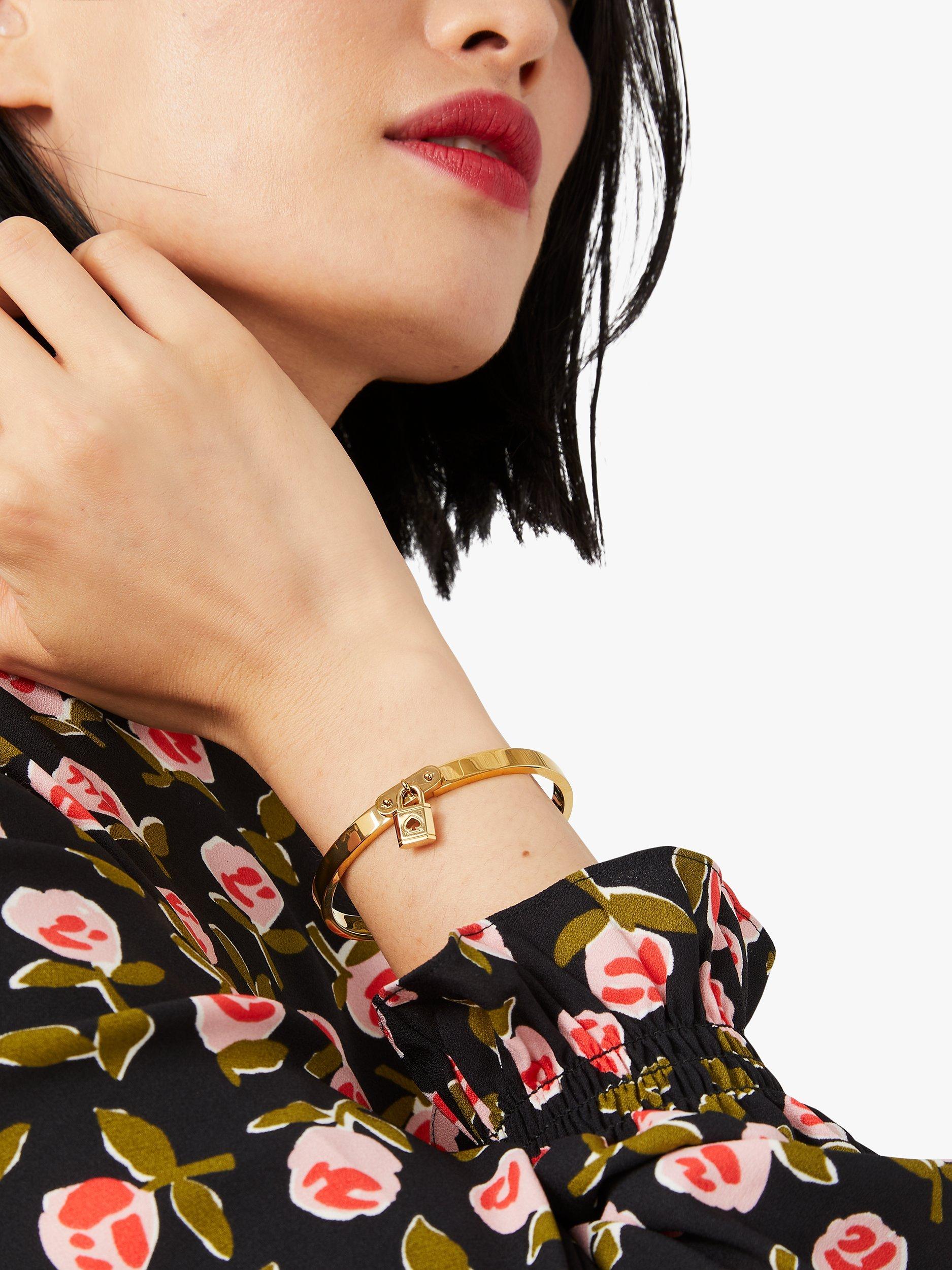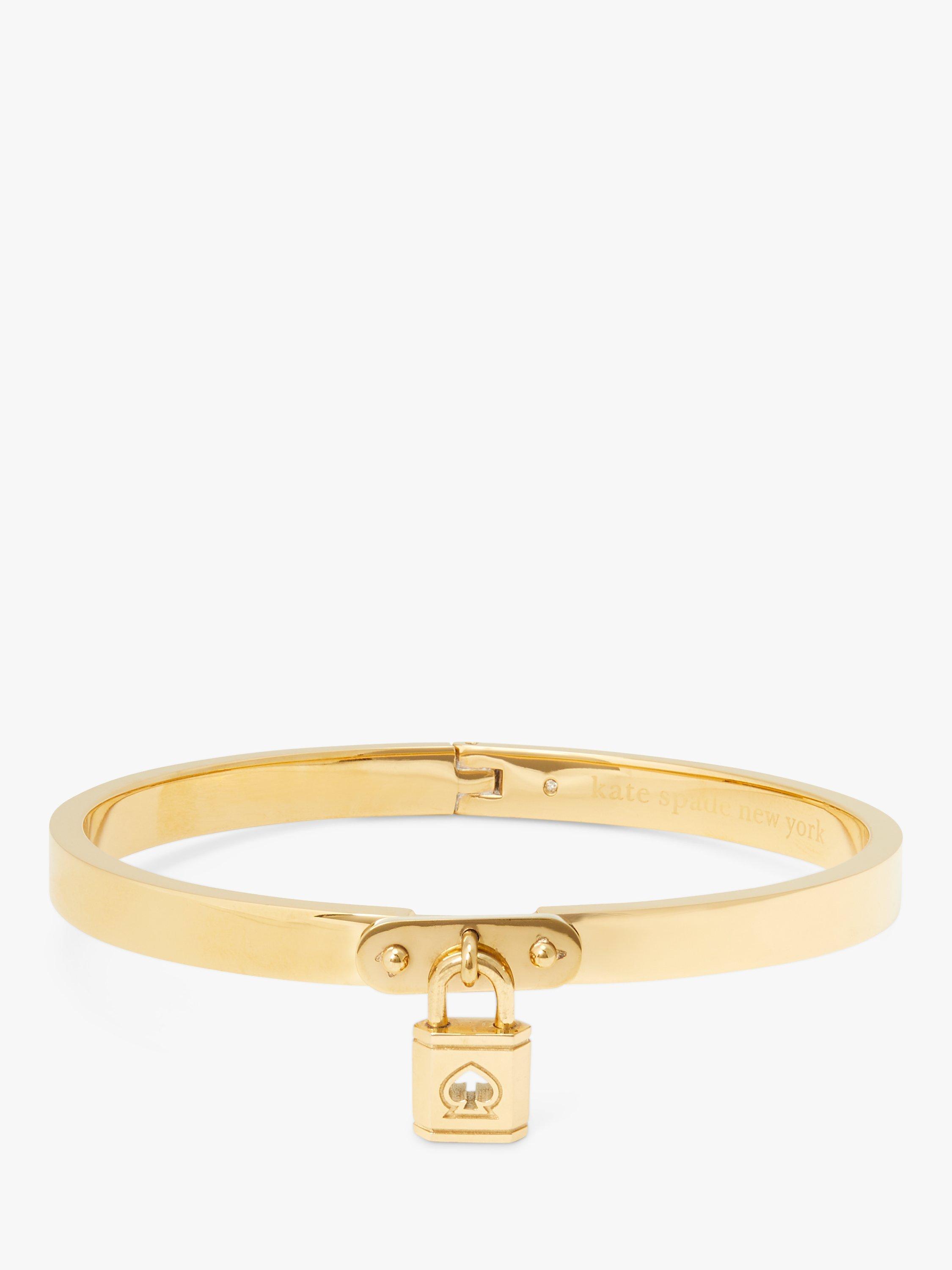 Simple and effortless style, this bracelet features a cute lock charm with the brand's signature spade cut out in the centre. The hinged bangle is secured with a push clasp for easy on and offs.