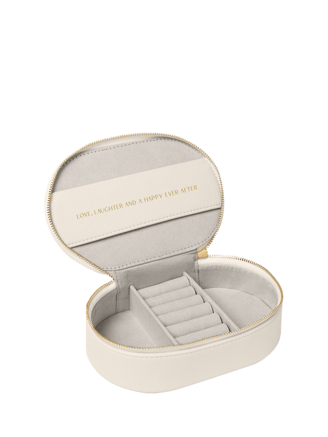This oval jewellery box from Katie Loxton features an open compartment for necklaces and bracelets, while dedicated earrings and ring rolls will keep their gems sparkling. Complete with the one-word golden sentiment "Bride", it makes the perfect wedding or engagement gift.