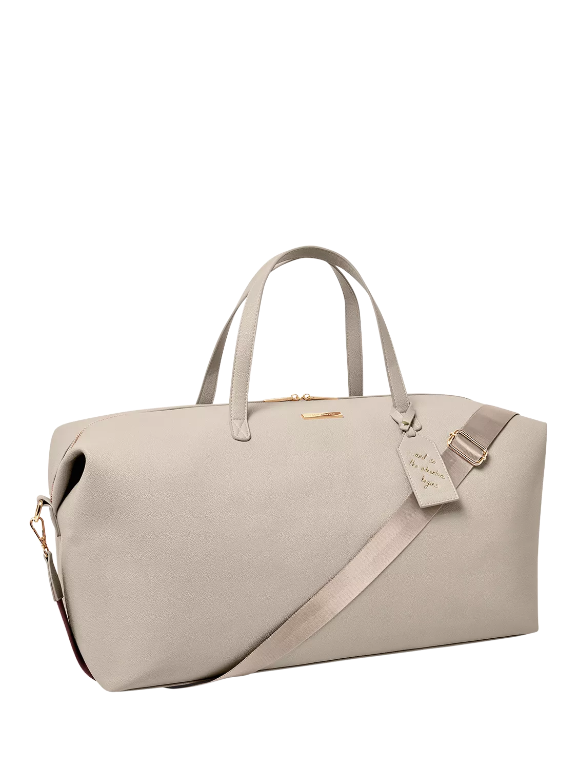 Roomy enough for all your overnight essentials, it is completed with a sweet sentiment emblazoned luggage tag that reads '... and so the adventure begins.'