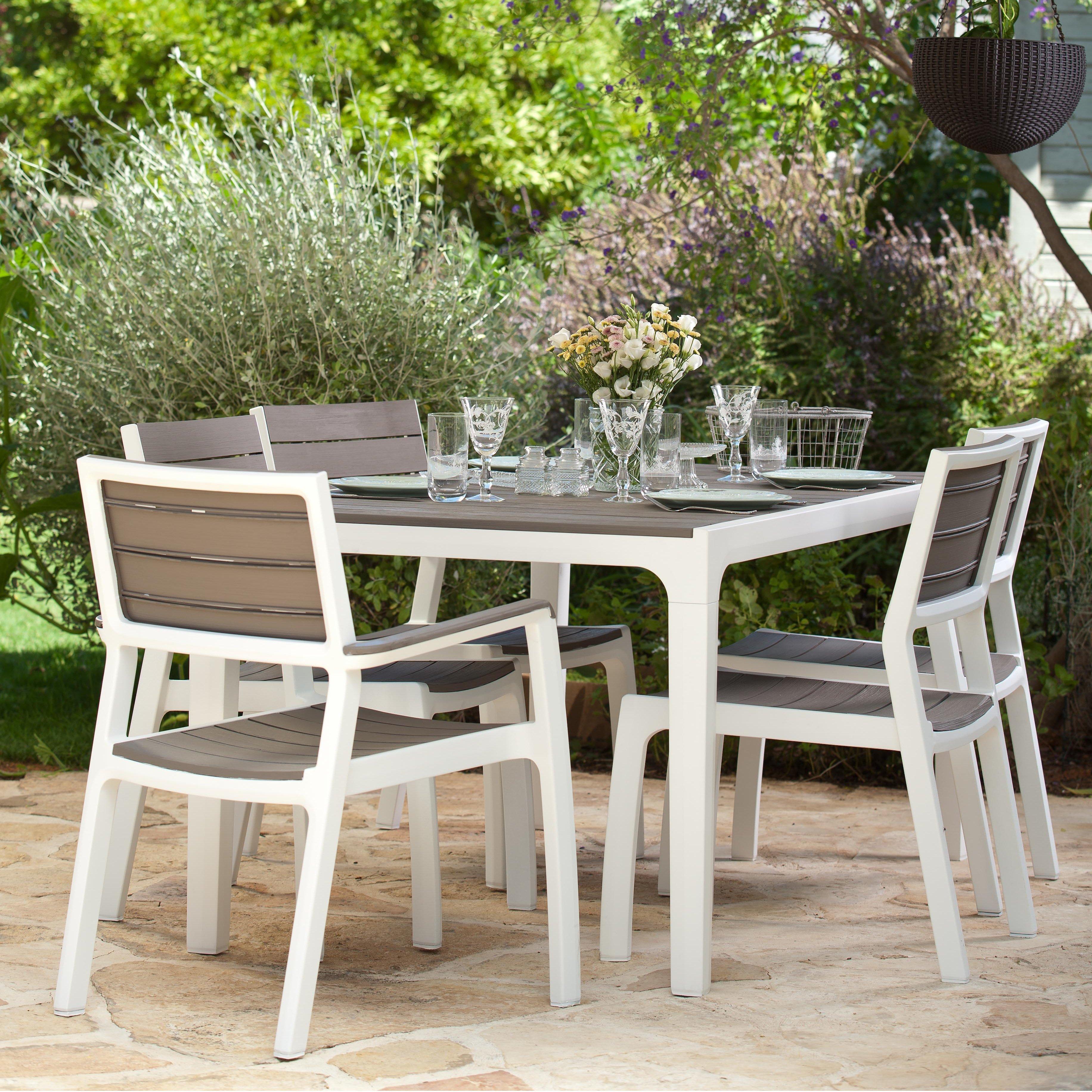 The distinctive appearance and beautiful design of the Harmony 6-Seat Dining Set offers your garden a modern and stylish setting to enjoy outdoor dining in your garden. Featuring a 6-seating table, four side chairs and two armchairs, all constructed with sturdy polypropylene frames and panelled finishes, this dining set provides you with a sumptuous sit for your summer barbecues.