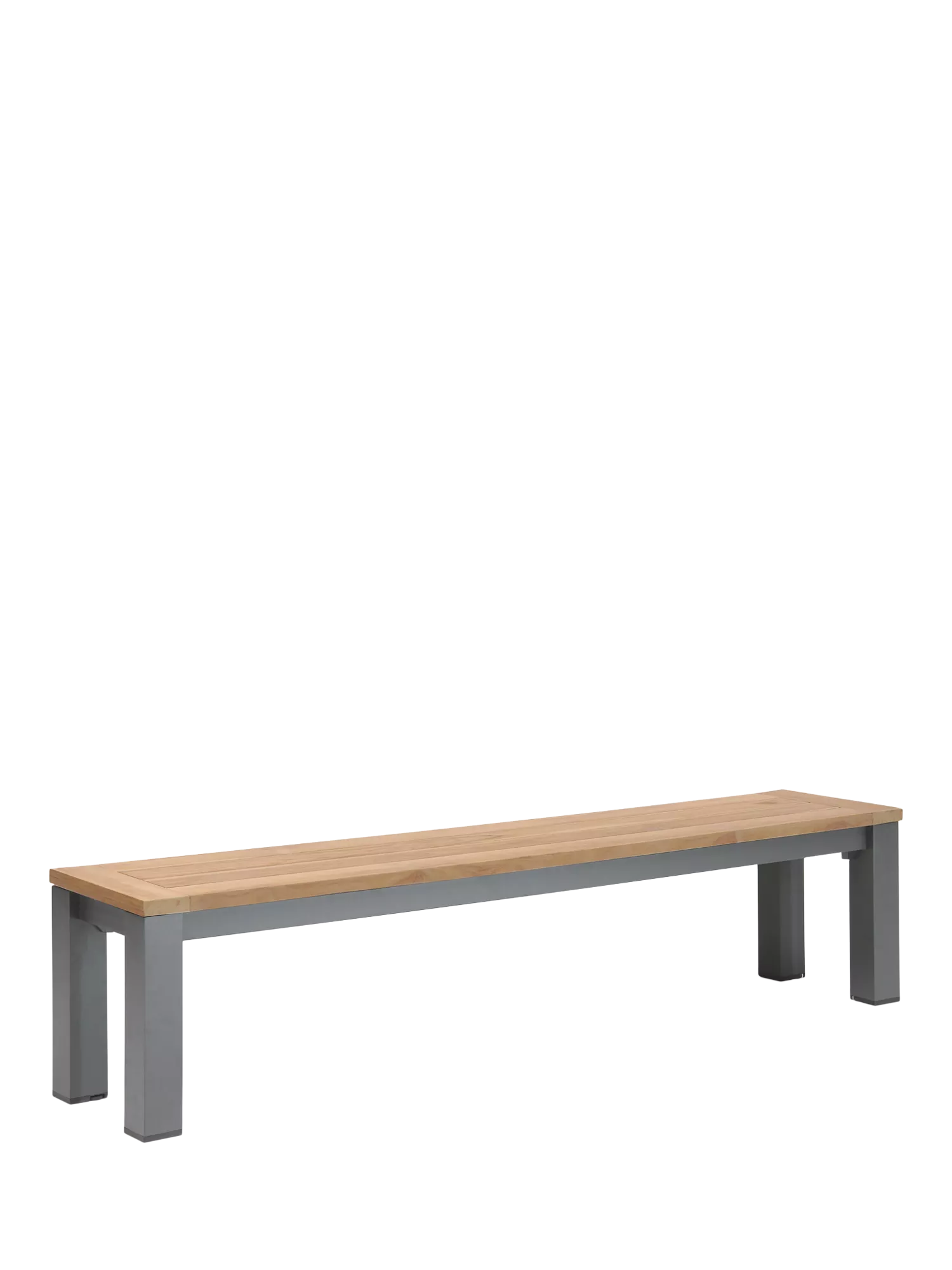 Elba dining bench with a robust aluminium frame and beautiful FSC-certified teak wood top. Matching the minimalist and modern design of the Elba range of outdoor furniture, the bench seats up to three people in the garden or conservatory.