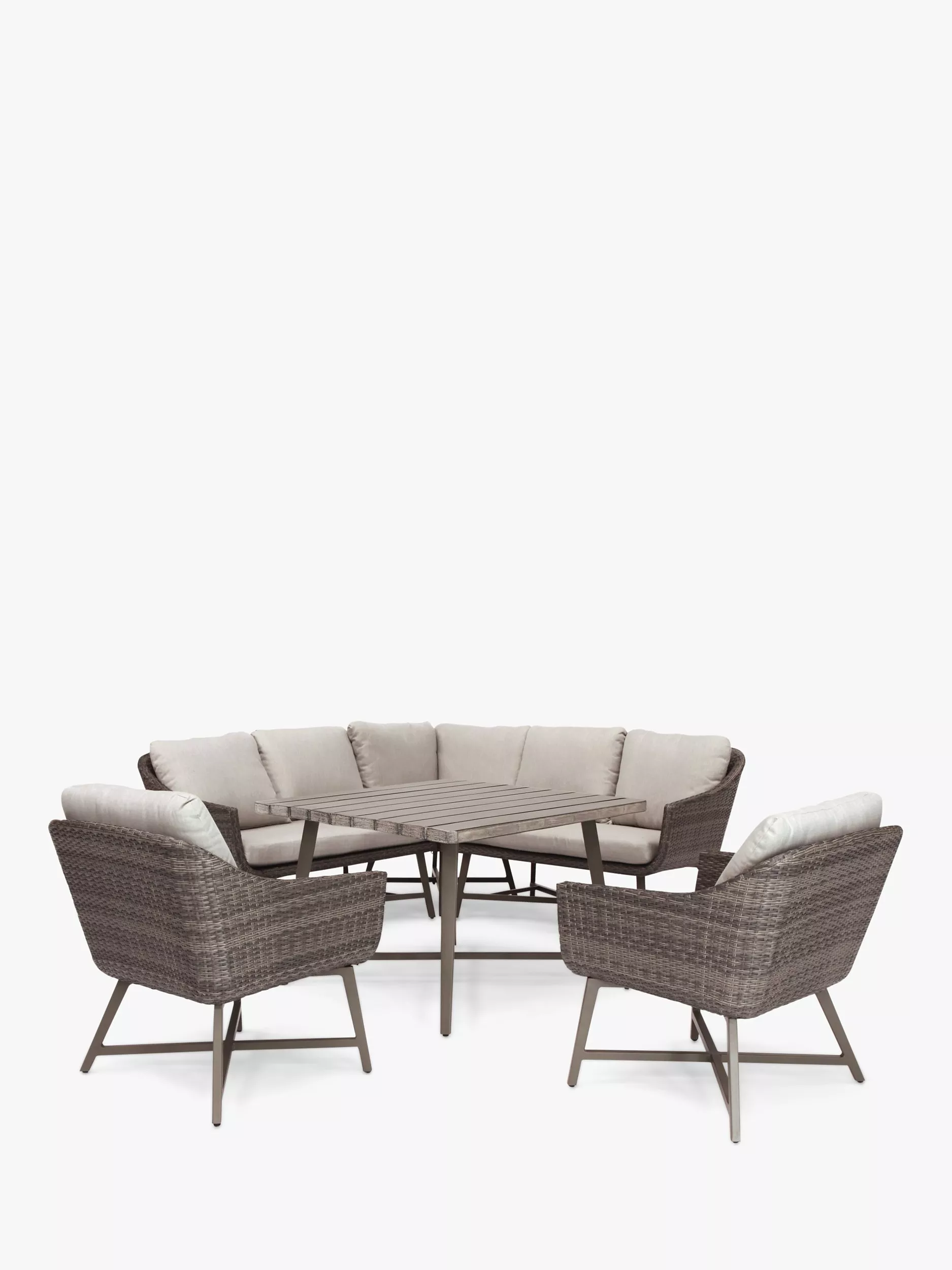 With its distinctive retro style and wicker finish, this seven-seater LaMode garden dining set from KETTLER provides a stylish way to relax outside or in the conservatory. The set includes a modular corner sofa set and two armchairs plus a table for casual dining.