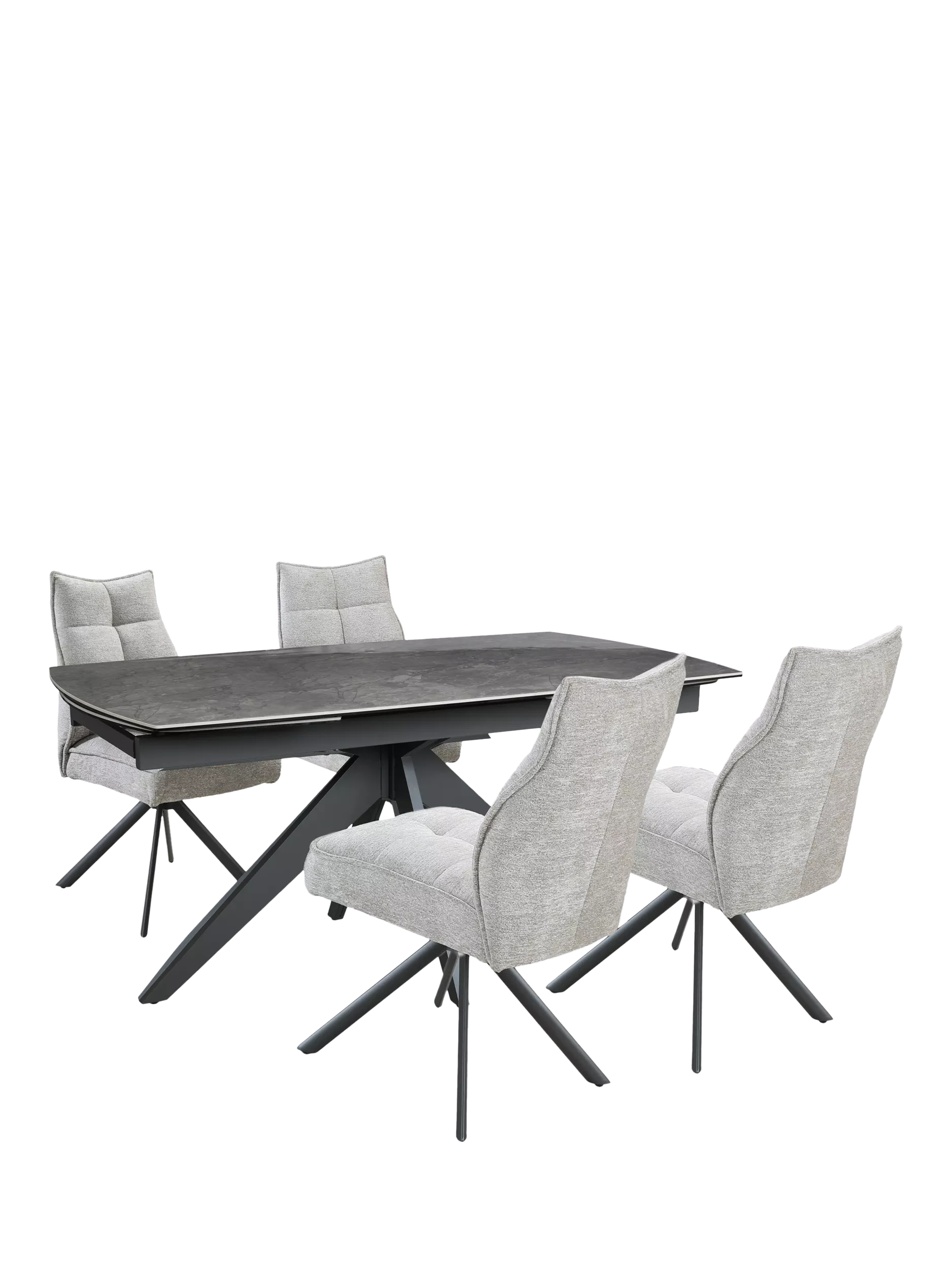 The included Rachel dining side chairs combine refined design with exceptional comfort, featuring 4cm pocket-sprung seats that offer a gentle bounce while retaining their shape over time. Ergonomically designed for relaxed dining, the chairs include a smooth 180-degree swivel with return and are upholstered in a durable, stain-resistant textured fabric—uniting practicality with effortless elegance.