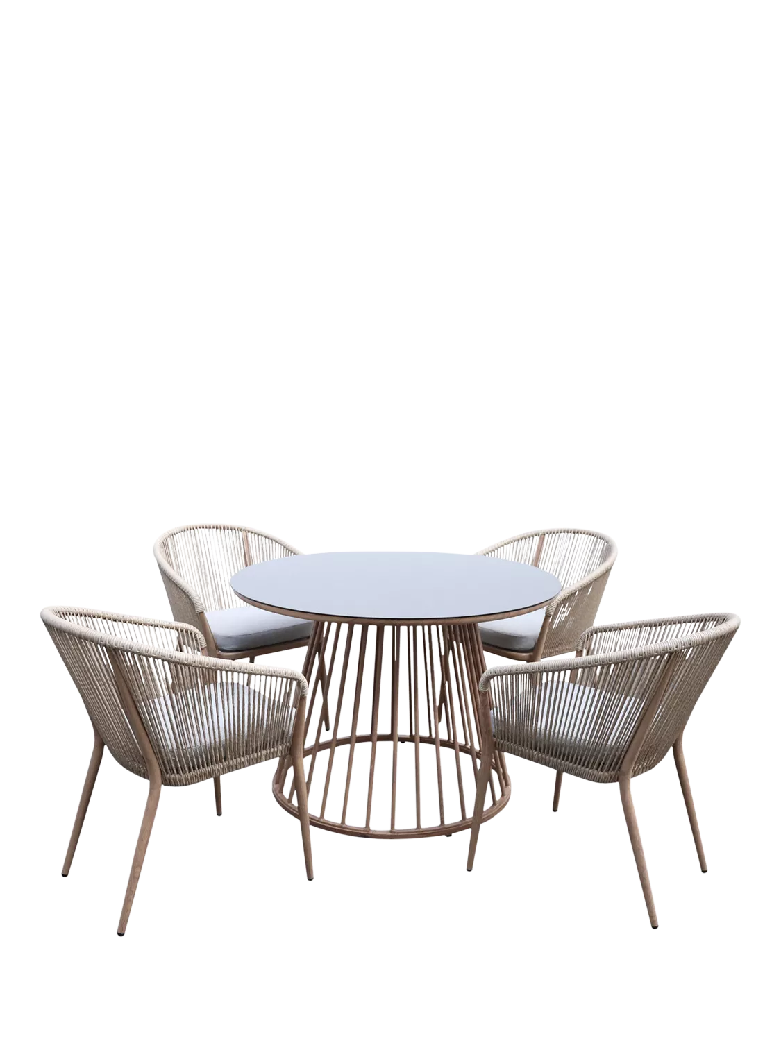 - Four garden dining chairs with rounded backs made of weather-resistant wicker rope