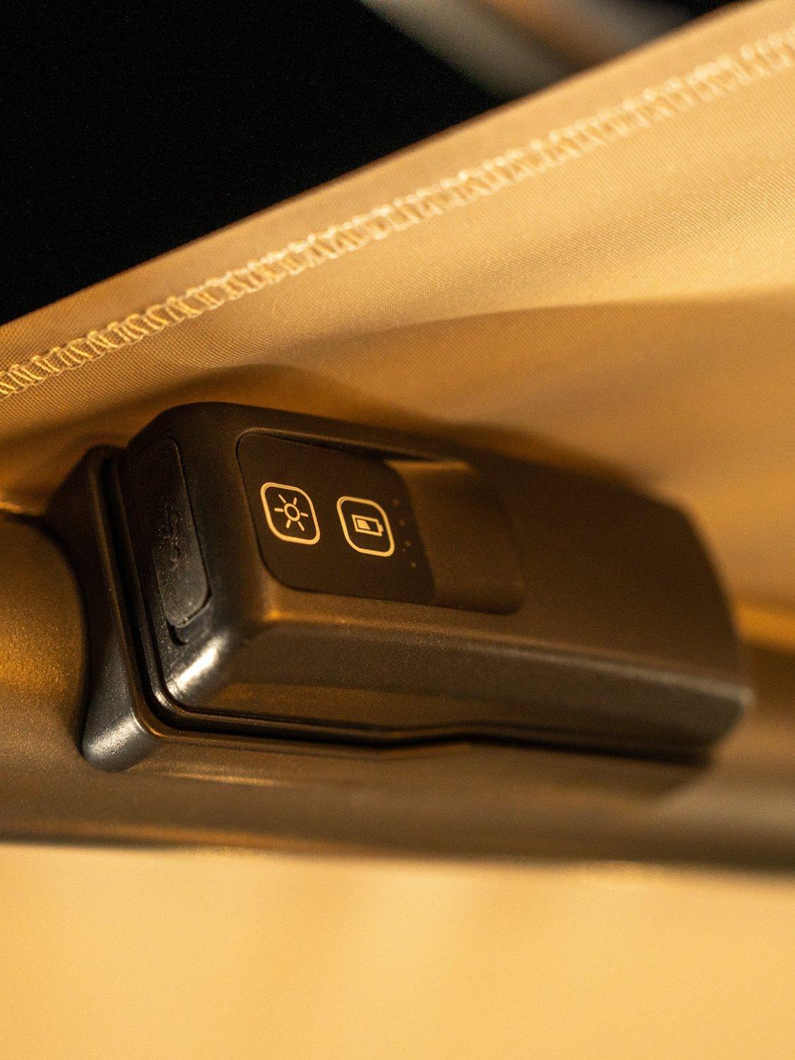 The robust aluminium frame supports a UV50+ removable canopy, and is enhanced with integrated star lights, powered by a rechargeable battery and a spare, complete with a charge-level display and the ability to charge your phone. Thoughtful quality touches include taped seams at the rib ends and convenient clips for hanging lights or decorations.