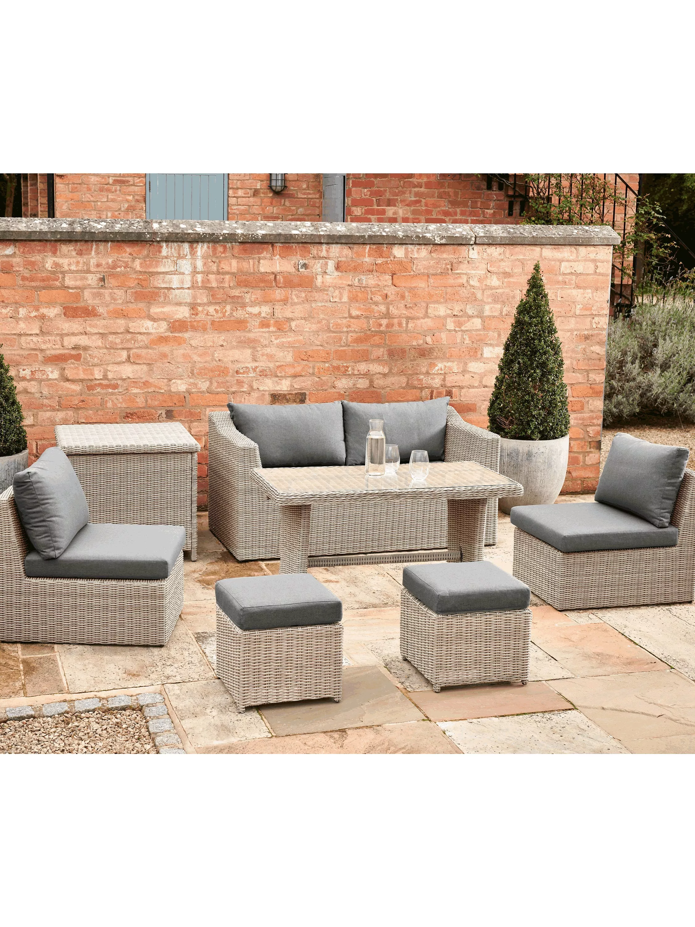 A Palma compact set for casual dining outdoors in smaller gardens, with seating for up to six people. This set includes two side chairs that stow under the two-seater sofa for compact storage. The set also includes a dining table with a glass top and two footstools. All the cushions can be stored in the included storage box. The flexible design means you can make it into a corner or traditional sofa set layout.